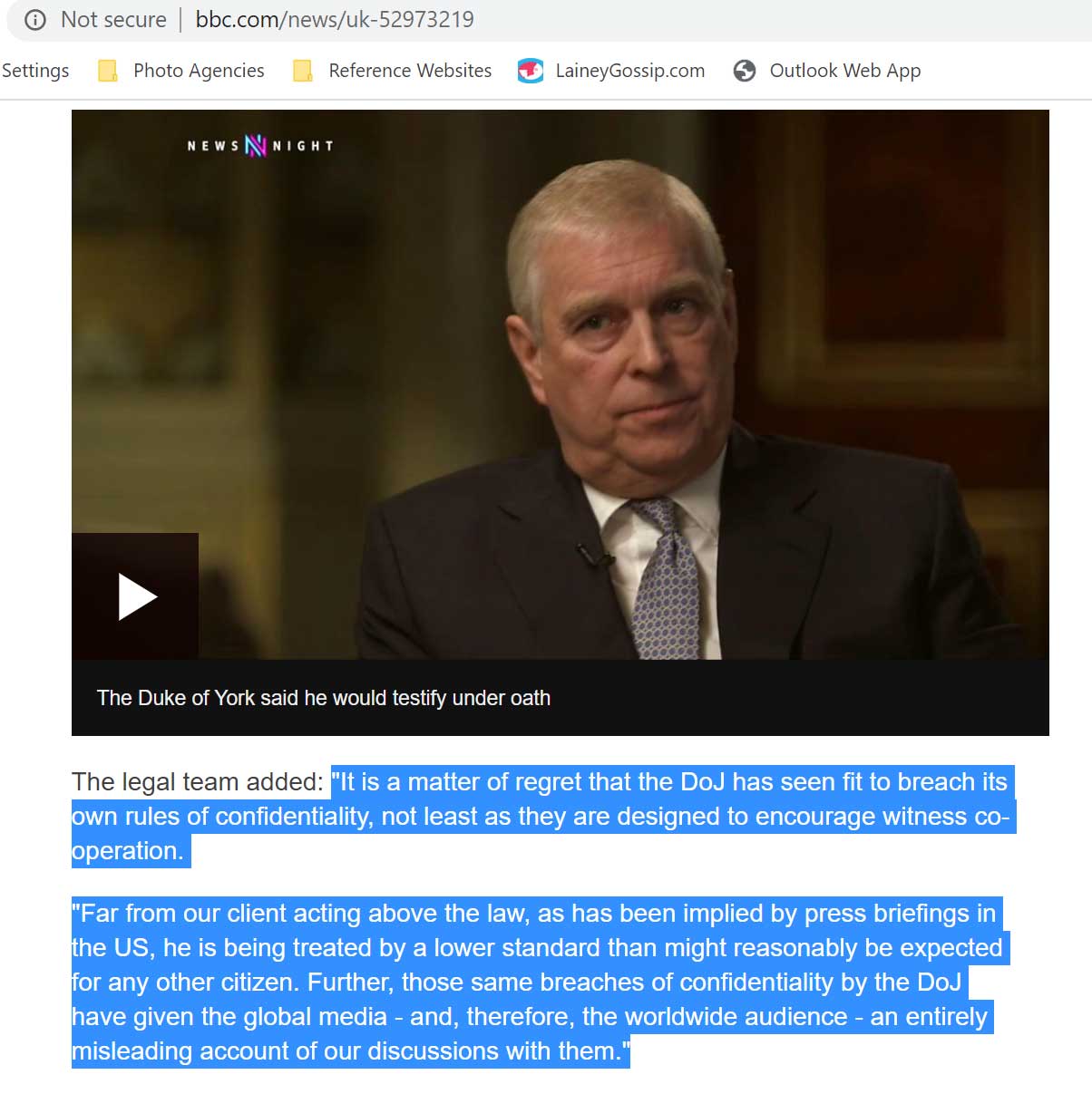 “The duke's lawyers said they had asked US prosecutors to confirm the co-operation would remain confidential, adding: "We were given an unequivocal assurance that our discussions and the interview process would remain confidential."