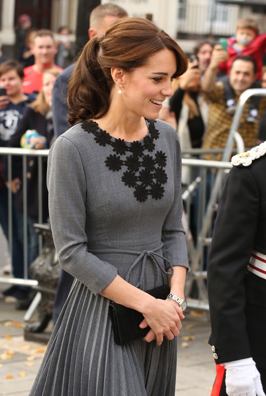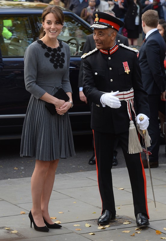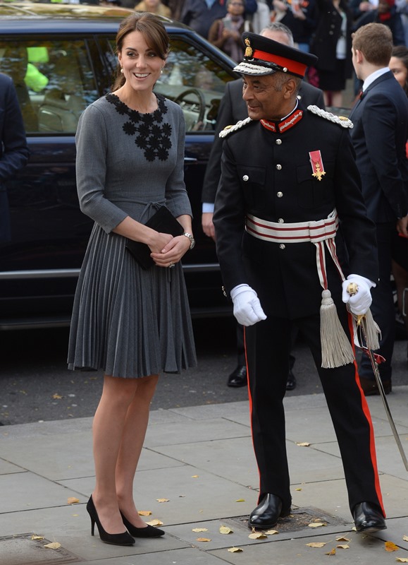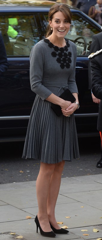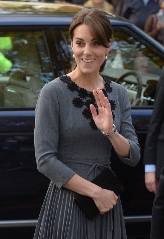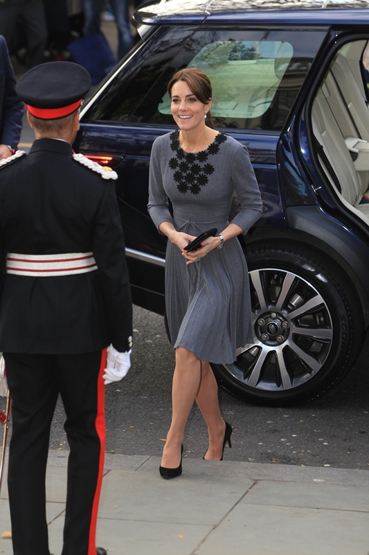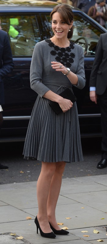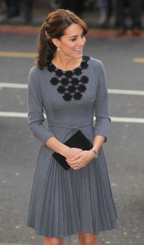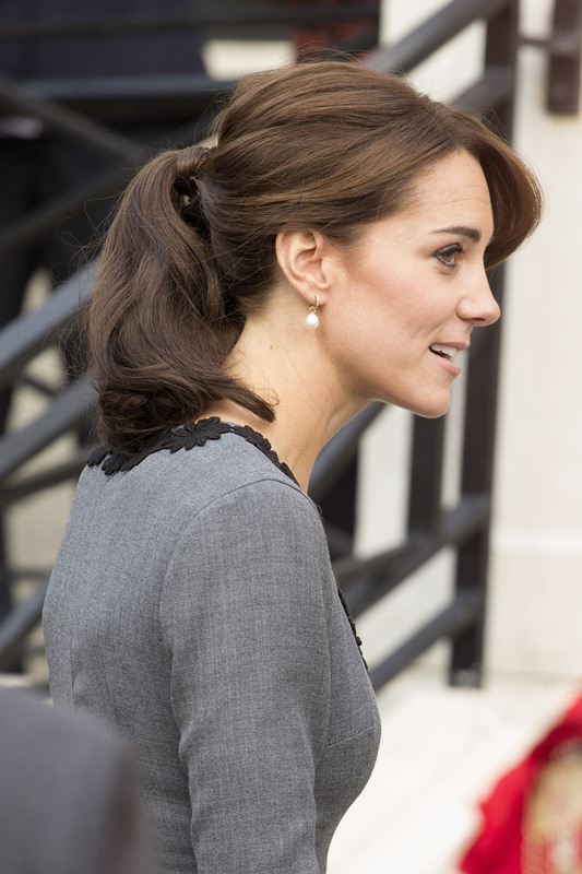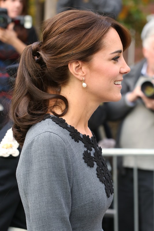 Anyway, after a full day of official engagements yesterday, including the Bond premiere, Kate was back out today touring a child mentoring programme in Islington. This, I think, is the same hair as last night, just with the loops taken out.