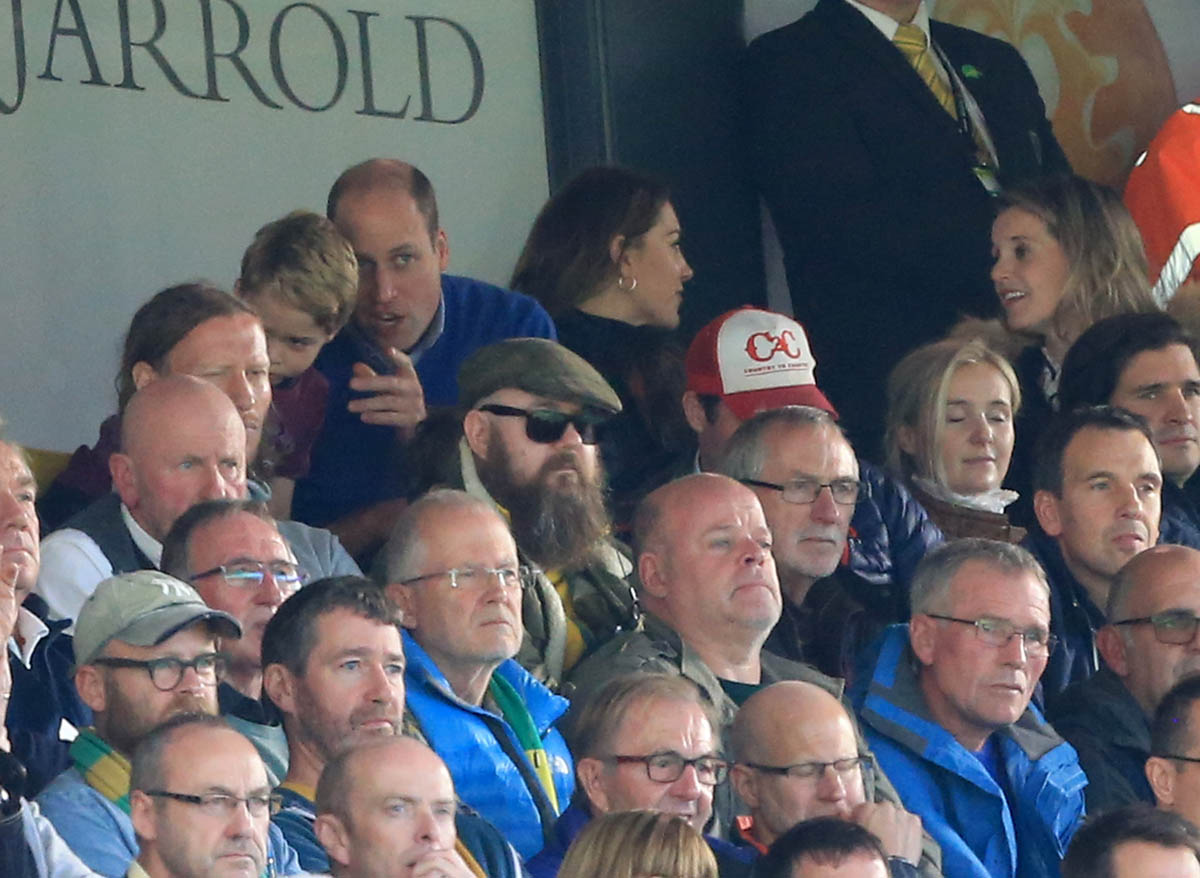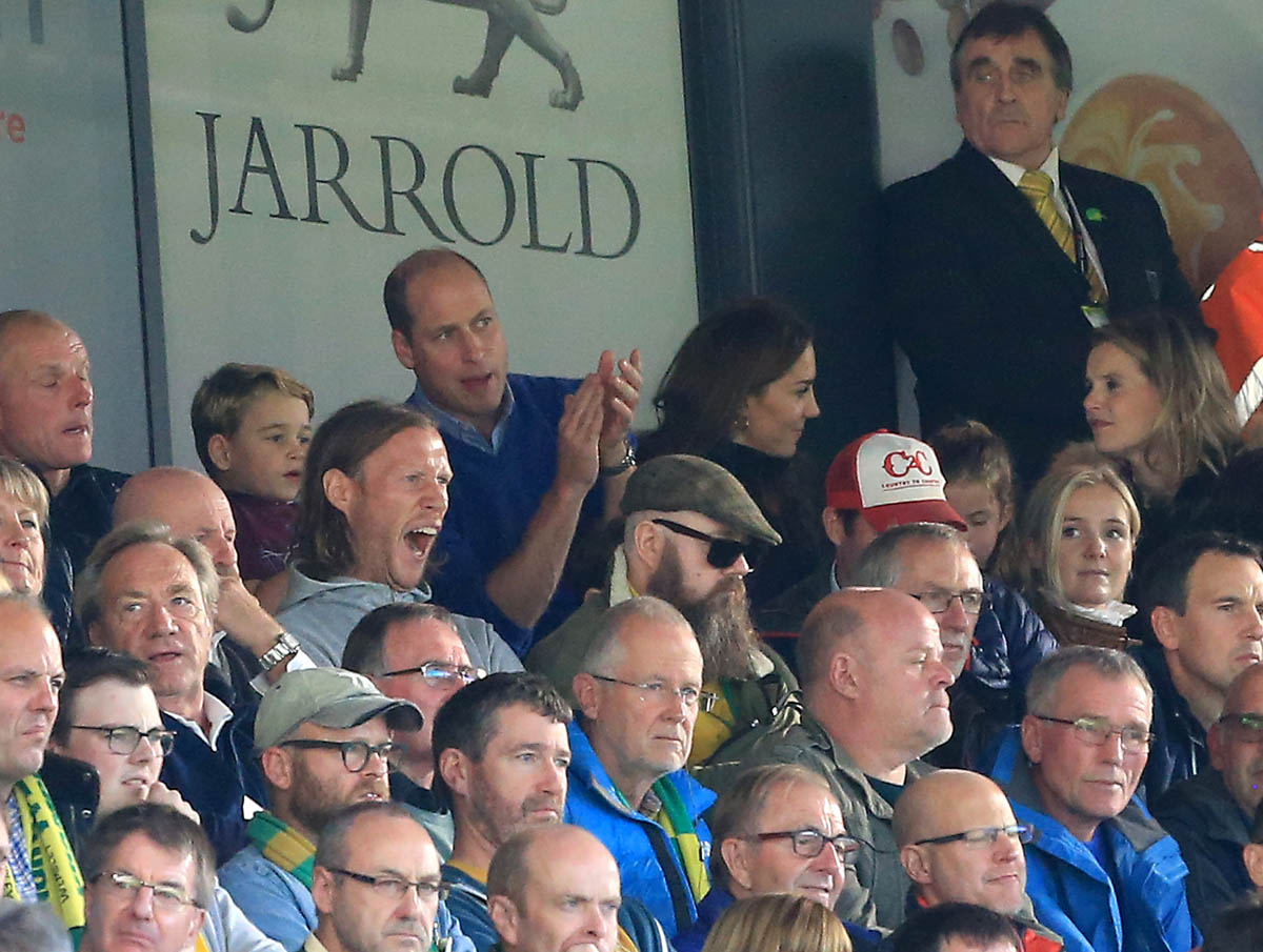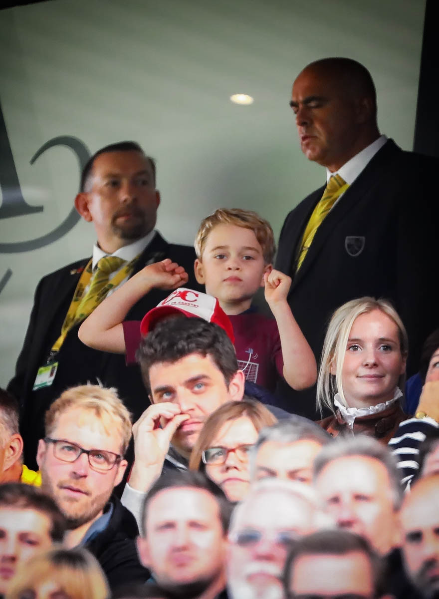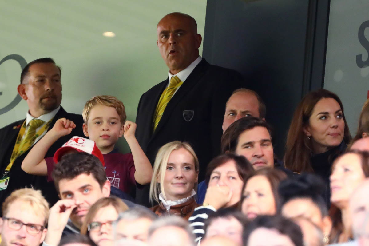But back to Big G – he was with Will, Kate, and Charlotte at the Aston Villa 5-1 win over Norwich on Saturday. Jesus, some of scores lately in soccer have been outrageous. Tottenham lost 7-2 last week against Bayern. I live with a Tottenham fan. I think there might be holes in our walls because of it. Anyway William has clearly passed his team loyalty onto his firstborn – check out Big G LOSING IT in the stands:
