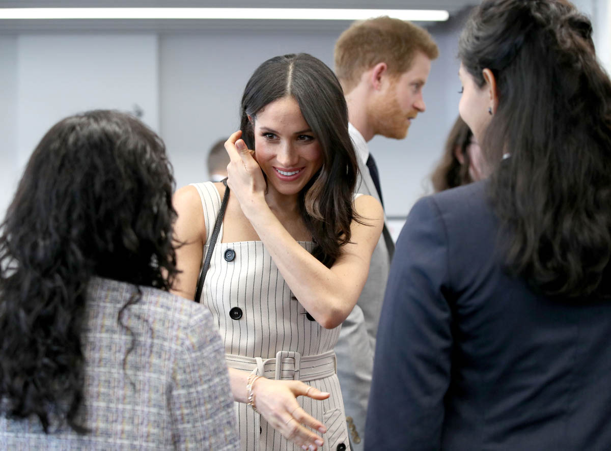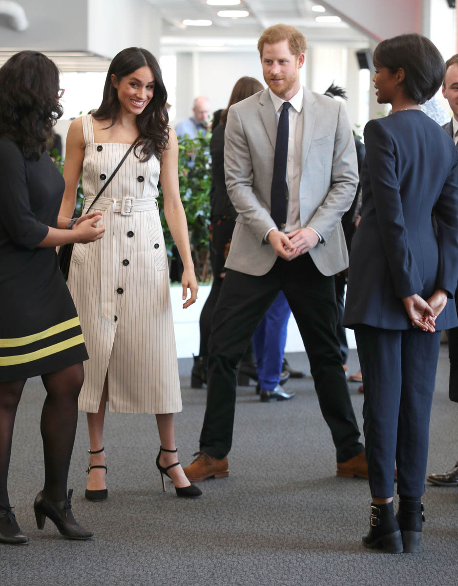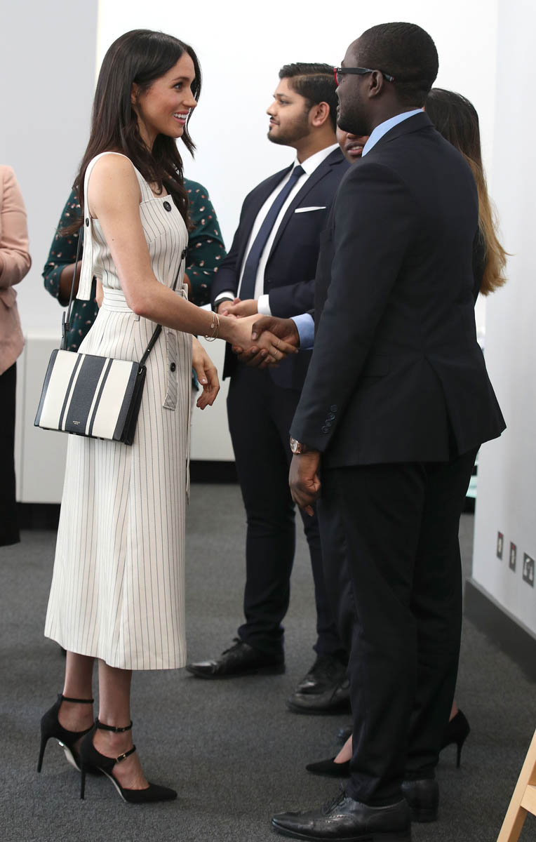 Why the jacket over the shoulders, especially when you know you’re going to be shaking hands with people non-stop? On practicality alone, I’m not feeling this outfit, although I appreciate the boldness of the shoulder-showing. Pearl-clutchy old-timers get really, really up their asses about women showing their shoulders, like it’s enough to incite an international crisis or something. I kinda love that Meghan is flouting that, intentional or not. Back to wearing the jacket over her shoulders though – in addition to the impracticality of it, it also doesn’t look that good either. The blazer isn’t falling neatly off her shoulders and it’s not creating any clean lines. If you want to wear the jacket, just WEAR the damn jacket, you know?