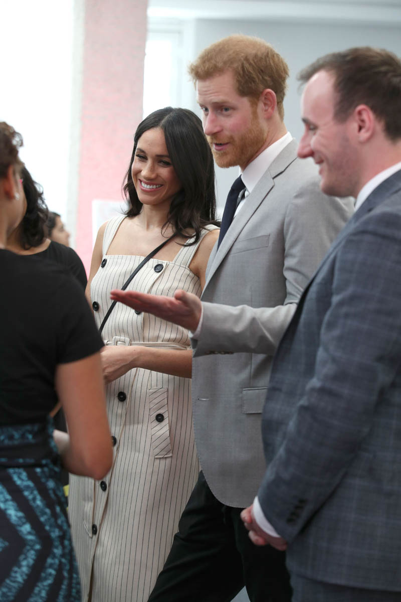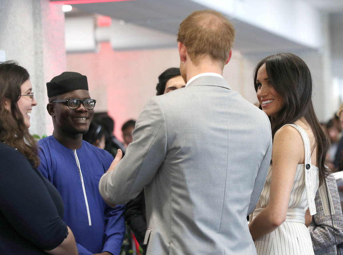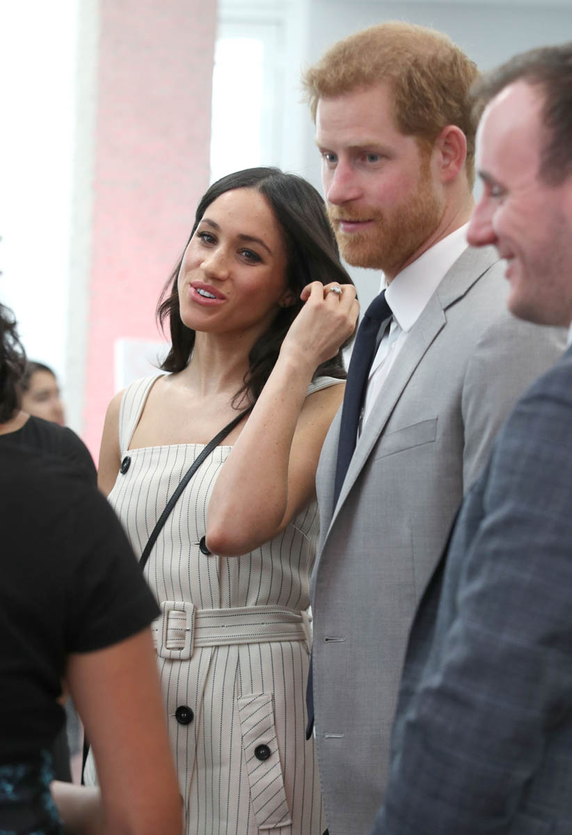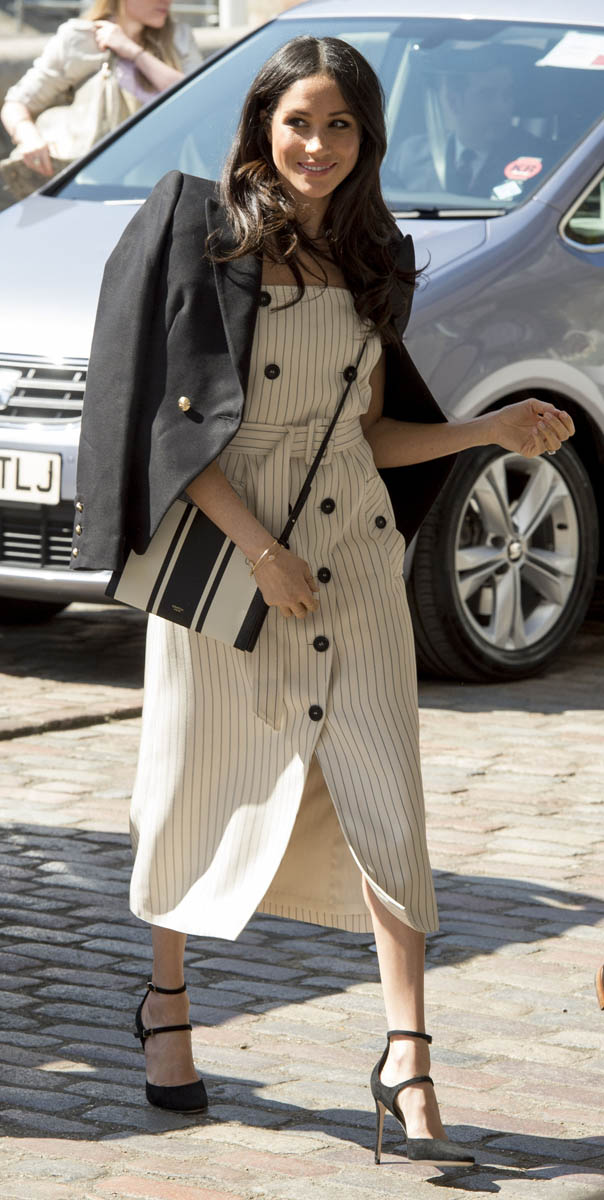Why the jacket over the shoulders, especially when you know you’re going to be shaking hands with people non-stop? On practicality alone, I’m not feeling this outfit, although I appreciate the boldness of the shoulder-showing. Pearl-clutchy old-timers get really, really up their asses about women showing their shoulders, like it’s enough to incite an international crisis or something. I kinda love that Meghan is flouting that, intentional or not. Back to wearing the jacket over her shoulders though – in addition to the impracticality of it, it also doesn’t look that good either. The blazer isn’t falling neatly off her shoulders and it’s not creating any clean lines. If you want to wear the jacket, just WEAR the damn jacket, you know?