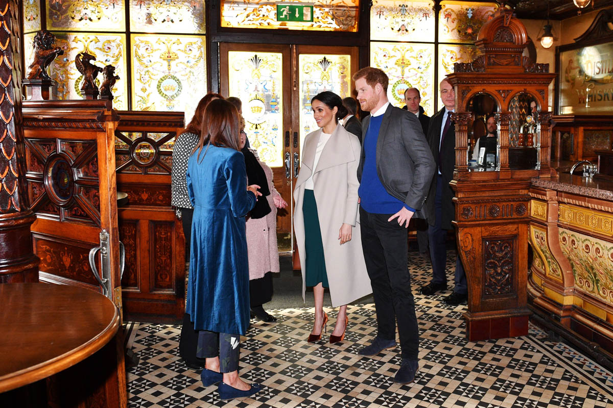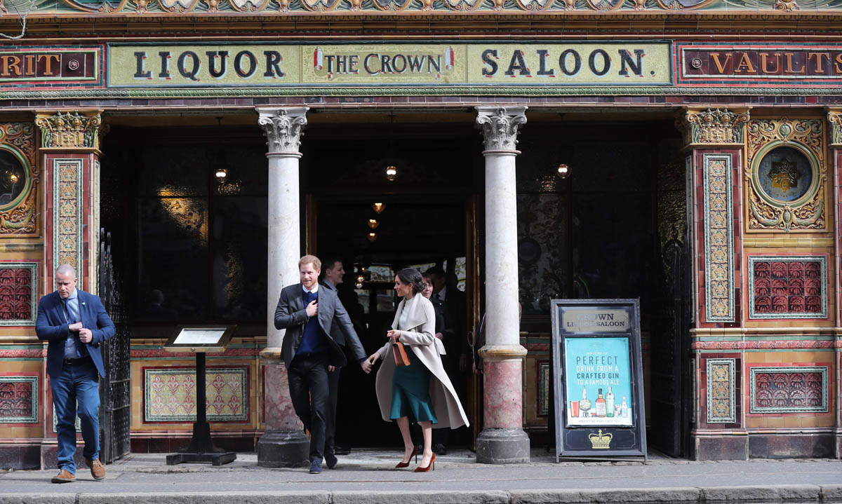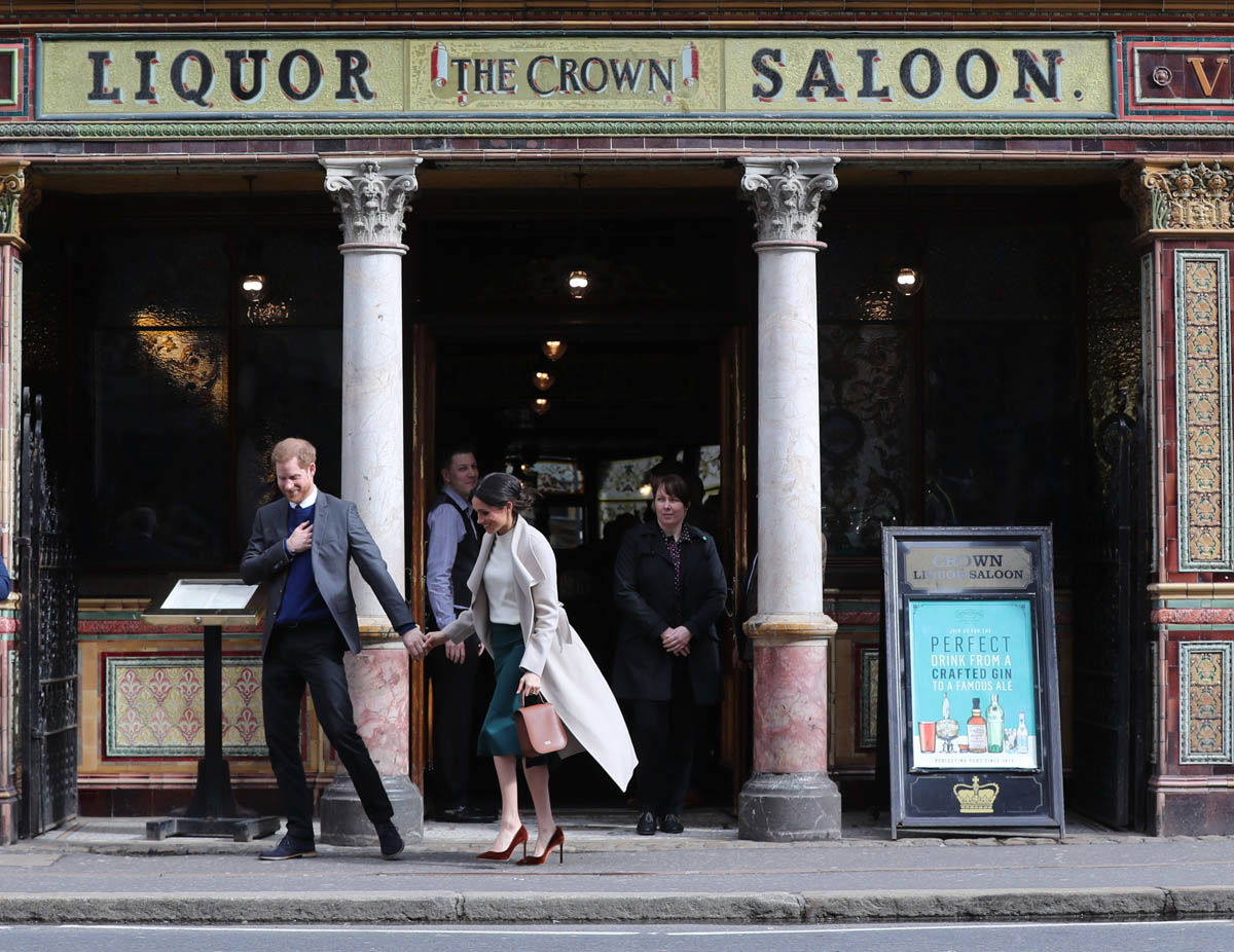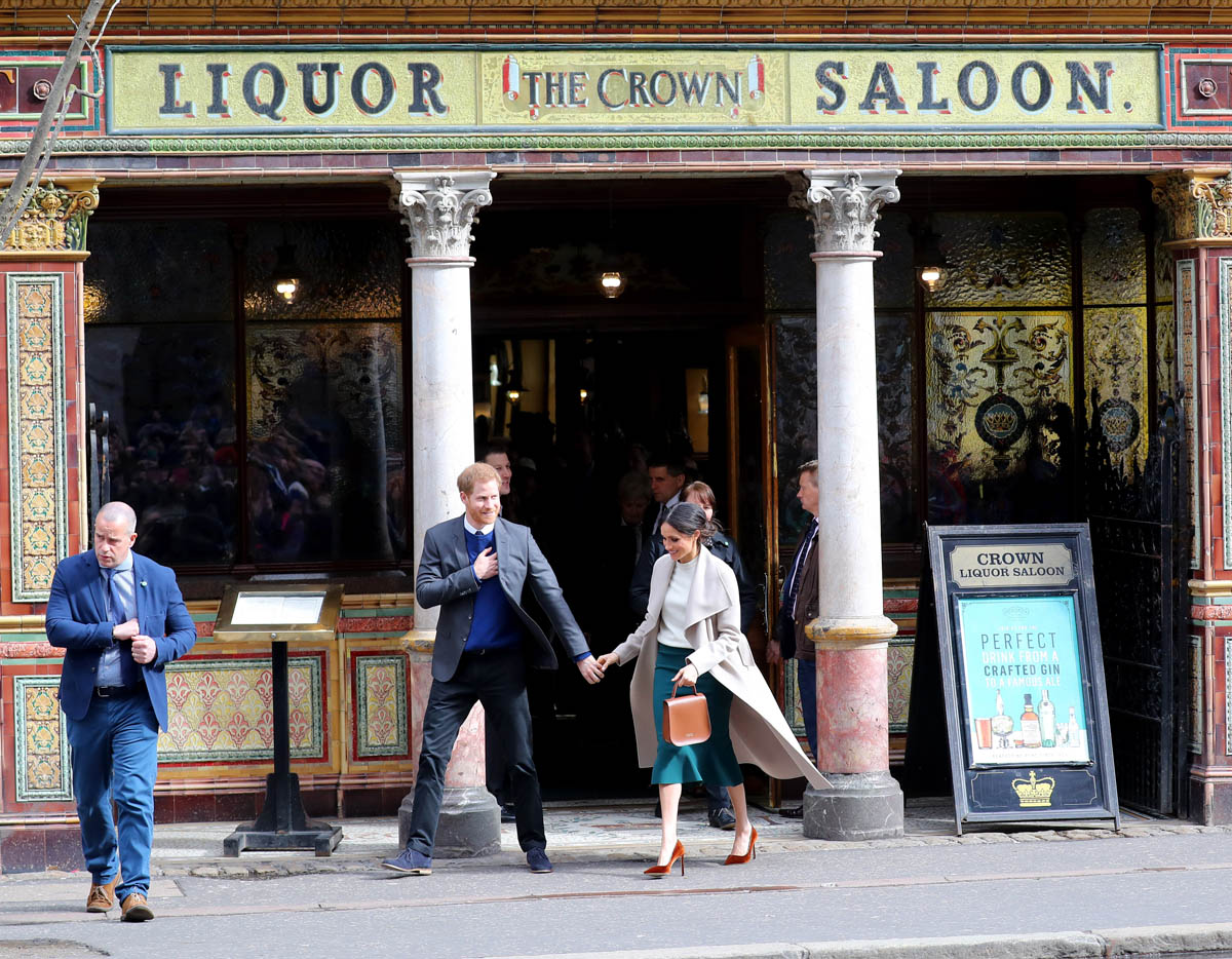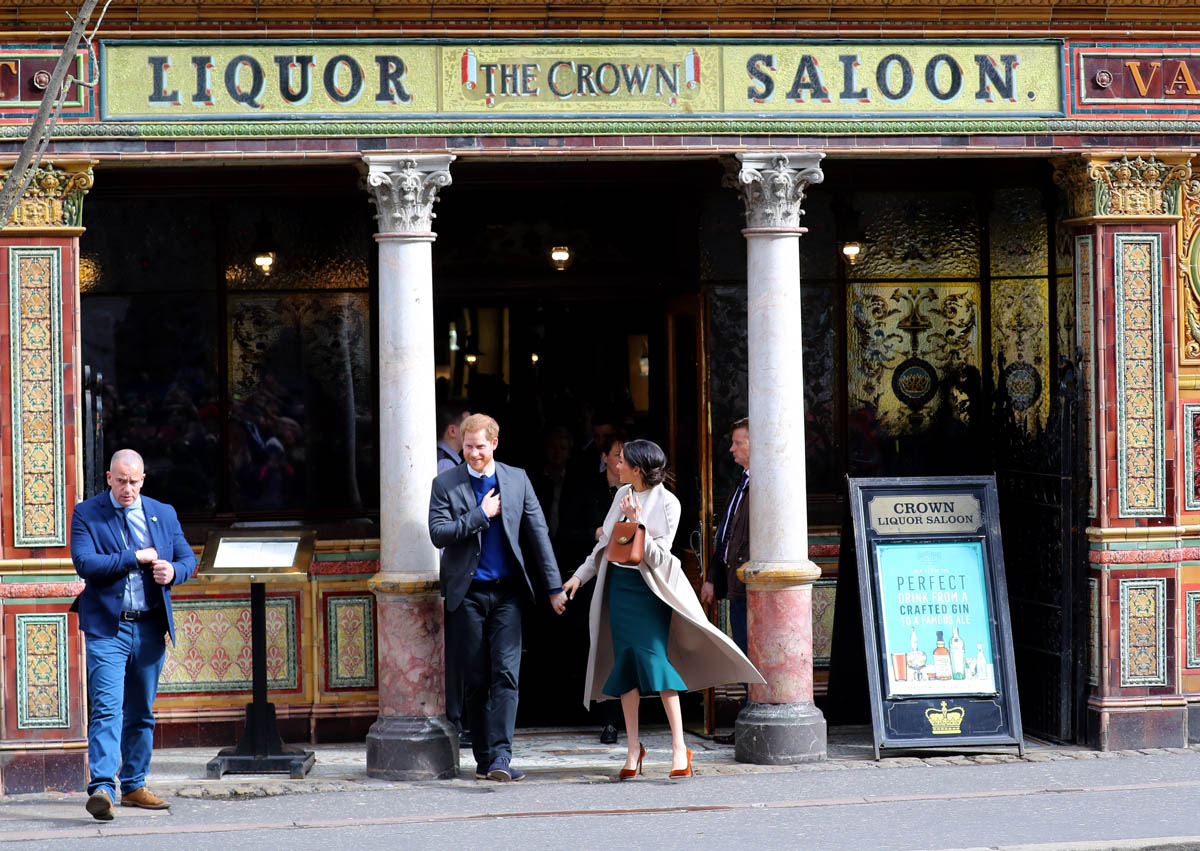 Harry and Meghan leave to meet locals during a walkabout outside the @CrownBarBelfast🙋🏼♂️🙋🏻♀️ pic.twitter.com/O73G2pq8Ii— Omid Scobie (@scobie) March 23, 2018