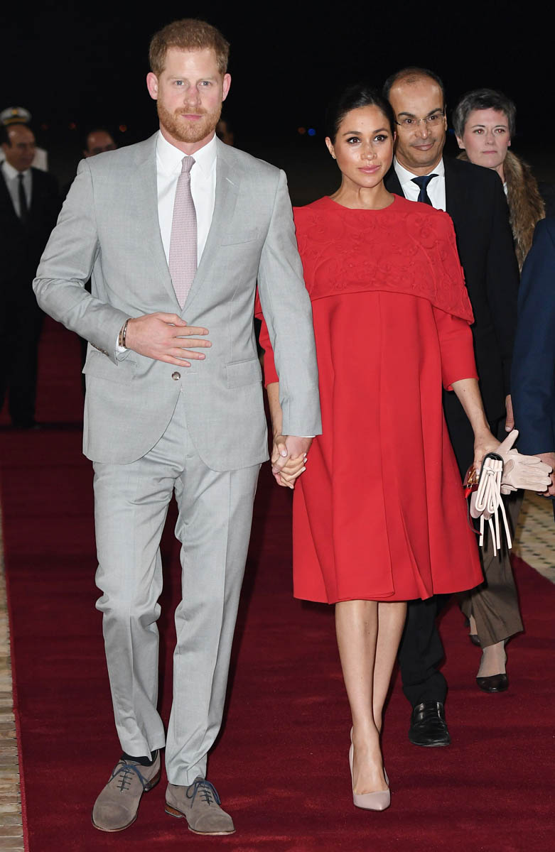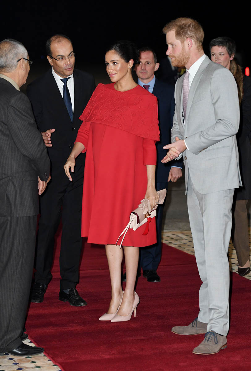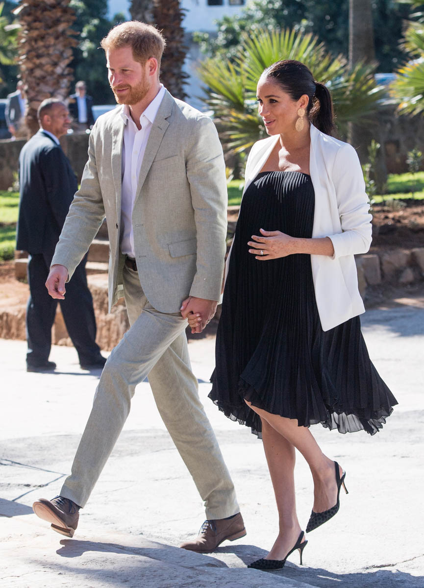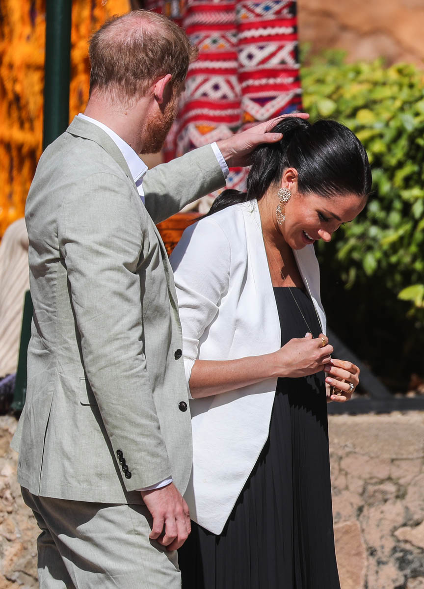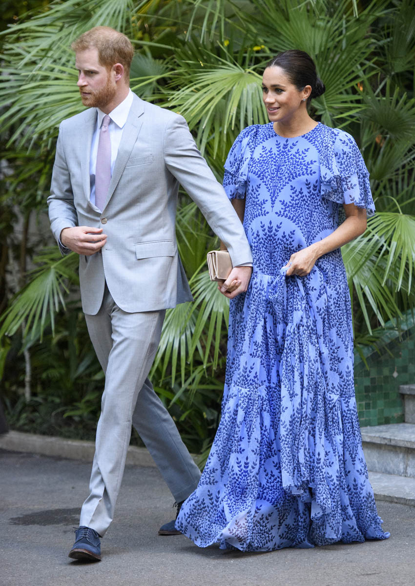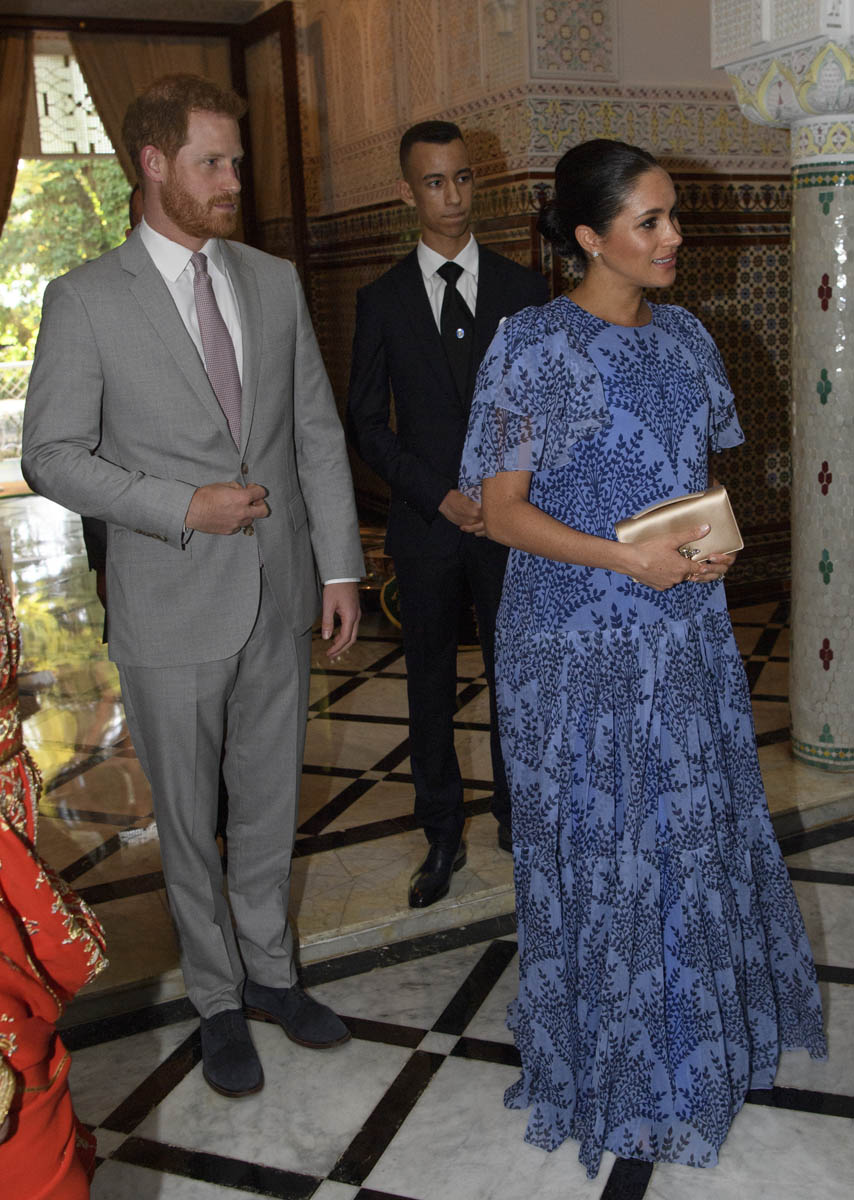 Yesterday, to conclude their visit, Harry and Meghan were invited to meet with the King of Morocco, Mohammed VI and his family. She wore a loose blue Carolina Herrera dress with flutter sleeves – great colour on her, great print, she looks pretty, probably one of her best outfits in a while. It was a busy day with a lot of wardrobe changes as they made several stops – a selection of photos is attached below. As you can see, the aggressive belly-cupping continues, and the signature Sussex PDA was in full effect all weekend as they were as affectionate and tactile with each other as they’ve ever been, always staying close, looking at each other often, giggling together often, warmly receiving well-wishes about the pregnancy –and joking about it too, at the 50 second mark: