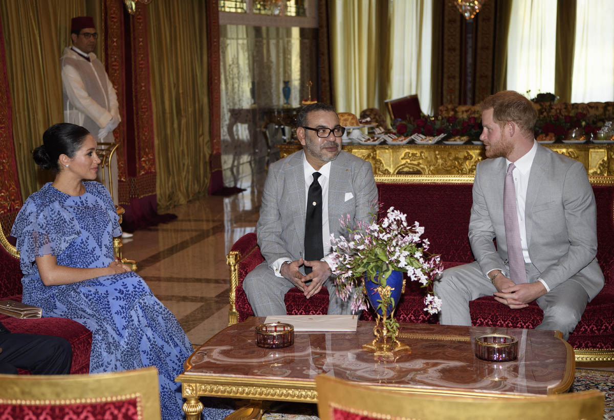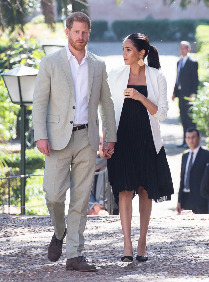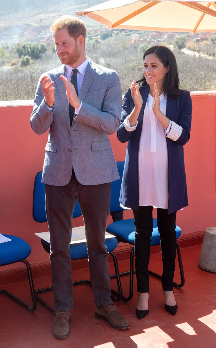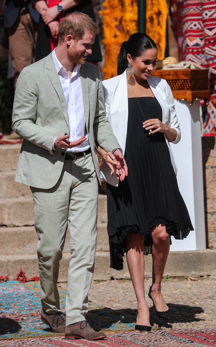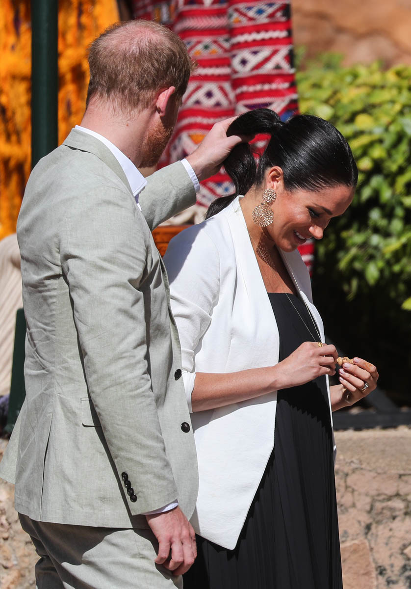 Yesterday, to conclude their visit, Harry and Meghan were invited to meet with the King of Morocco, Mohammed VI and his family. She wore a loose blue Carolina Herrera dress with flutter sleeves – great colour on her, great print, she looks pretty, probably one of her best outfits in a while. It was a busy day with a lot of wardrobe changes as they made several stops – a selection of photos is attached below. As you can see, the aggressive belly-cupping continues, and the signature Sussex PDA was in full effect all weekend as they were as affectionate and tactile with each other as they’ve ever been, always staying close, looking at each other often, giggling together often, warmly receiving well-wishes about the pregnancy –and joking about it too, at the 50 second mark: