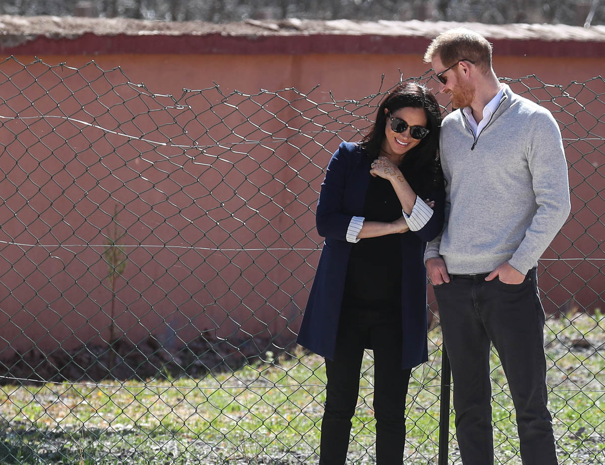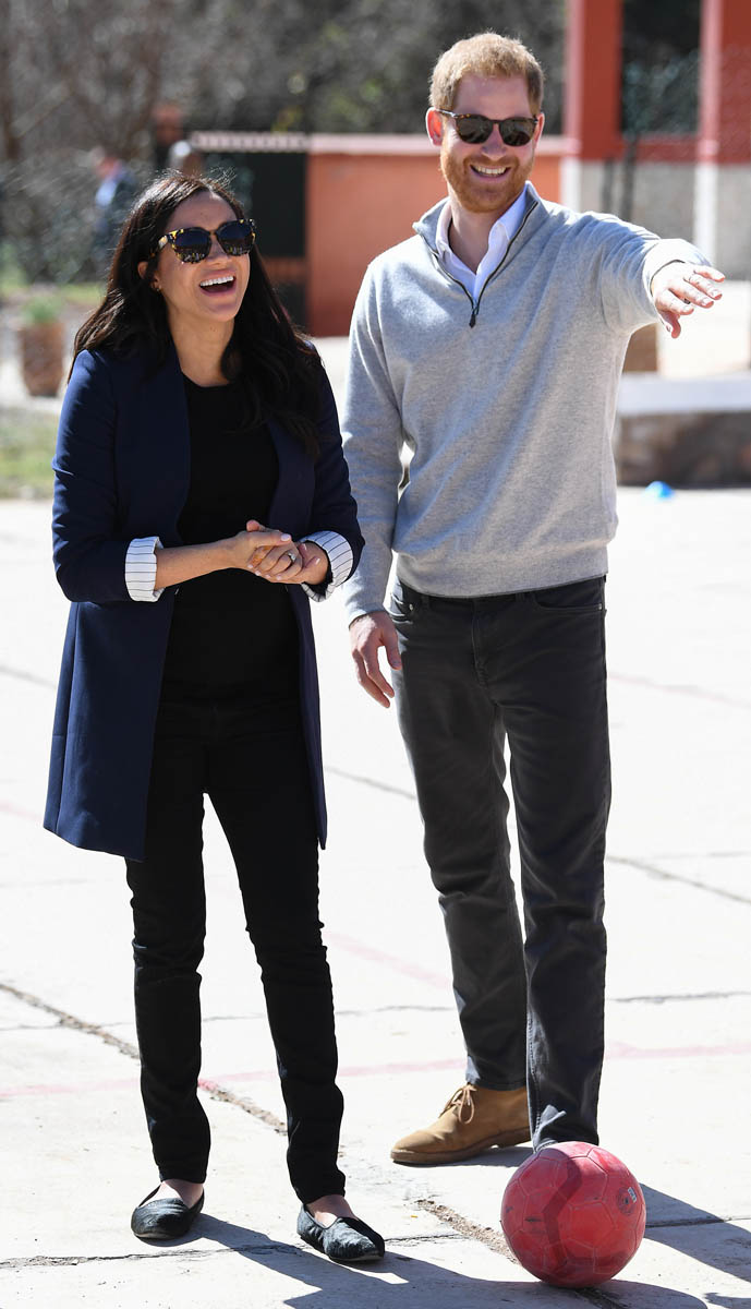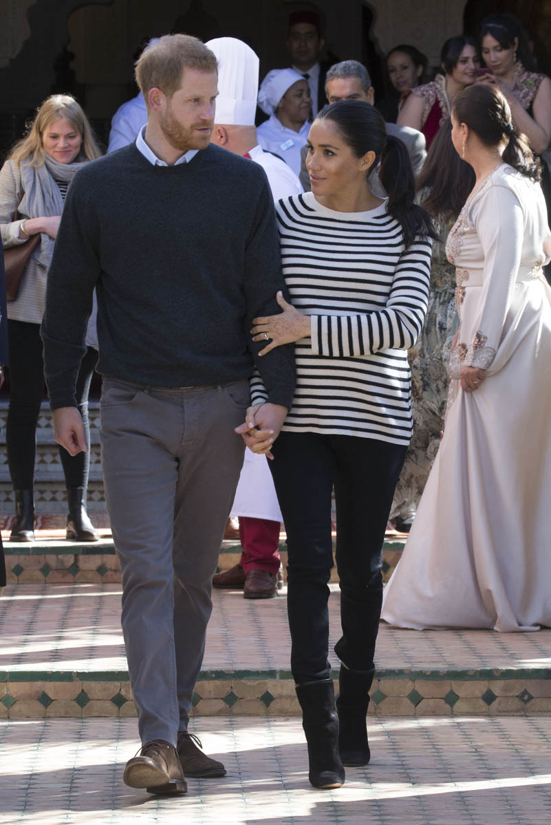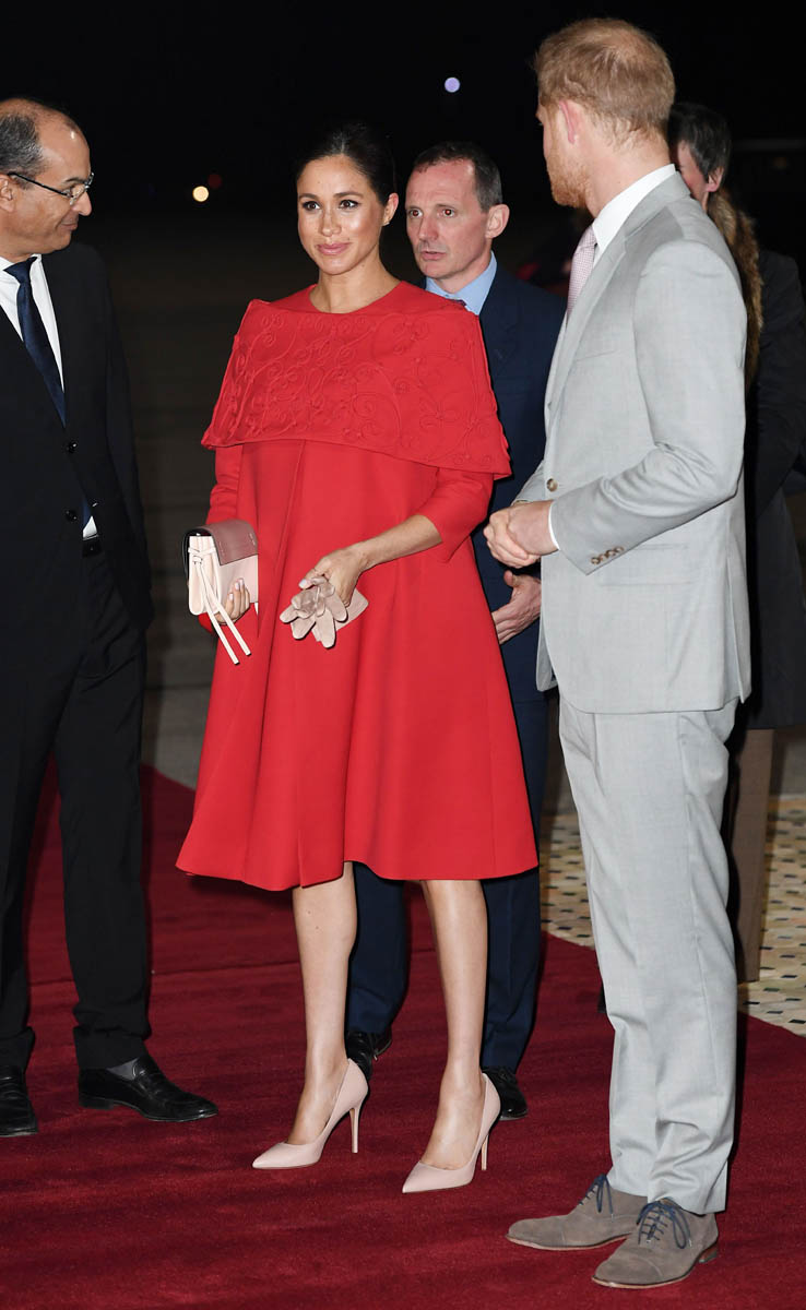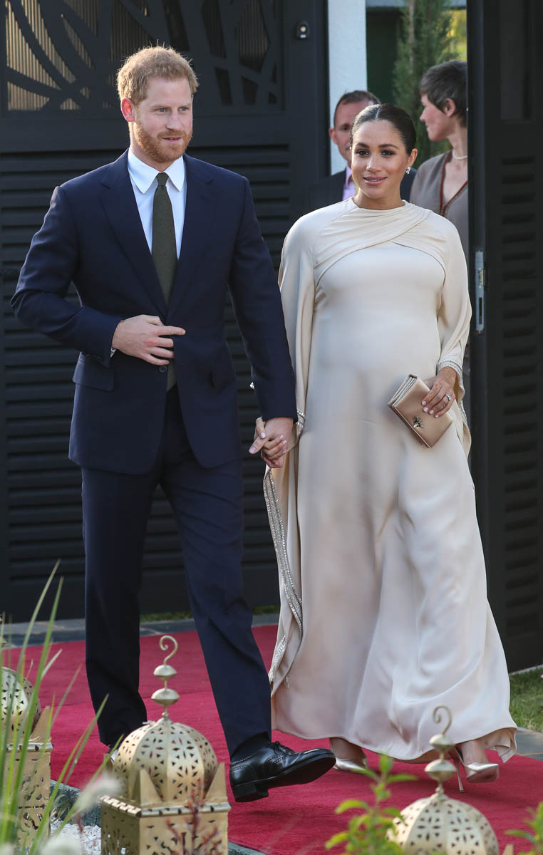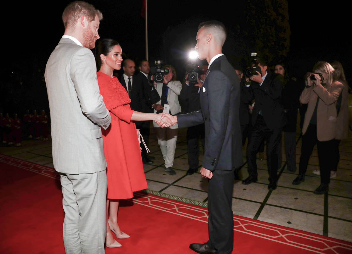 Yesterday, to conclude their visit, Harry and Meghan were invited to meet with the King of Morocco, Mohammed VI and his family. She wore a loose blue Carolina Herrera dress with flutter sleeves – great colour on her, great print, she looks pretty, probably one of her best outfits in a while. It was a busy day with a lot of wardrobe changes as they made several stops – a selection of photos is attached below. As you can see, the aggressive belly-cupping continues, and the signature Sussex PDA was in full effect all weekend as they were as affectionate and tactile with each other as they’ve ever been, always staying close, looking at each other often, giggling together often, warmly receiving well-wishes about the pregnancy –and joking about it too, at the 50 second mark: