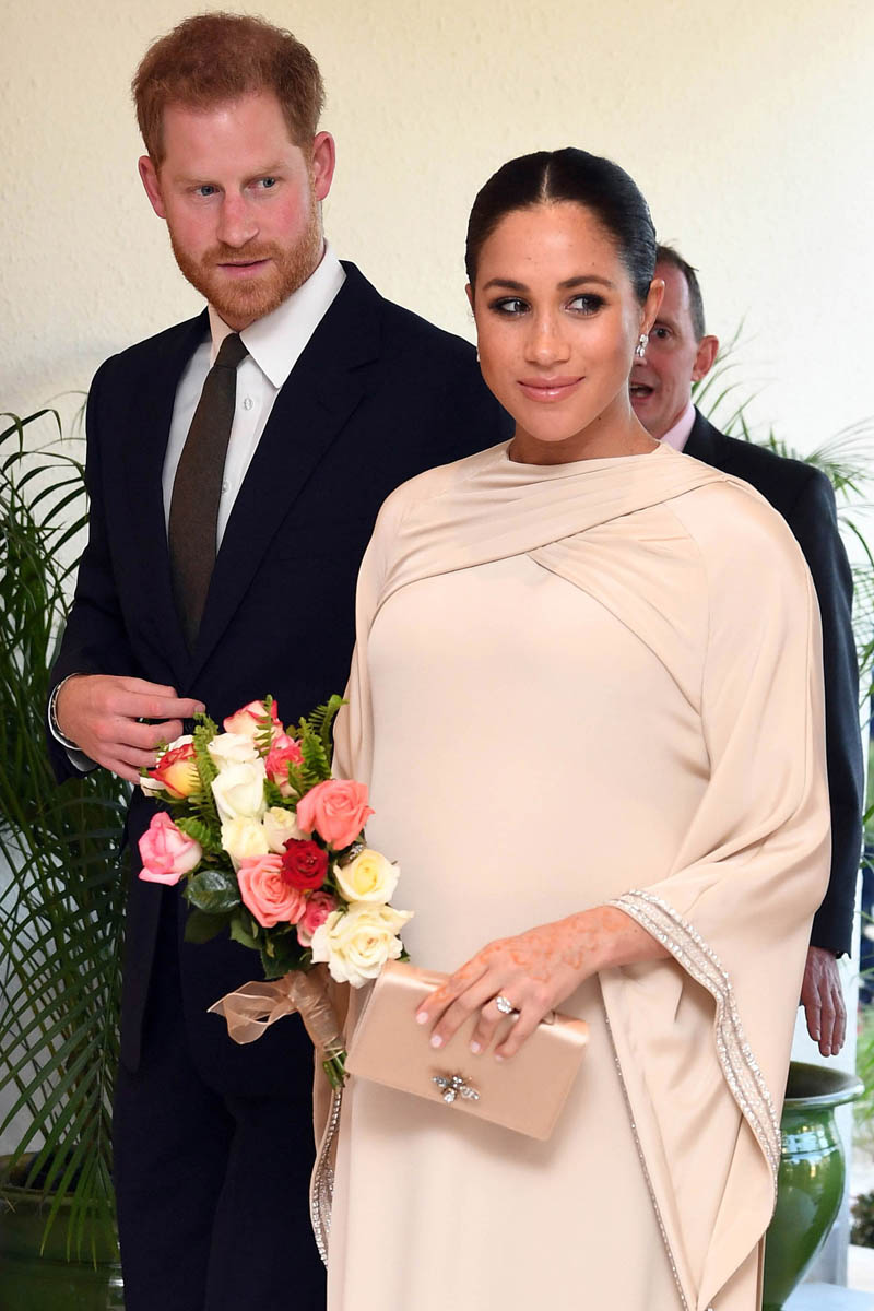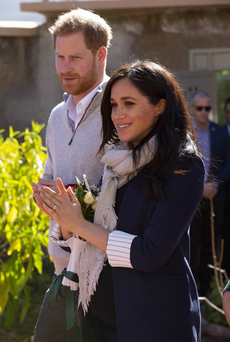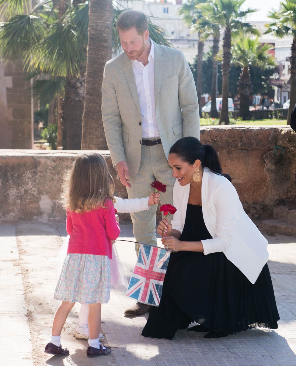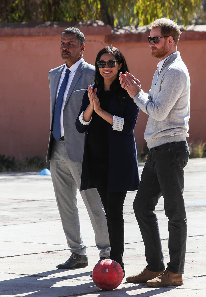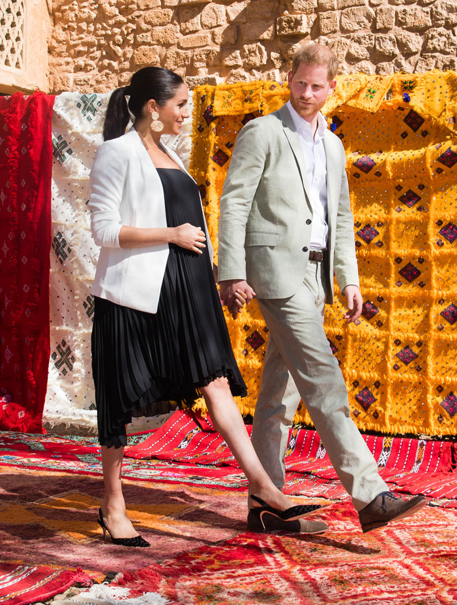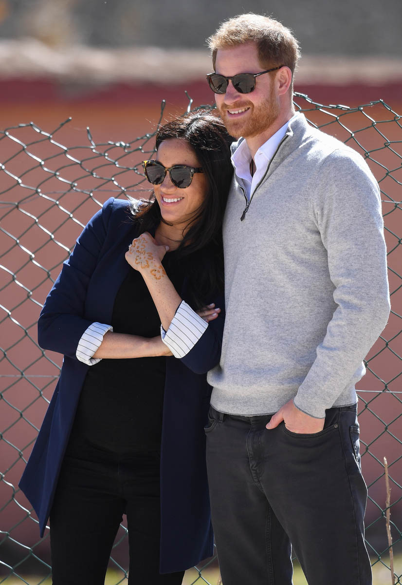 Yesterday, to conclude their visit, Harry and Meghan were invited to meet with the King of Morocco, Mohammed VI and his family. She wore a loose blue Carolina Herrera dress with flutter sleeves – great colour on her, great print, she looks pretty, probably one of her best outfits in a while. It was a busy day with a lot of wardrobe changes as they made several stops – a selection of photos is attached below. As you can see, the aggressive belly-cupping continues, and the signature Sussex PDA was in full effect all weekend as they were as affectionate and tactile with each other as they’ve ever been, always staying close, looking at each other often, giggling together often, warmly receiving well-wishes about the pregnancy –and joking about it too, at the 50 second mark: