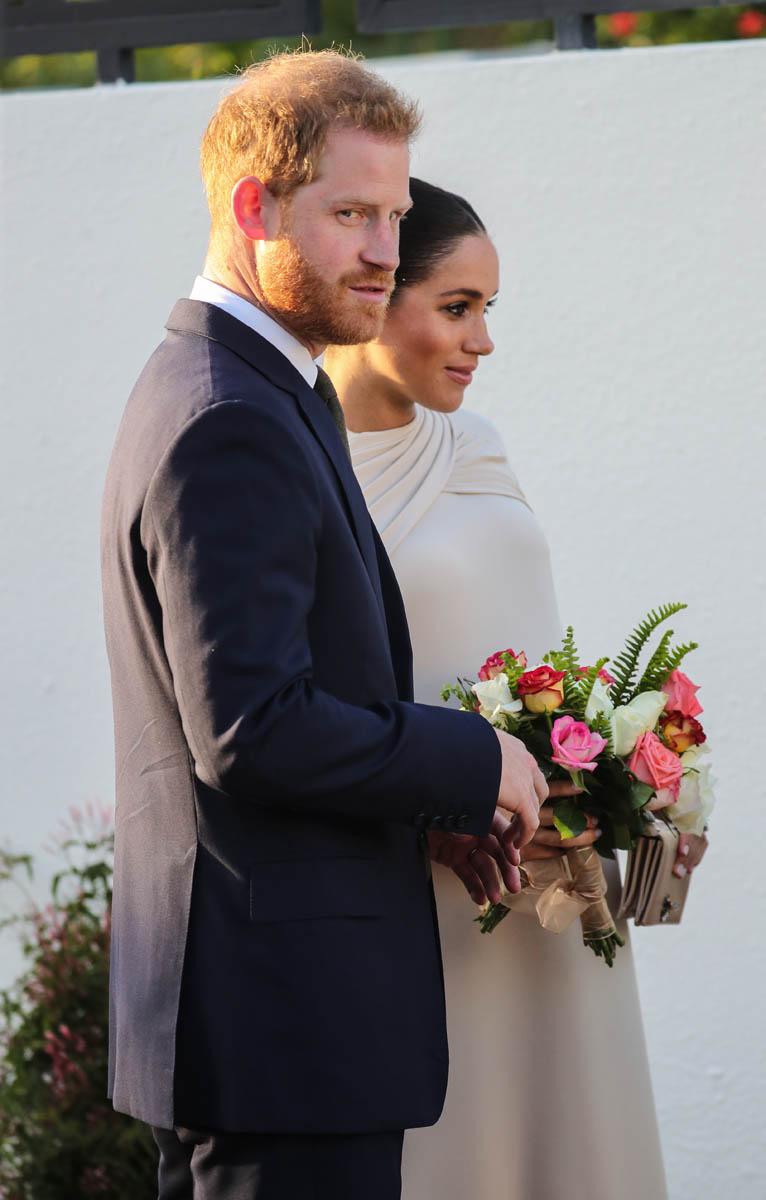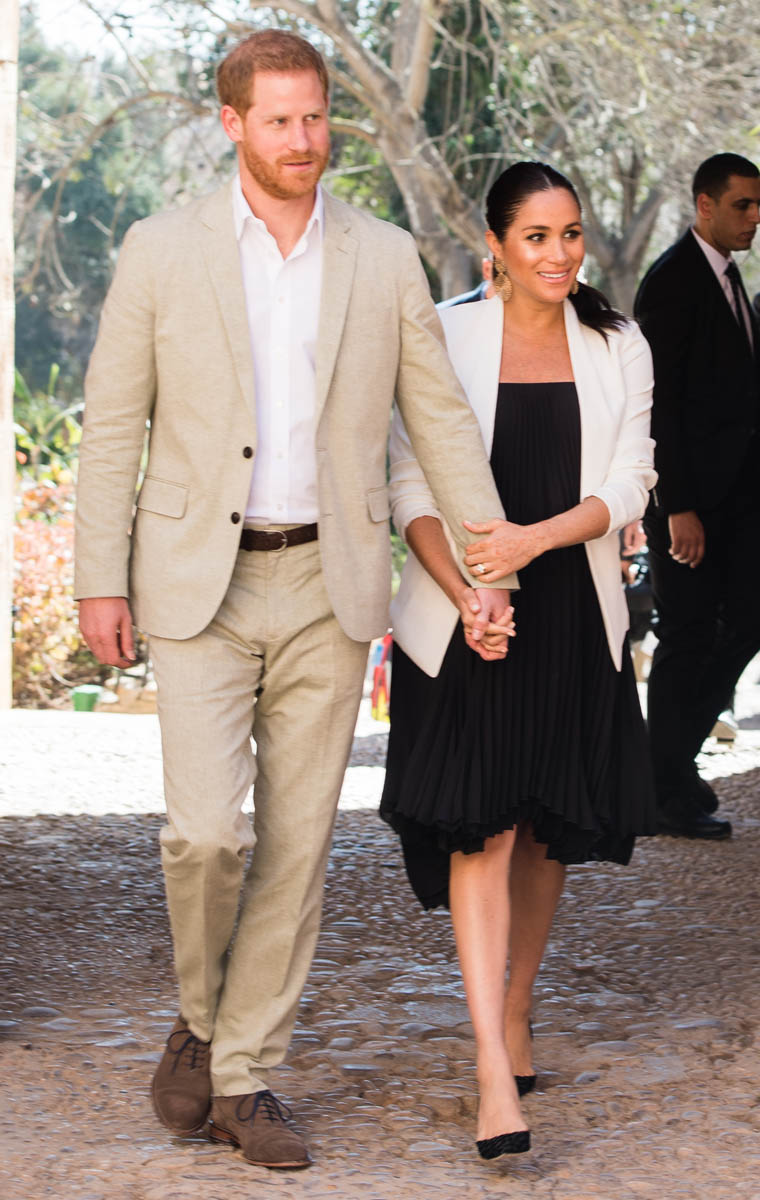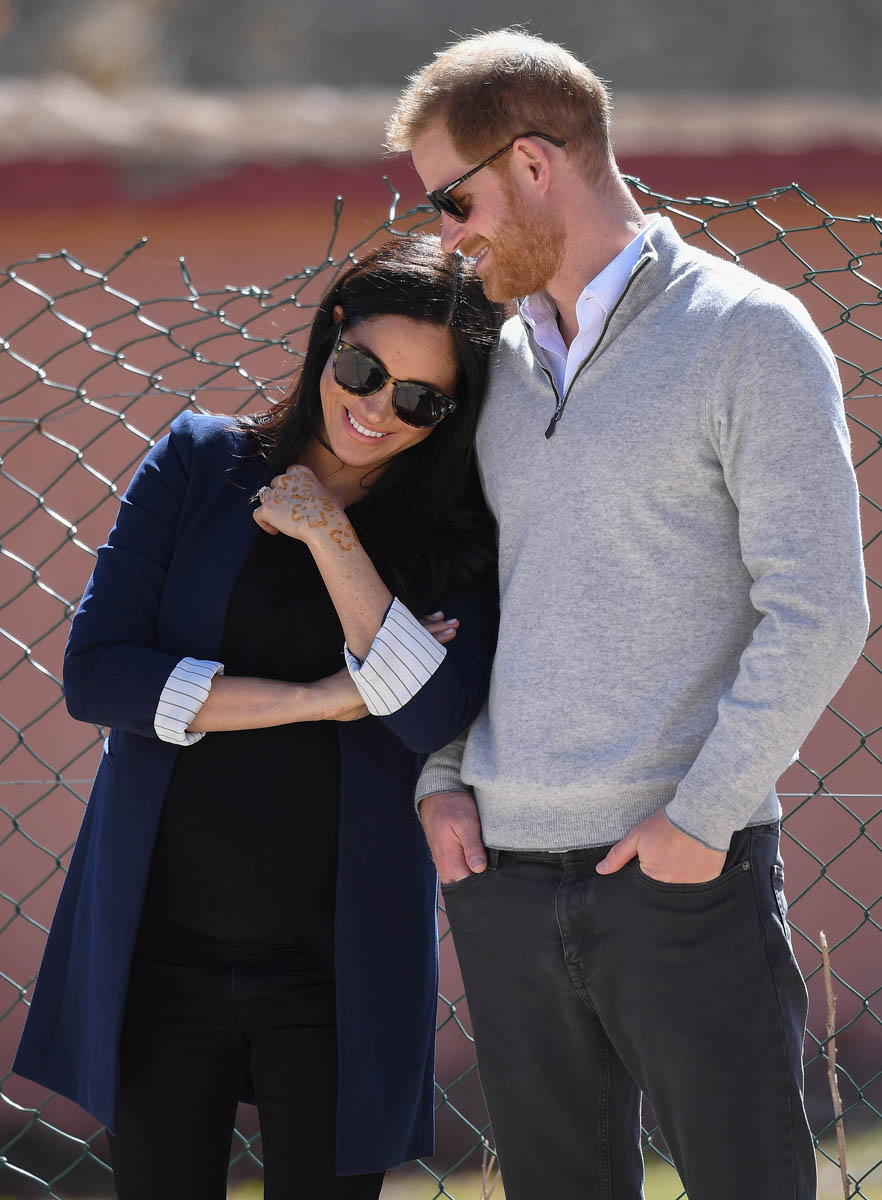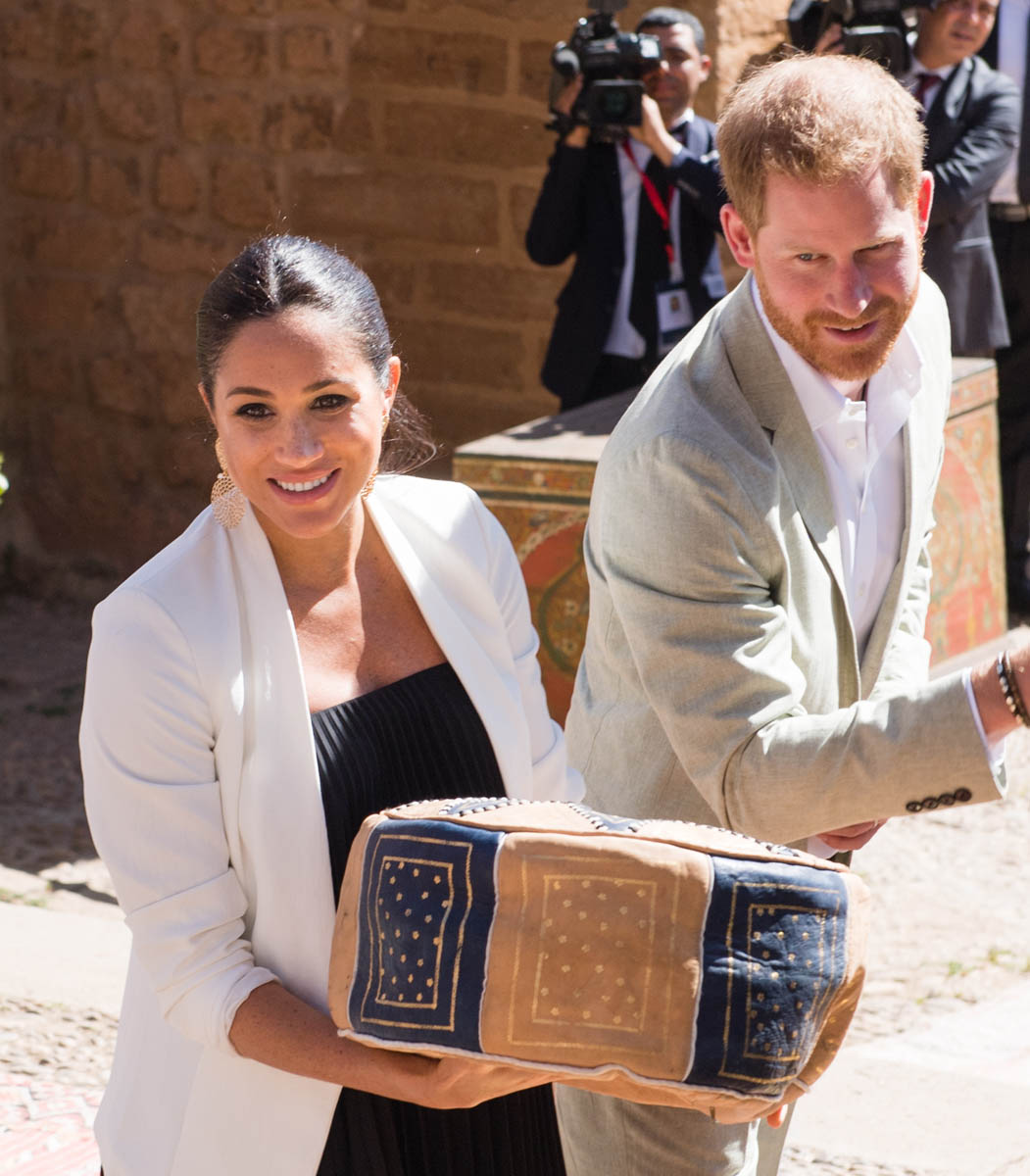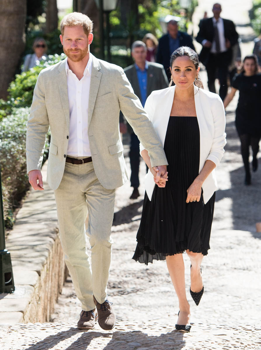 Yesterday, to conclude their visit, Harry and Meghan were invited to meet with the King of Morocco, Mohammed VI and his family. She wore a loose blue Carolina Herrera dress with flutter sleeves – great colour on her, great print, she looks pretty, probably one of her best outfits in a while. It was a busy day with a lot of wardrobe changes as they made several stops – a selection of photos is attached below. As you can see, the aggressive belly-cupping continues, and the signature Sussex PDA was in full effect all weekend as they were as affectionate and tactile with each other as they’ve ever been, always staying close, looking at each other often, giggling together often, warmly receiving well-wishes about the pregnancy –and joking about it too, at the 50 second mark: