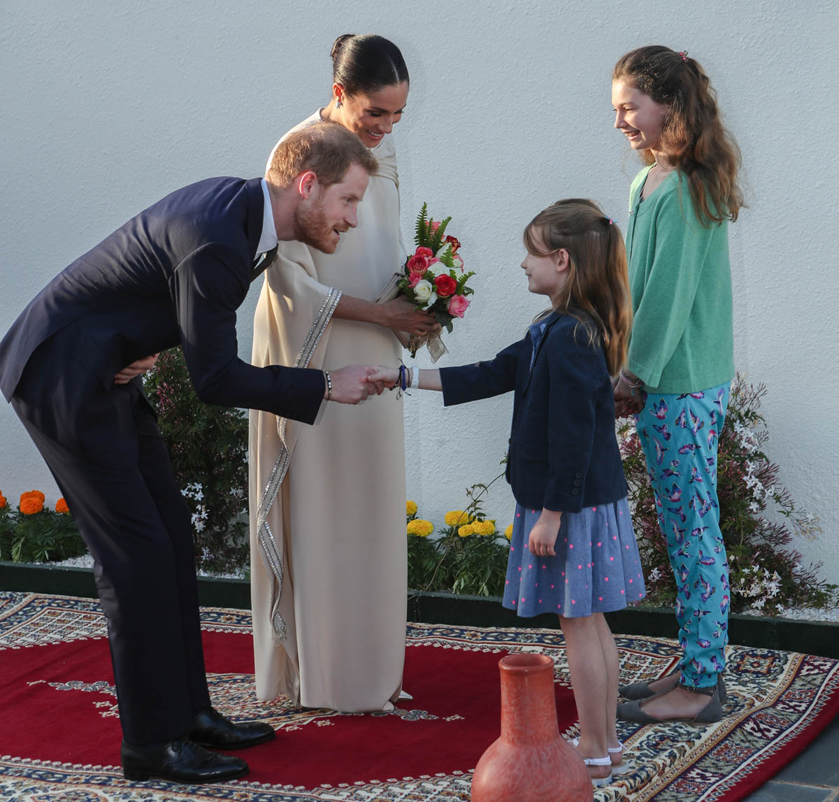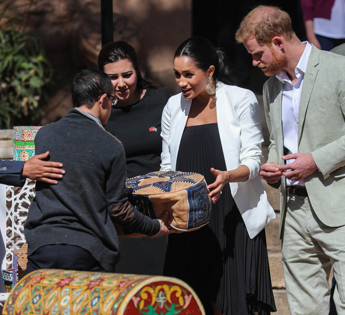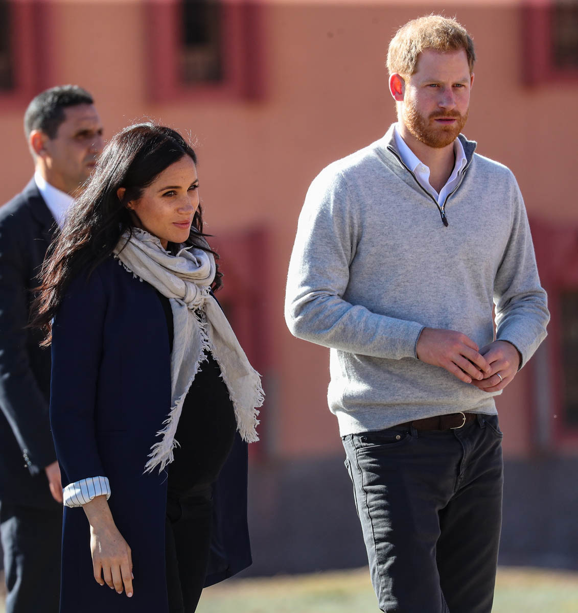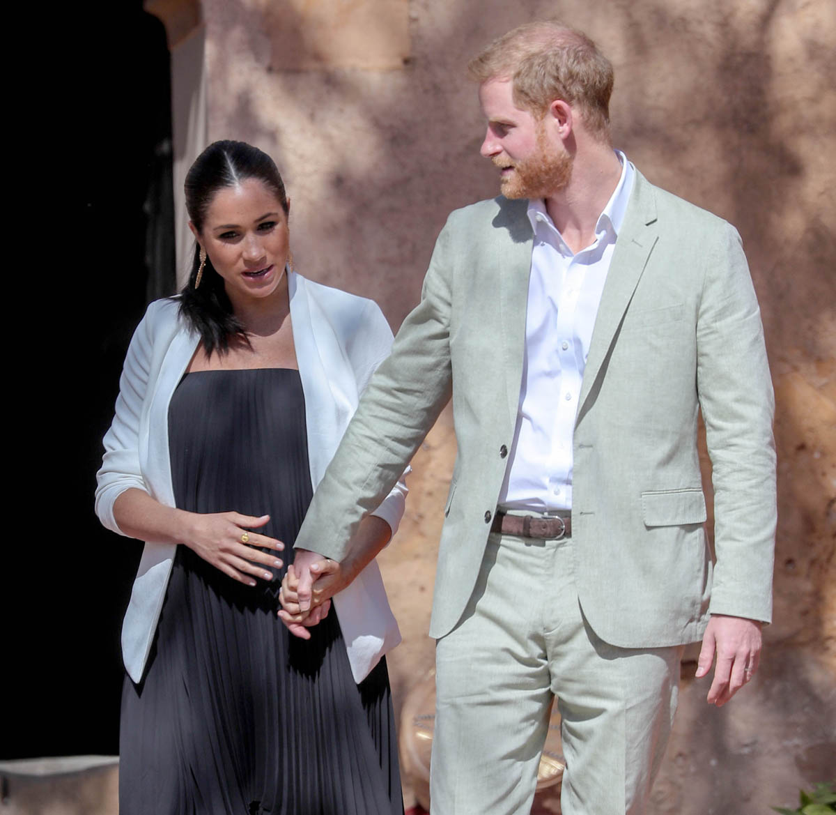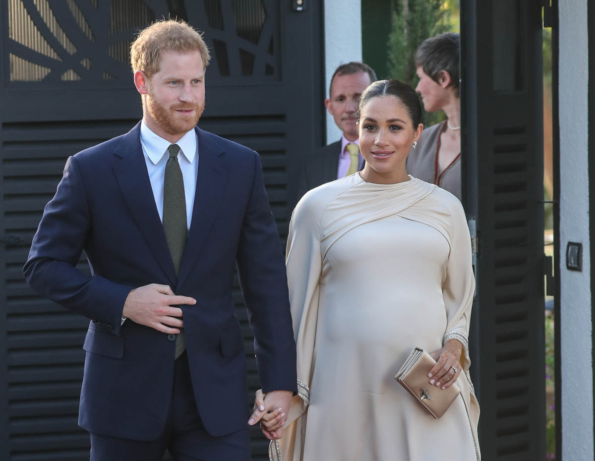 Yesterday, to conclude their visit, Harry and Meghan were invited to meet with the King of Morocco, Mohammed VI and his family. She wore a loose blue Carolina Herrera dress with flutter sleeves – great colour on her, great print, she looks pretty, probably one of her best outfits in a while. It was a busy day with a lot of wardrobe changes as they made several stops – a selection of photos is attached below. As you can see, the aggressive belly-cupping continues, and the signature Sussex PDA was in full effect all weekend as they were as affectionate and tactile with each other as they’ve ever been, always staying close, looking at each other often, giggling together often, warmly receiving well-wishes about the pregnancy –and joking about it too, at the 50 second mark: