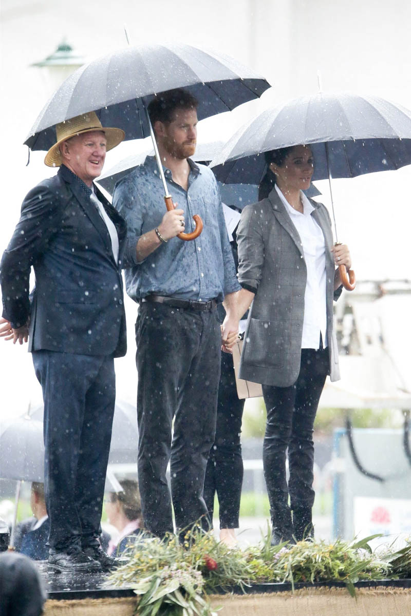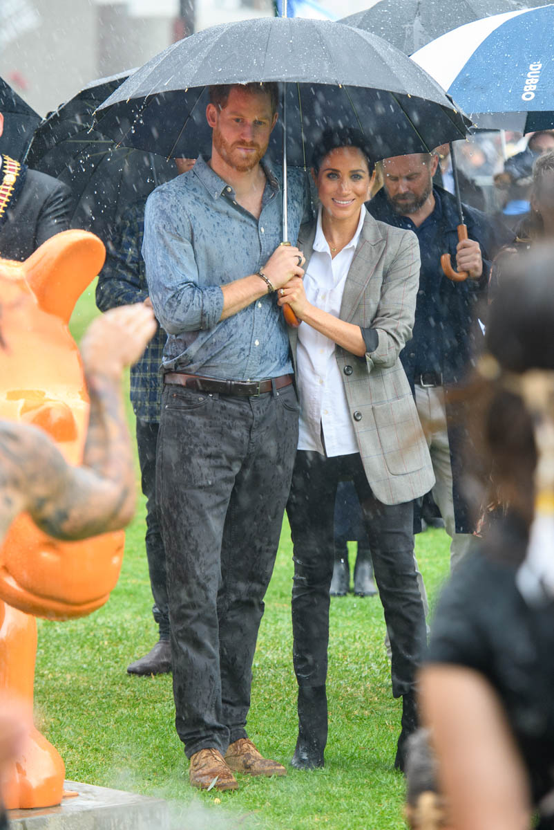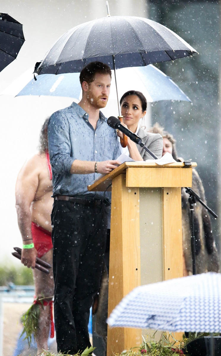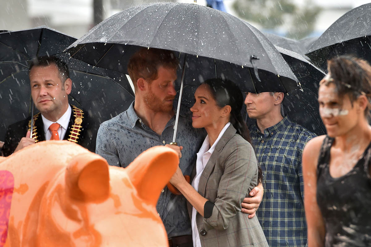 Prince Harry and Meghan Markle were in Dubbo today. As I’m sure you’ve heard by now, there’s been two years of drought in Dubbo and it rained on the day that the Sussexes visited. Which is why the headlines have been all about how Harry and Royal Meghan are makin’ it rain on a community that much needs it. Thousands of people came to see them, some travelled four or five hours, taking time off work. Harry spoke sensitively about their experiences as Meghan held an umbrella over his head: