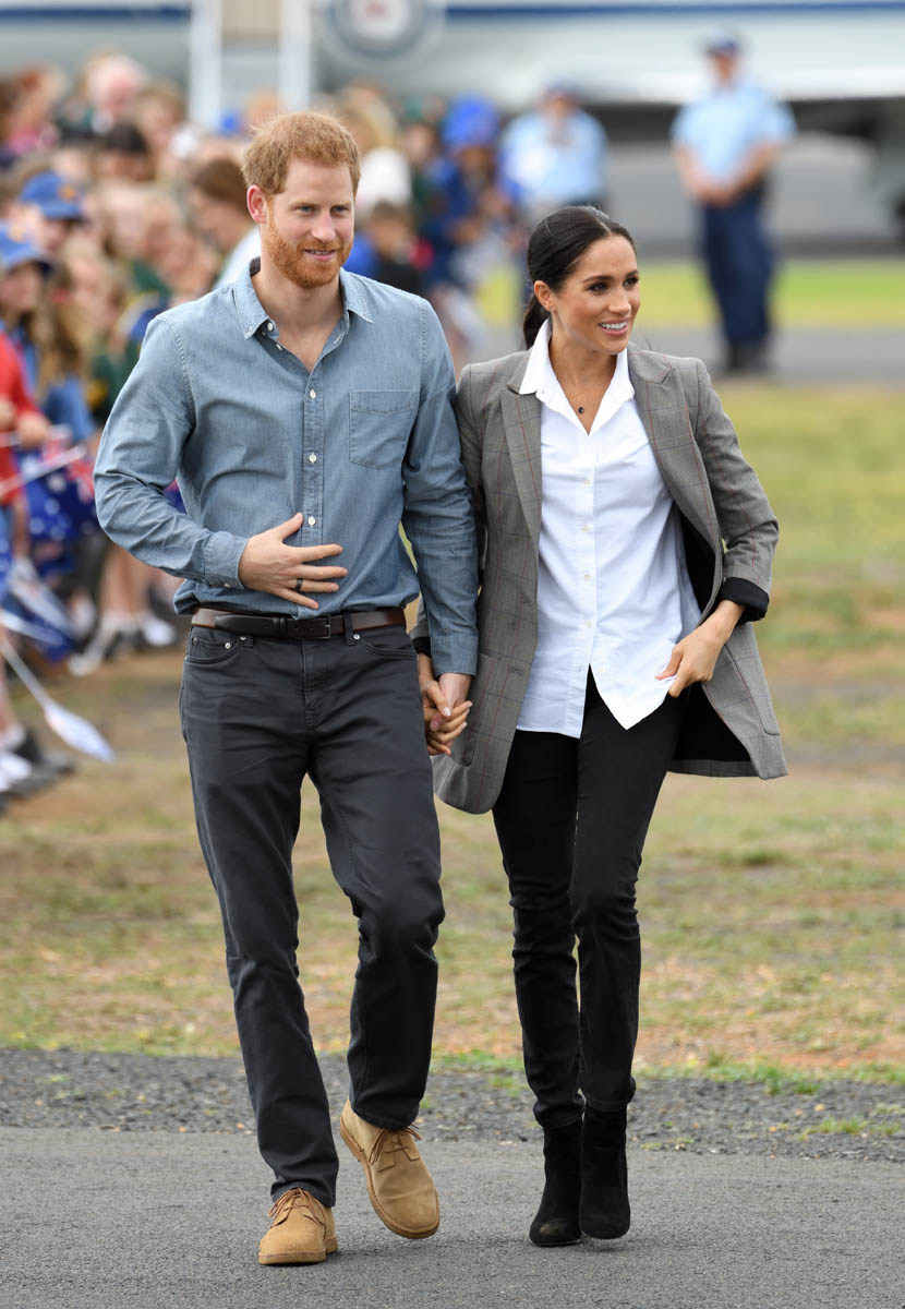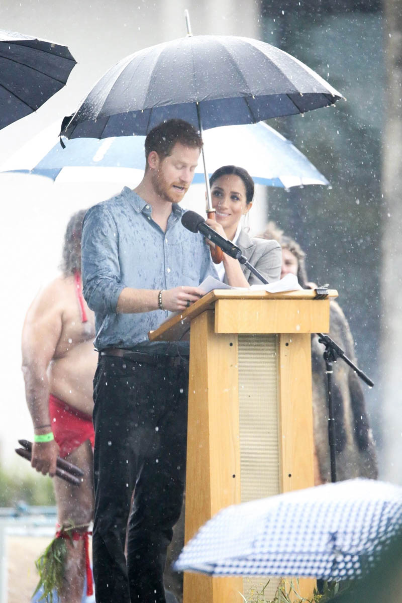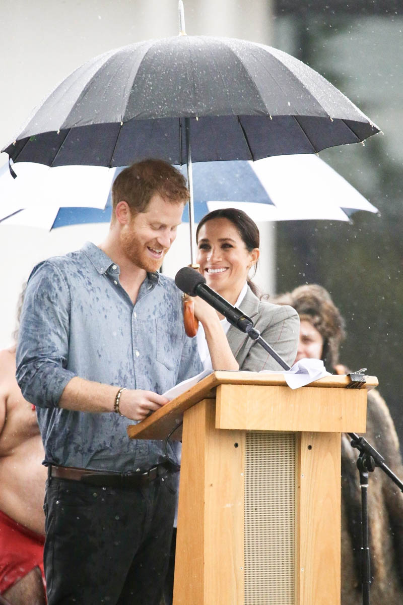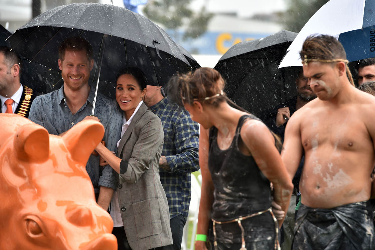 Prince Harry and Meghan Markle were in Dubbo today. As I’m sure you’ve heard by now, there’s been two years of drought in Dubbo and it rained on the day that the Sussexes visited. Which is why the headlines have been all about how Harry and Royal Meghan are makin’ it rain on a community that much needs it. Thousands of people came to see them, some travelled four or five hours, taking time off work. Harry spoke sensitively about their experiences as Meghan held an umbrella over his head: