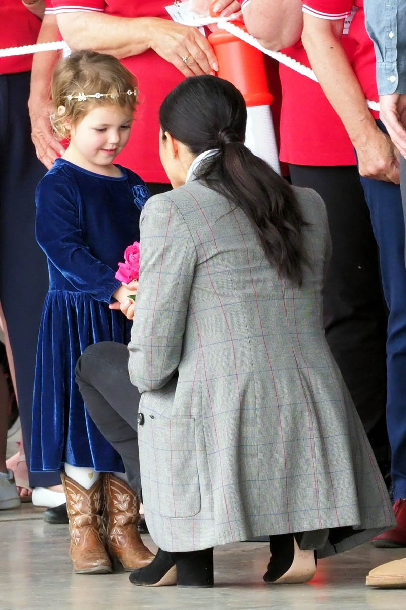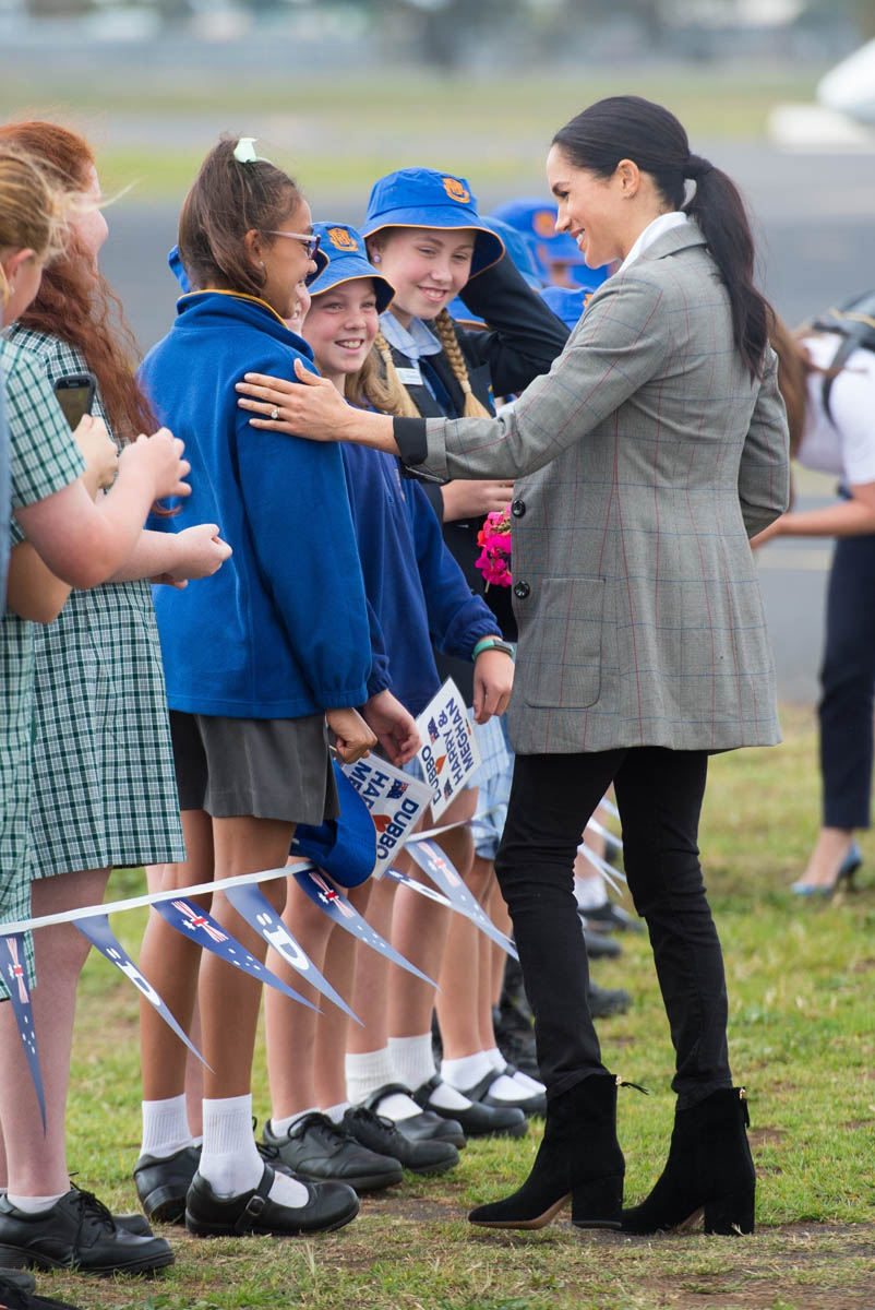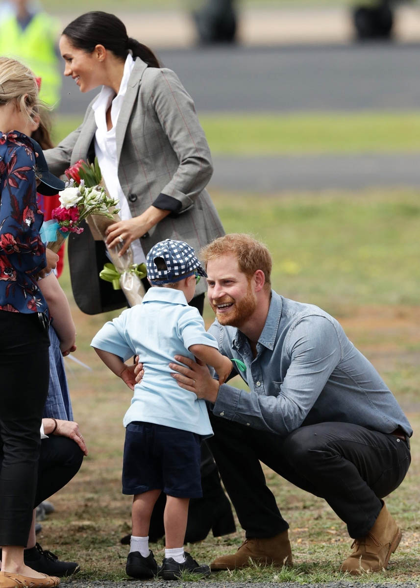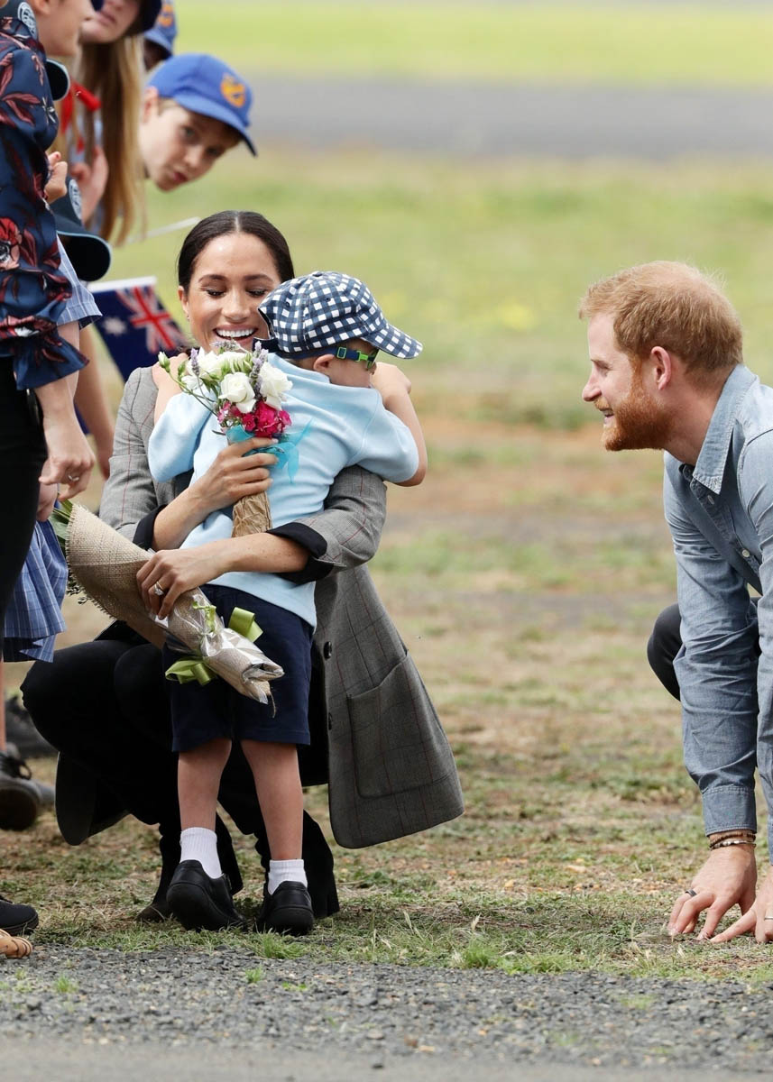 It wasn’t all serious though. There’s the hug everyone’s talking about with little Luke Winston who went right in for a hug and touched Harry’s beard and his hair before giving Meghan “a cuddle”.
