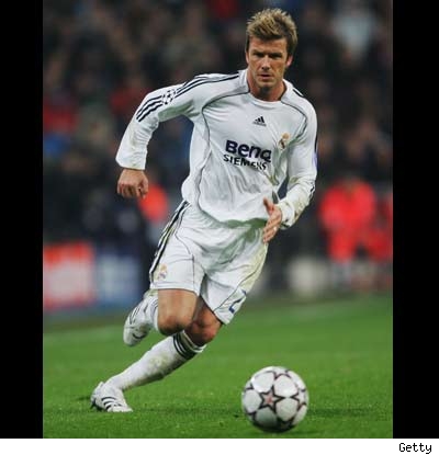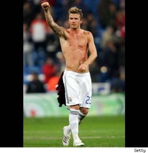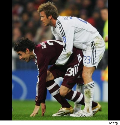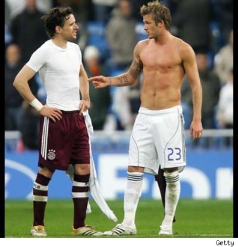 I remember seeing Truth or Dare for the first time – Madonna’s documentary about her Blonde Ambition tour stocked with the hottest gayest (save one…what happened to Oliver anyway?) dancers, like, ever. At one point, two of them giv’er. They were playing – what else – Truth or Dare and Madge asked them to French kiss. I’m telling you … it was The Hotness. Tongue with abandon, full on horniness homo-style… Love, love, love. And now, even though he’s not gay – check out Becks mounting an opposing player during a match for Real Madrid. I’d give anything to have him rock my headboard but next to that, I – like so many of my gays out there – would give anything to watch him rock another dude. Here’s David, shirtless and sweaty and quivering my loins. Have a great day. Source