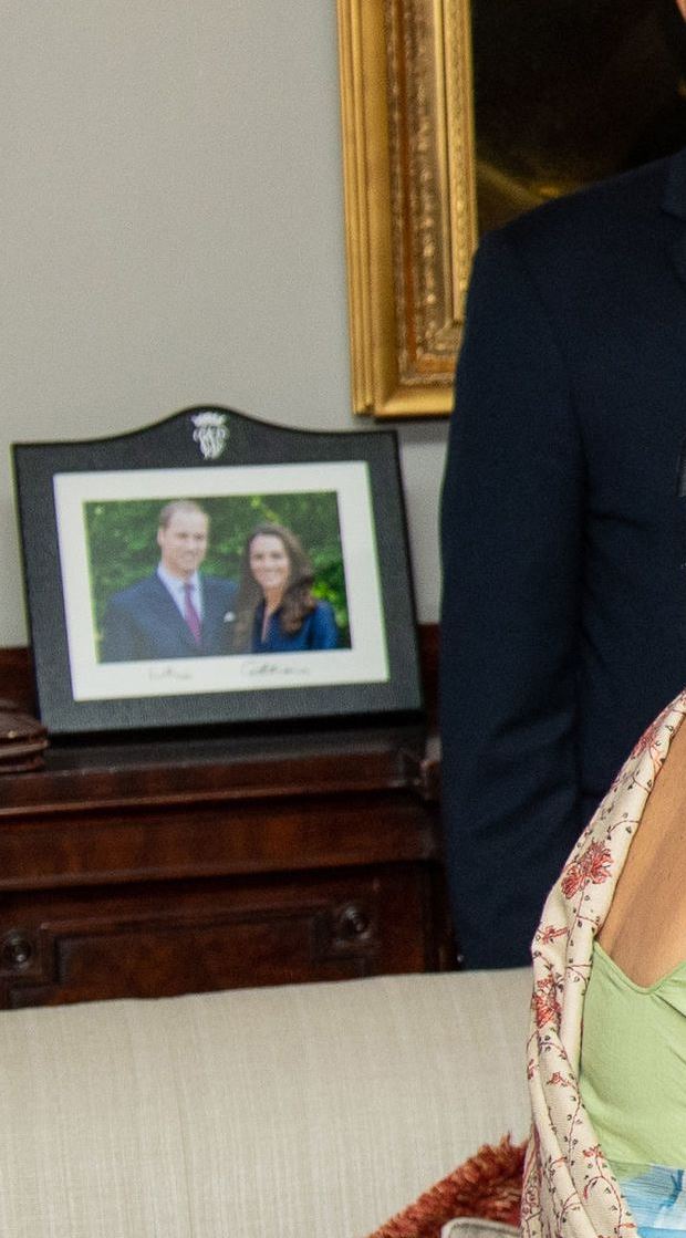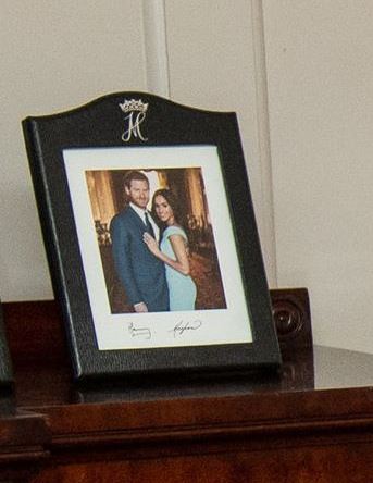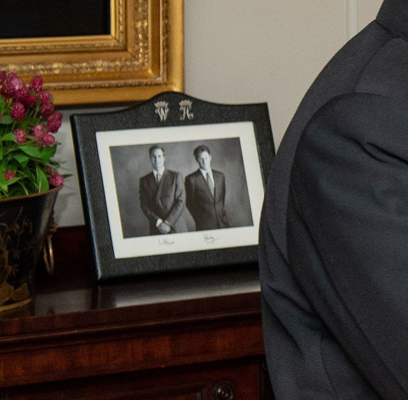 Anyway, grammar is not what people are talking about where Harry’s appearance today is concerned. You can see there’s a photo of Harry and Meghan that they never released publicly in the corner of the shot. The Queen has a copy too. There’s also a framed photo of Harry and William and another of William and Kate. All of these are in special frames with their respective logos engraved at the top. Like I said, when you’re fancy enough to have your logo chiseled into your picture frames, the apostrophes are important, non?