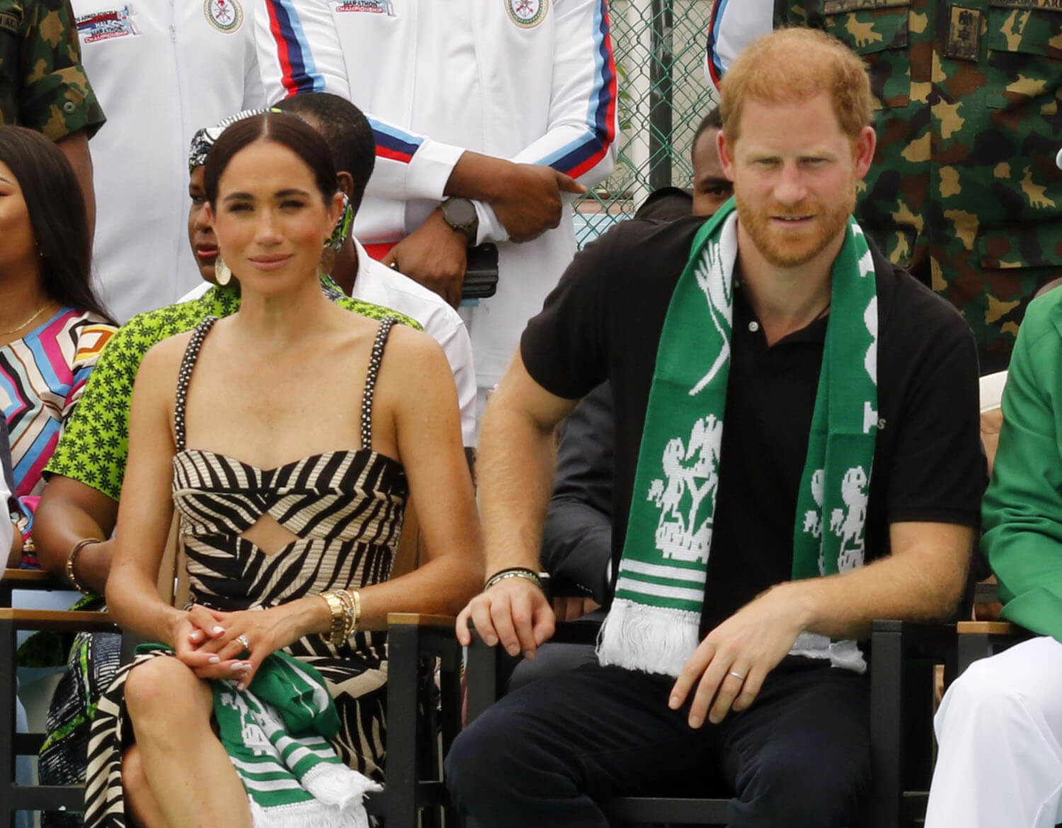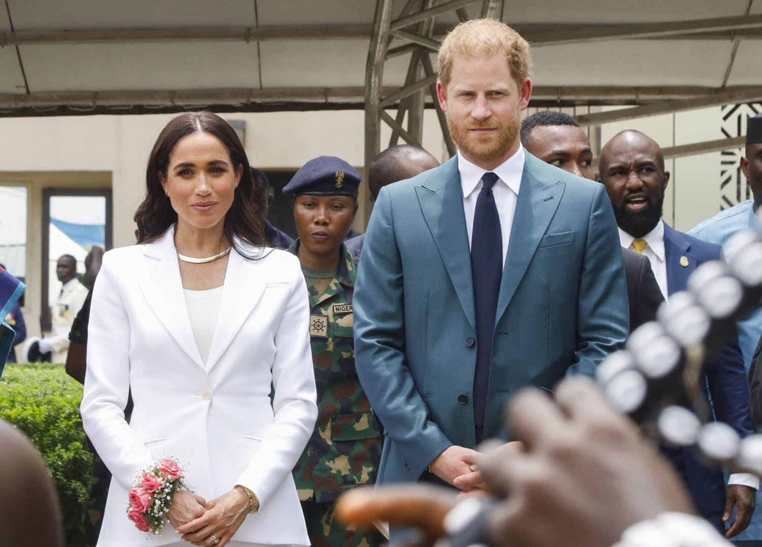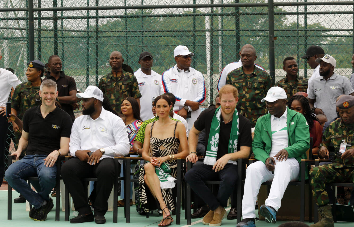 “Hosted by the Chief of Defense Staff, General Christopher Musa, it was a chance for the couple to speak to families of servicemen and women. Shortly after being seated, the couple rose along with everyone else to listen to the national anthems. The ceremony began with "God Save The King," during which the Duke and Duchess of Sussex stood at attention. Harry stood with his eyes forward and his arms by his side as the anthem played. The British anthem was followed by the Nigerian anthem.”