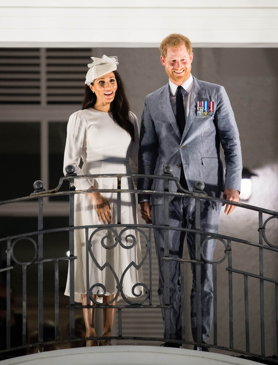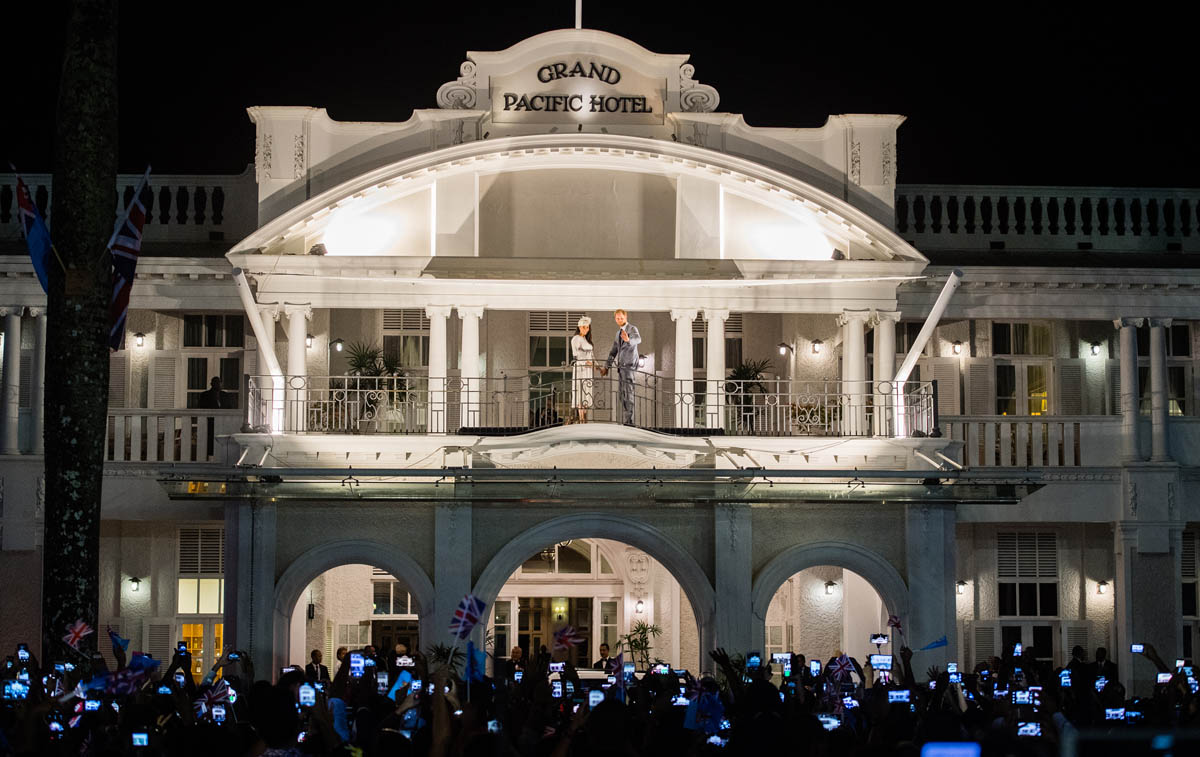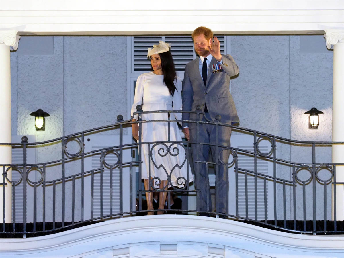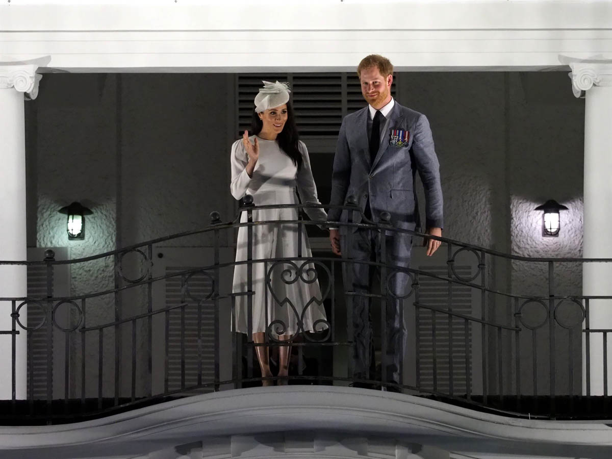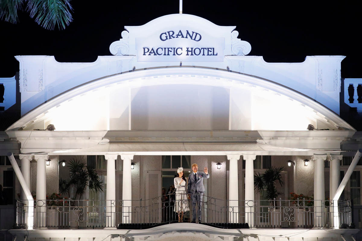 Prince Harry and Royal Meghan arrived in Fiji today. The crowds were huge. Apparently 15,000 people turned out to greet them. The Sussexes waved to their well-wishers from the balcony of the Grand Pacific Hotel where, 65 years ago, Harry’s grandparents, Queen Elizabeth and Prince Philip, also posed for the same photo. It’s a majestic setting, a majestic sight. Balconies have that effect. And these are great shots – regal, royal, stately.