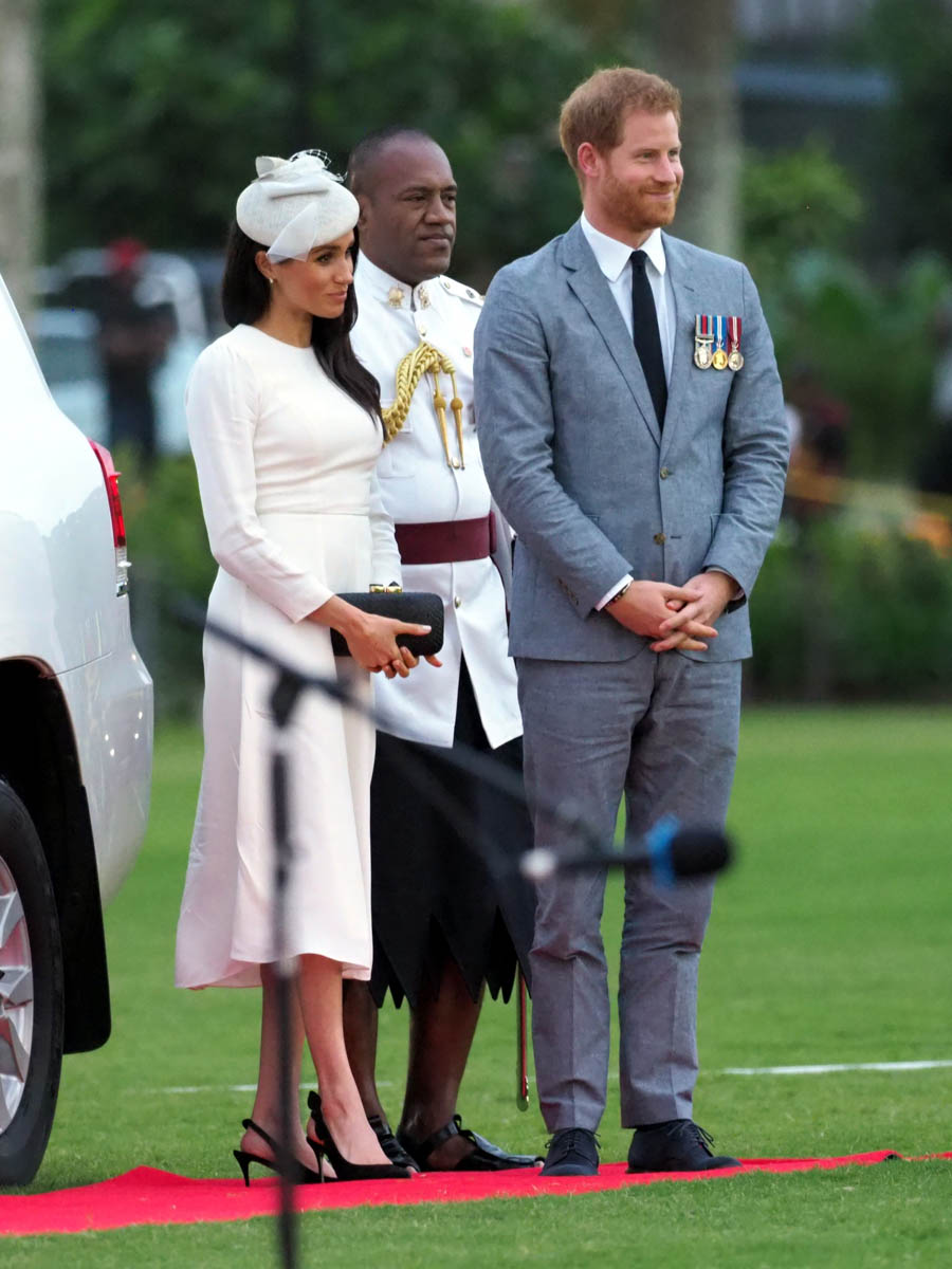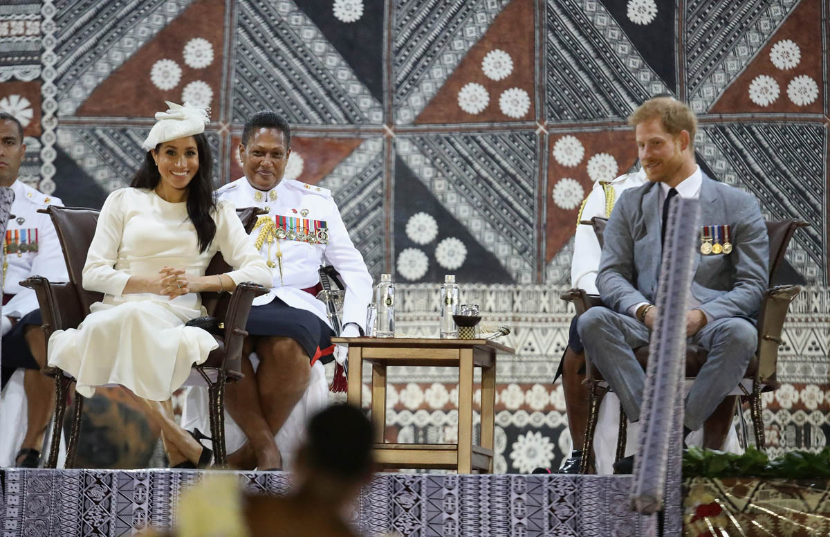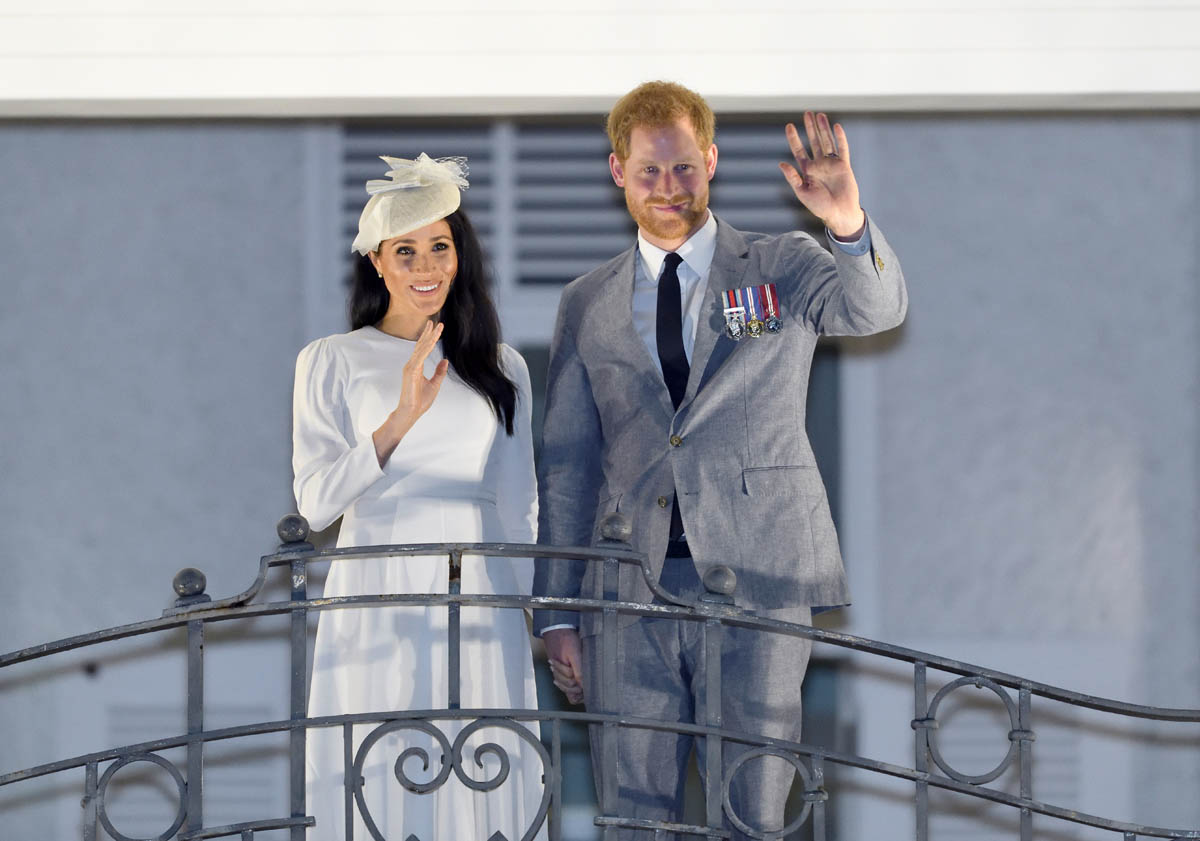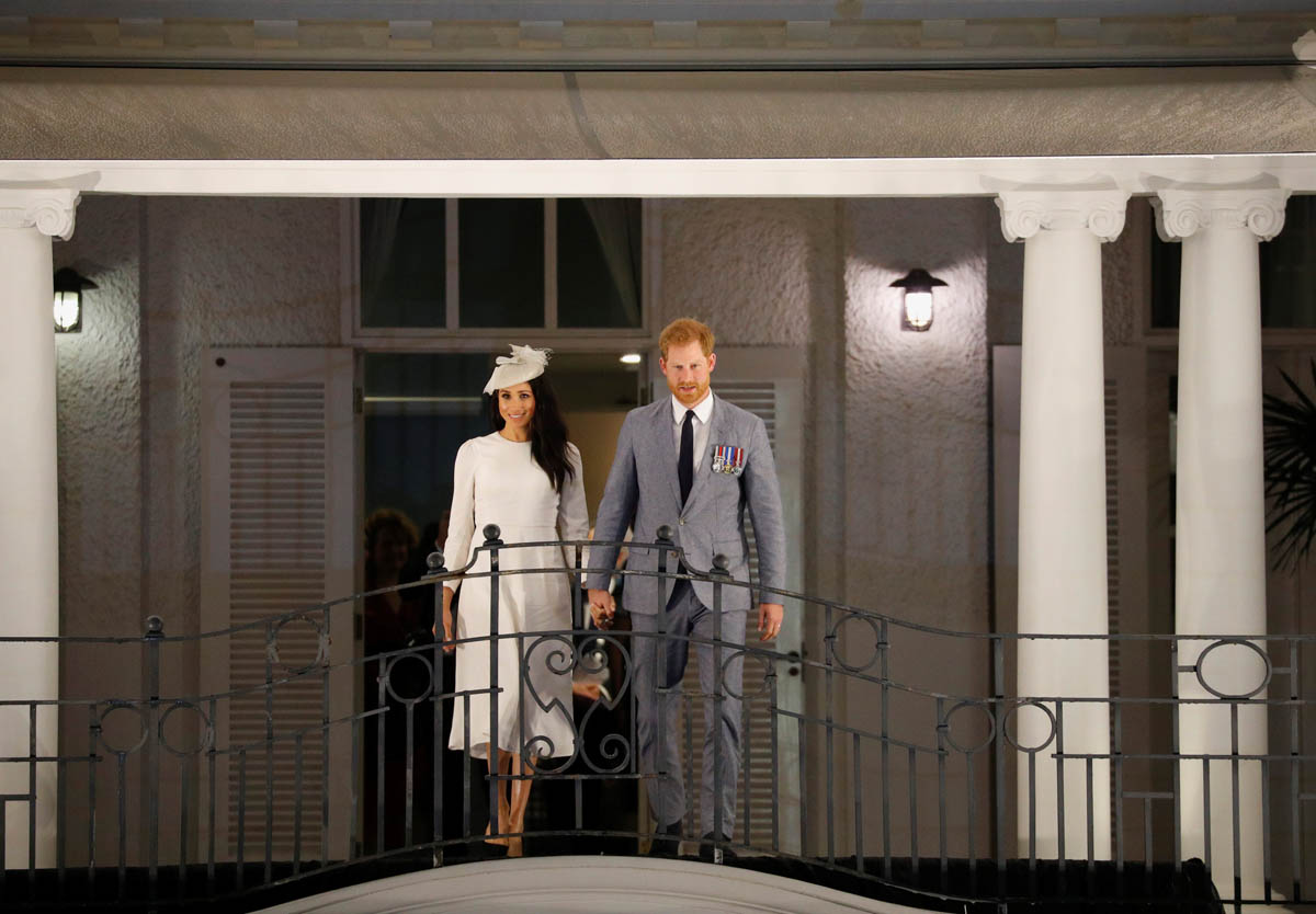 Prince Harry and Royal Meghan arrived in Fiji today. The crowds were huge. Apparently 15,000 people turned out to greet them. The Sussexes waved to their well-wishers from the balcony of the Grand Pacific Hotel where, 65 years ago, Harry’s grandparents, Queen Elizabeth and Prince Philip, also posed for the same photo. It’s a majestic setting, a majestic sight. Balconies have that effect. And these are great shots – regal, royal, stately.