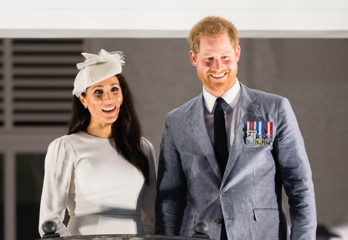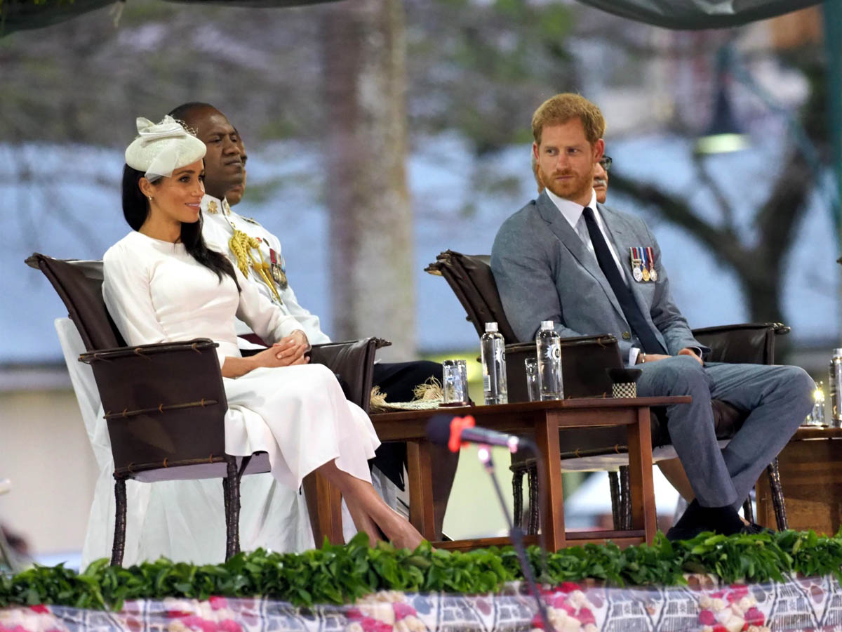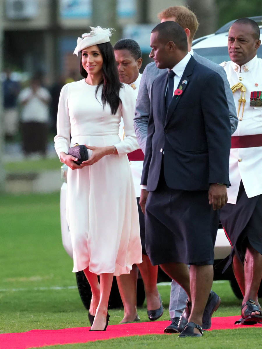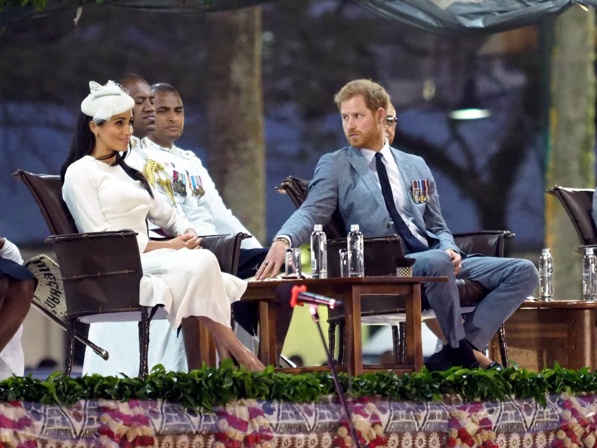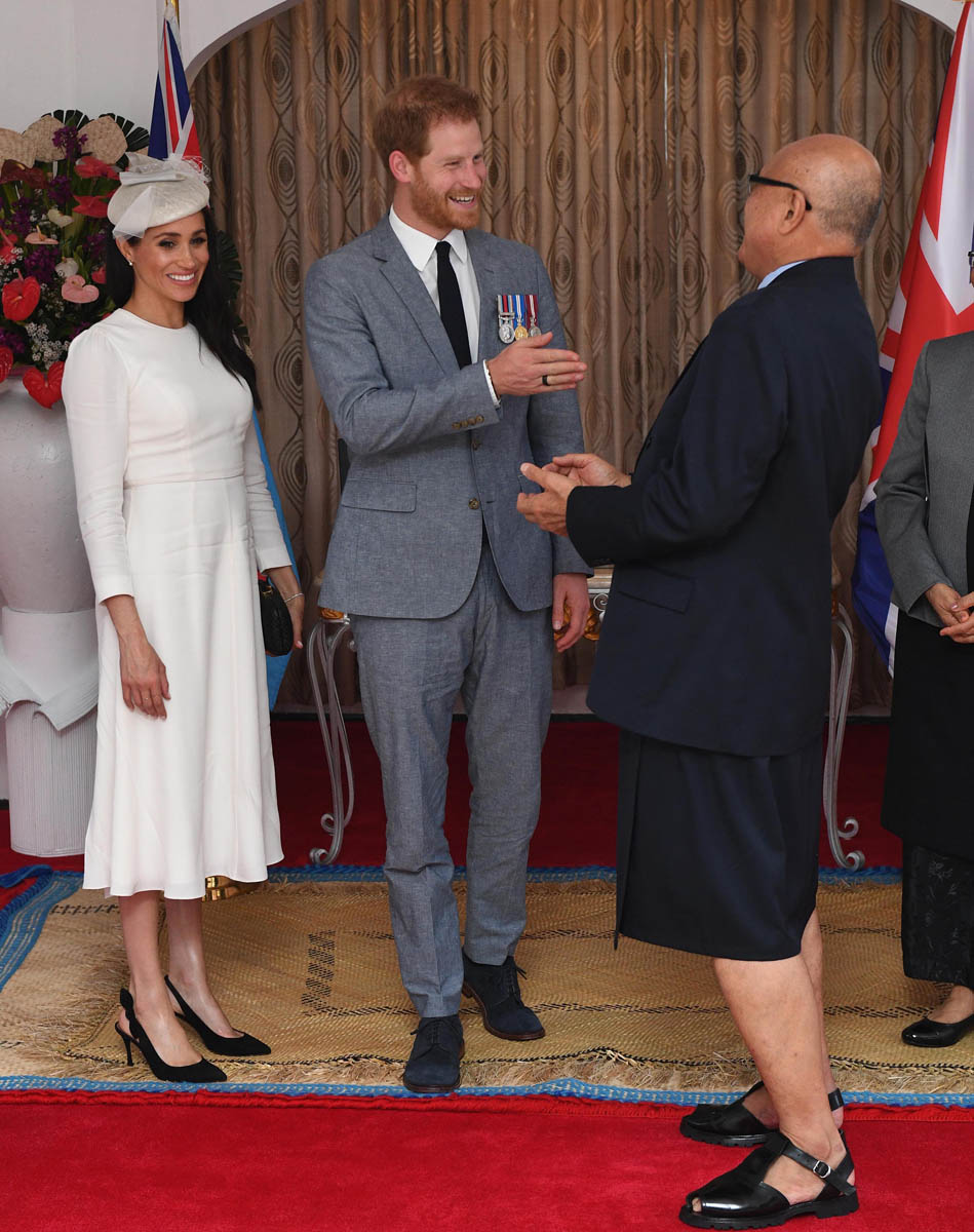 Prince Harry and Royal Meghan arrived in Fiji today. The crowds were huge. Apparently 15,000 people turned out to greet them. The Sussexes waved to their well-wishers from the balcony of the Grand Pacific Hotel where, 65 years ago, Harry’s grandparents, Queen Elizabeth and Prince Philip, also posed for the same photo. It’s a majestic setting, a majestic sight. Balconies have that effect. And these are great shots – regal, royal, stately.