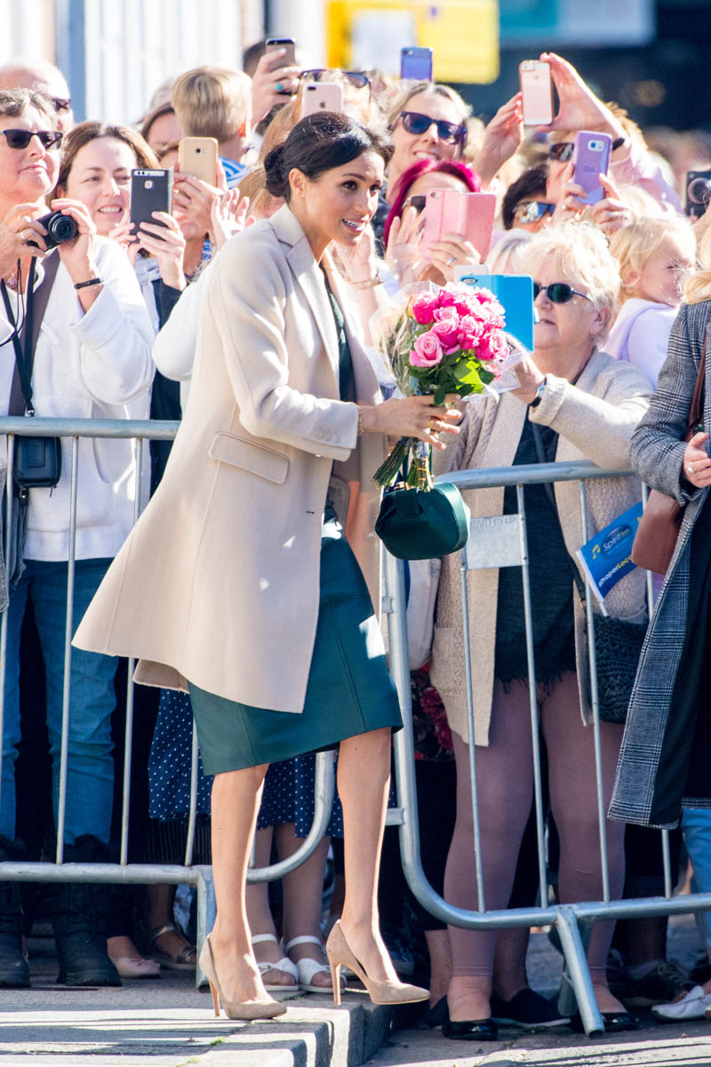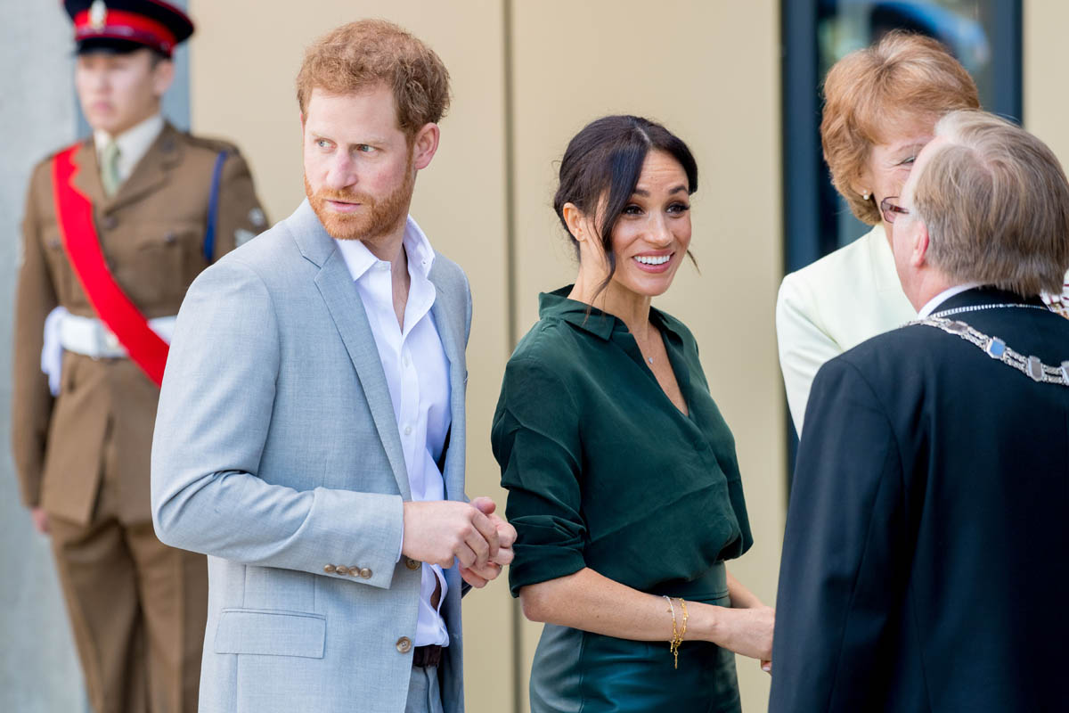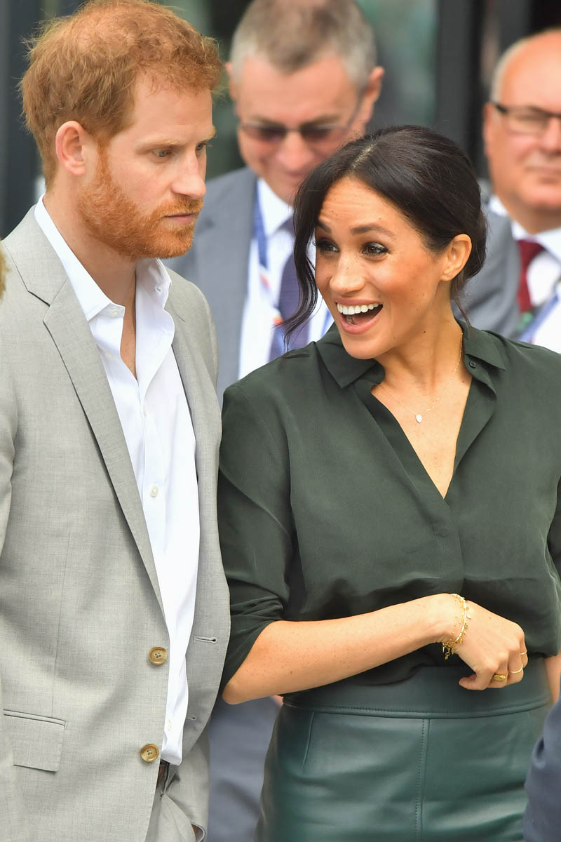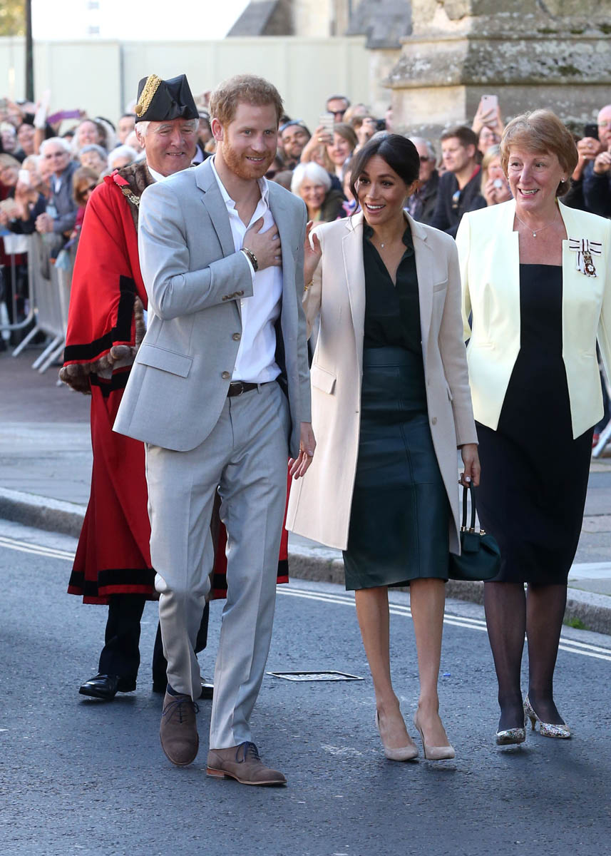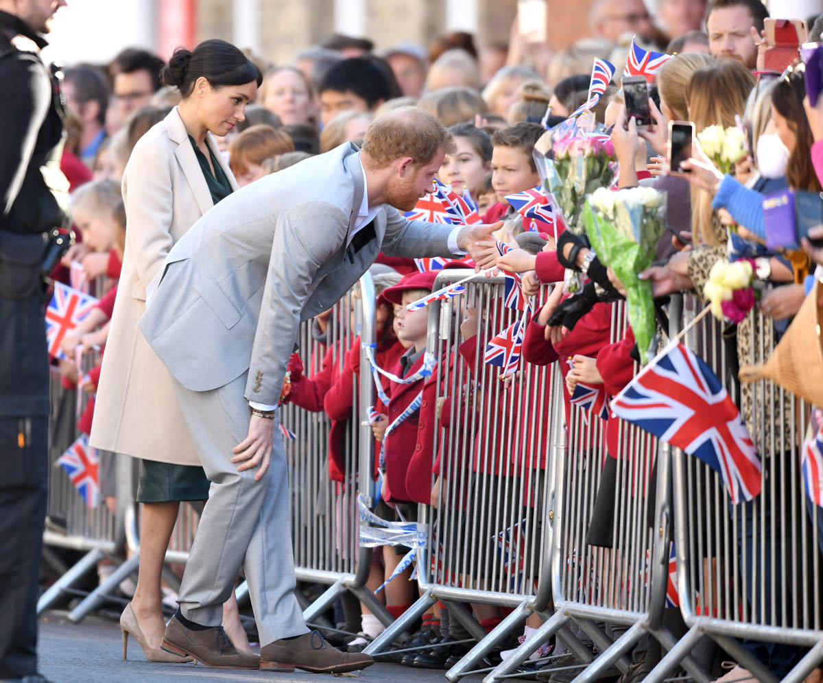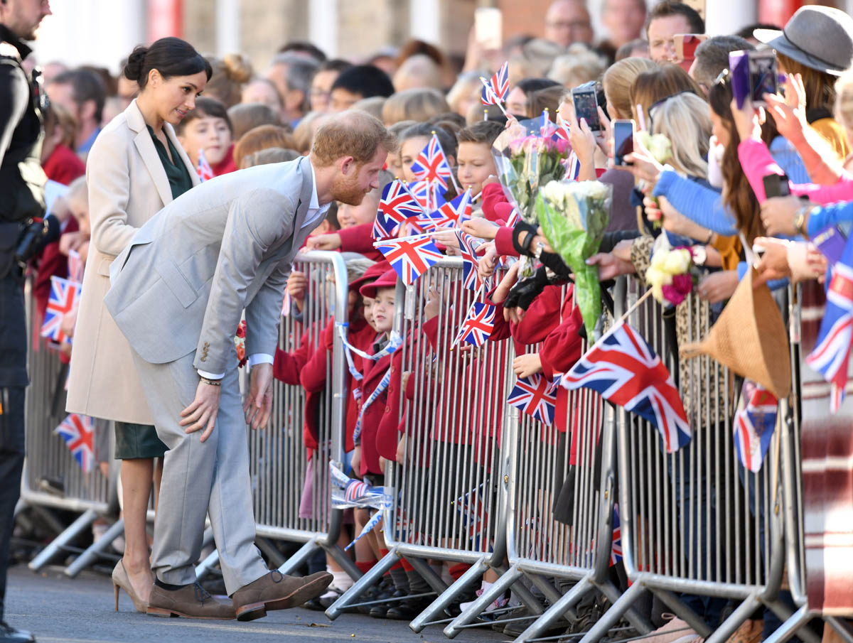 As always, the Sussexes seem super relaxed and engaged. I’ve not yet seen any of their signature PDA yet but Royal Meghan had a cute moment when she broke into giggles, reacting to the screams of the crowds behind them while they were meeting the mayor and the bishop: