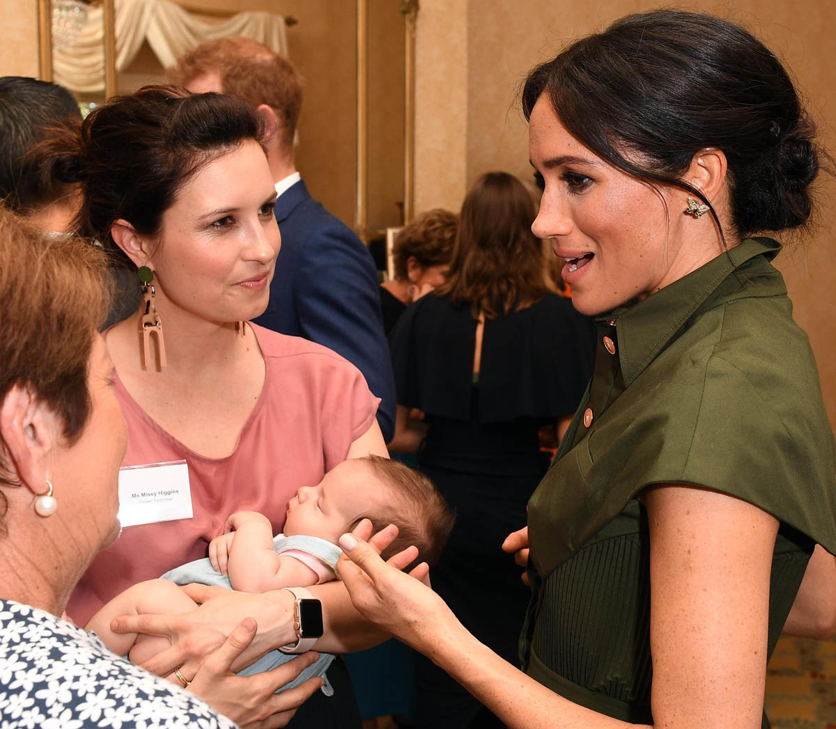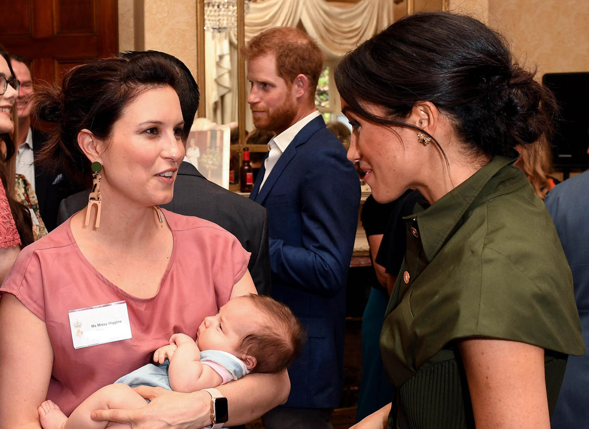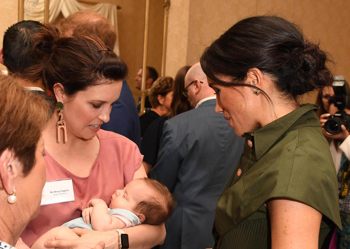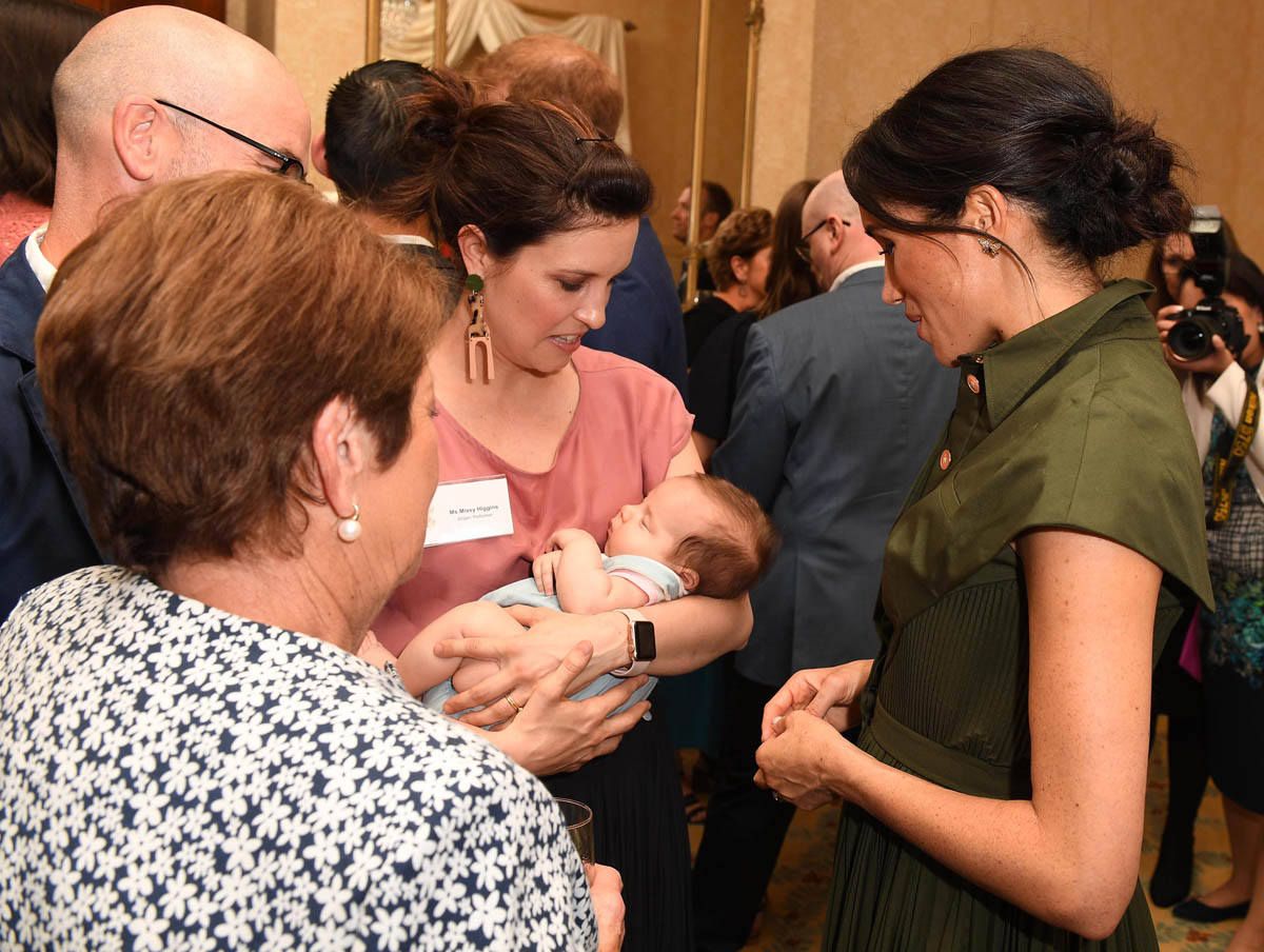 Just hours after Prince Harry and Meghan Markle arrived in Australia yesterday, Kensington Palace made the announcement that they are expecting their first child. As we’ve established, this jacked up the excitement level about the tour, as intended. Harry and Royal Meghan’s final engagement today was a reception hosted by the Governor General where at one point, she spent time talking to singer Missy Higgins holding her baby daughter, Luna. Later on, Meghan told teacher Eddie Woo and his wife Michelle, who have three children, that she and Harry couldn’t wait to “join the club”.