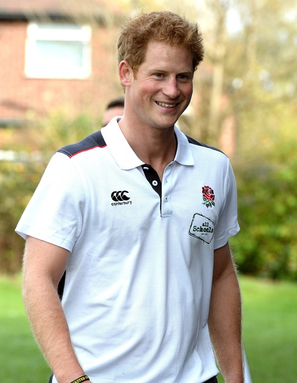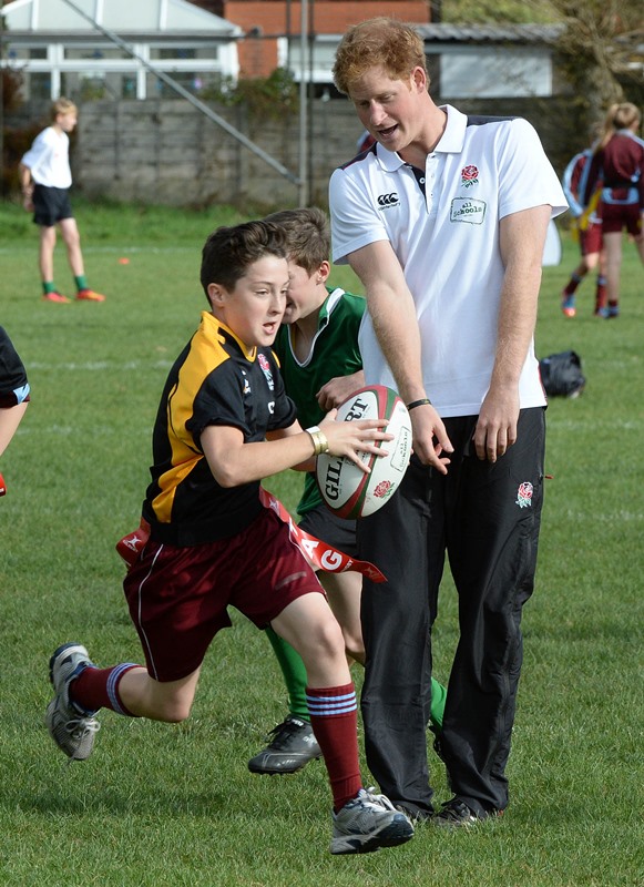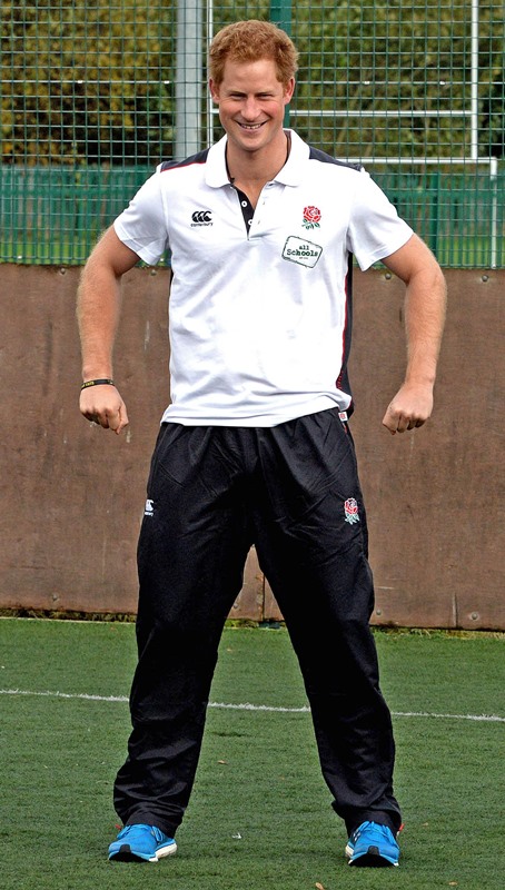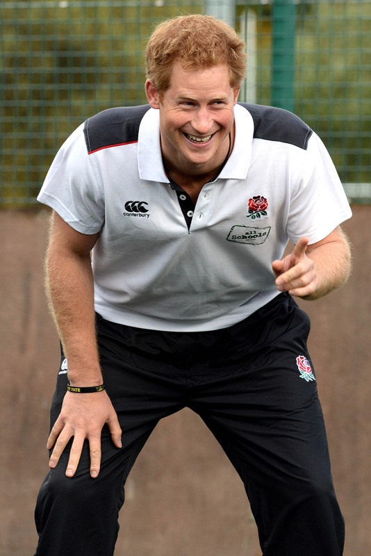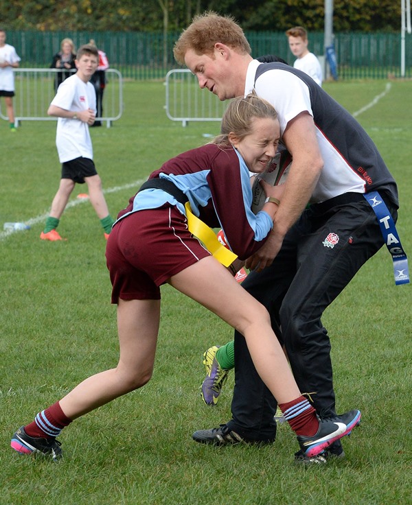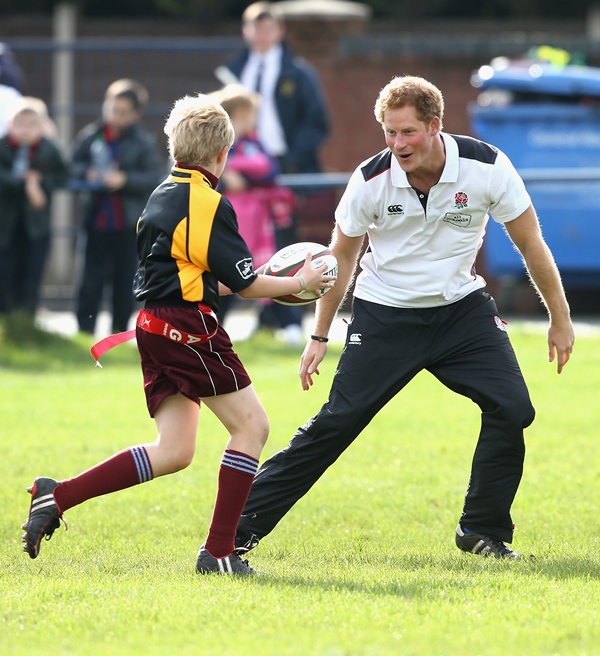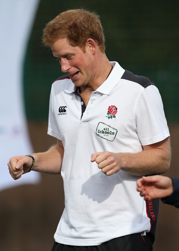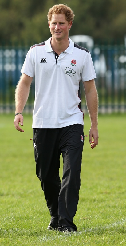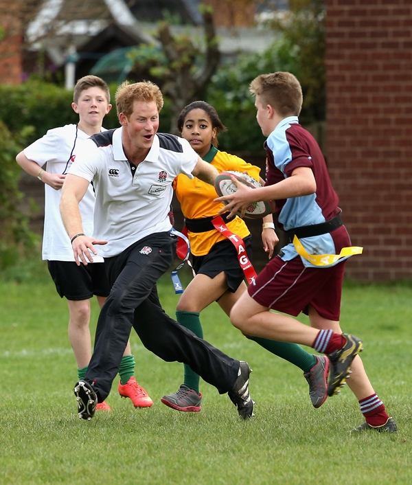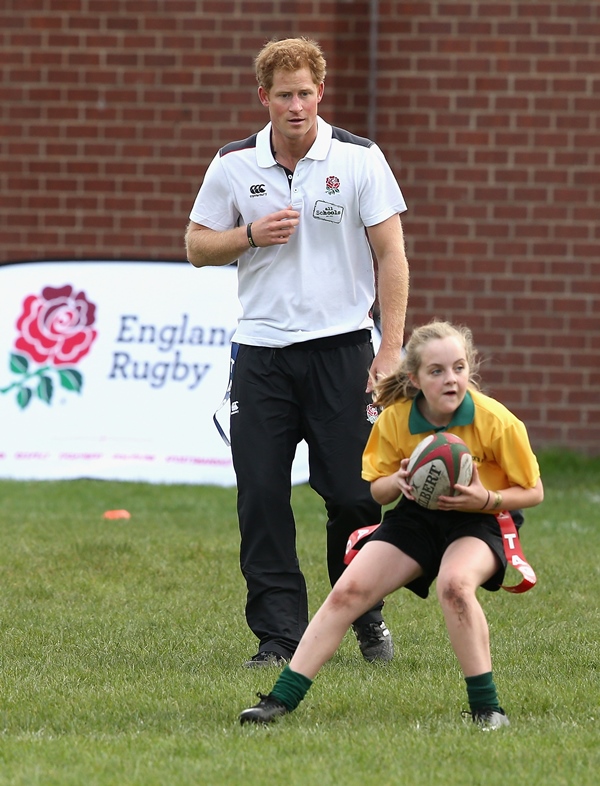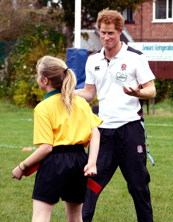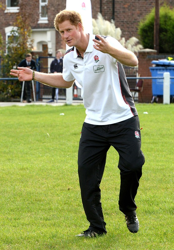 Prince Harry was at work today in Manchester, England in his role as Patron of England Rugby’s All Schools Programme. He participated in a game of touch rugby during teacher training sessions. Happily they let him wear his athletic clothes. Right? Sometimes he shows up at these sporty events in his suits even though he’s supposed to roll around on the field. It’s terribly unpractical.