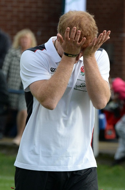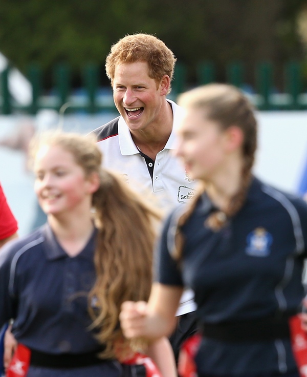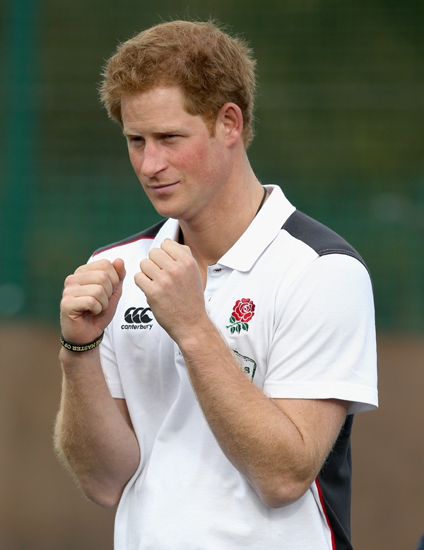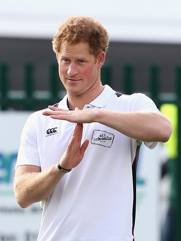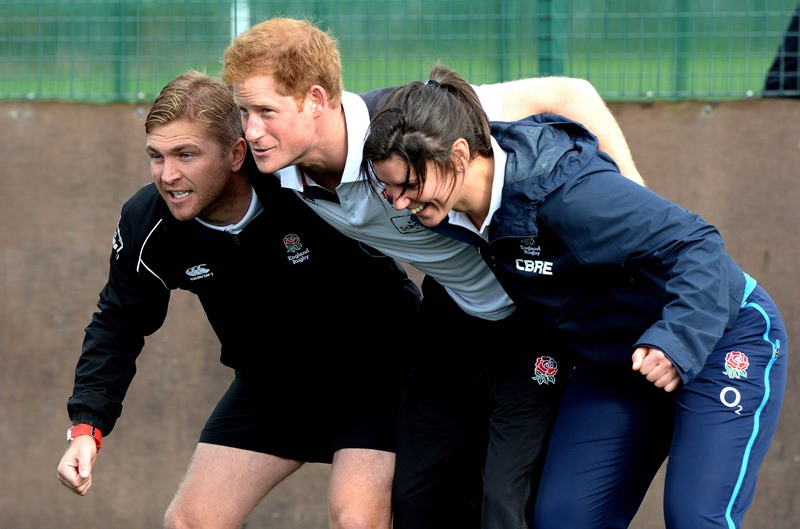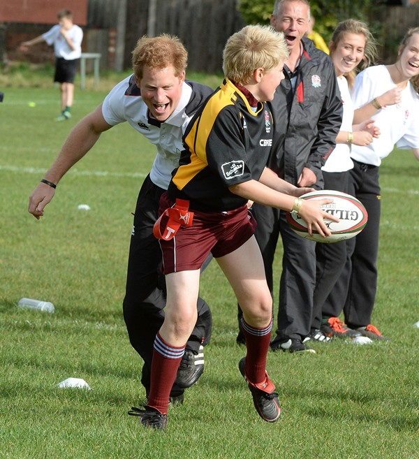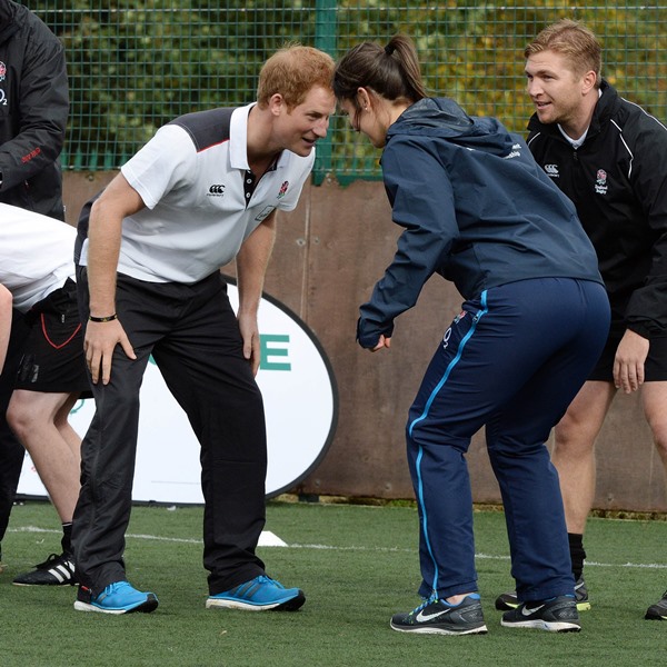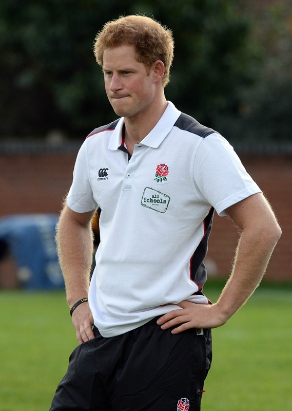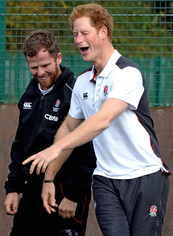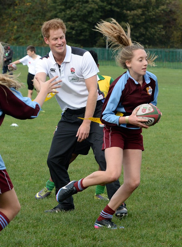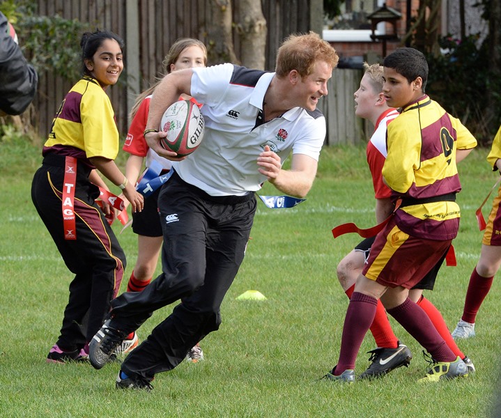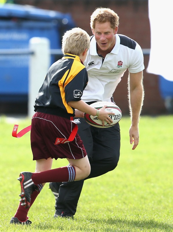 Prince Harry was at work today in Manchester, England in his role as Patron of England Rugby’s All Schools Programme. He participated in a game of touch rugby during teacher training sessions. Happily they let him wear his athletic clothes. Right? Sometimes he shows up at these sporty events in his suits even though he’s supposed to roll around on the field. It’s terribly unpractical.
