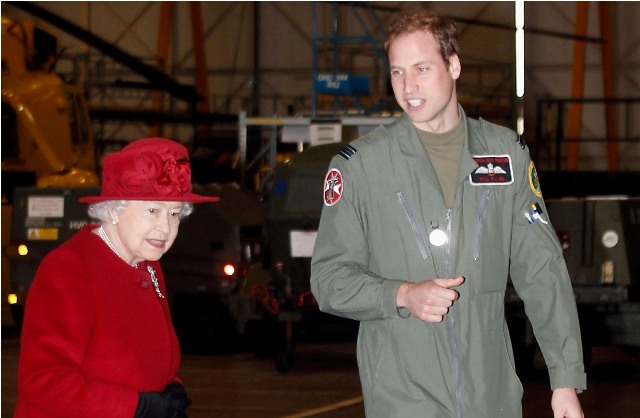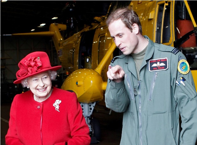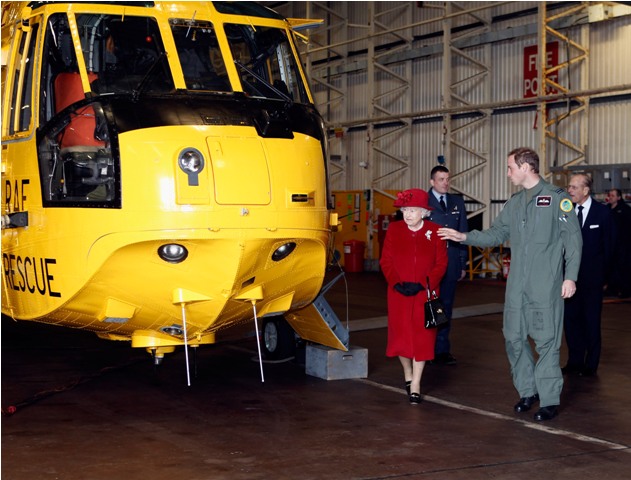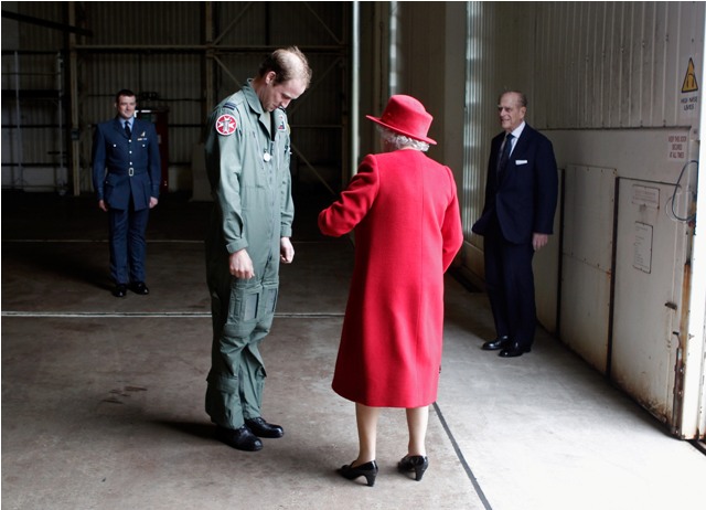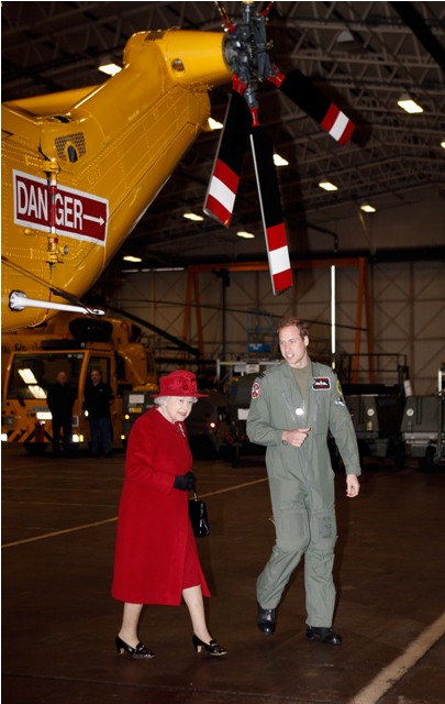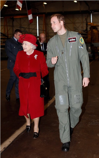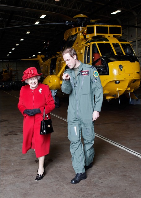 Prince William escorted his grandmother the Queen today during her visit to RAF Valley where Williams is stationed as a search and rescue helicopter pilot. Cute, right? I like the one shot of her talking at him and he’s tucking his chin into his flight suit.
