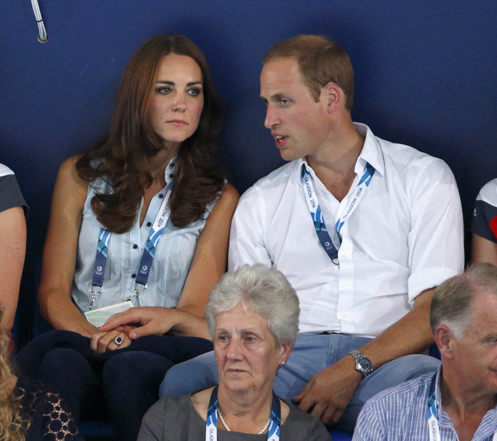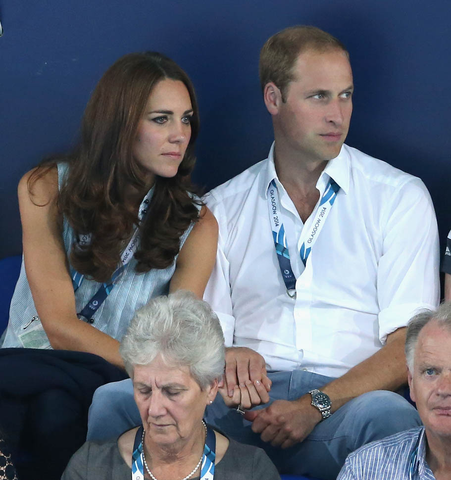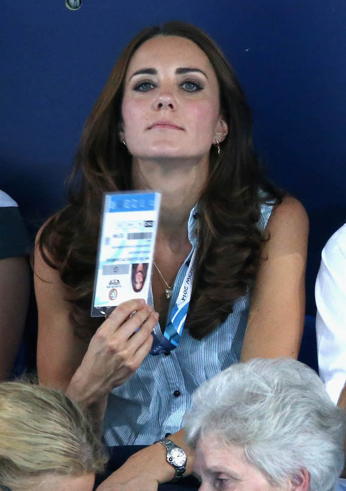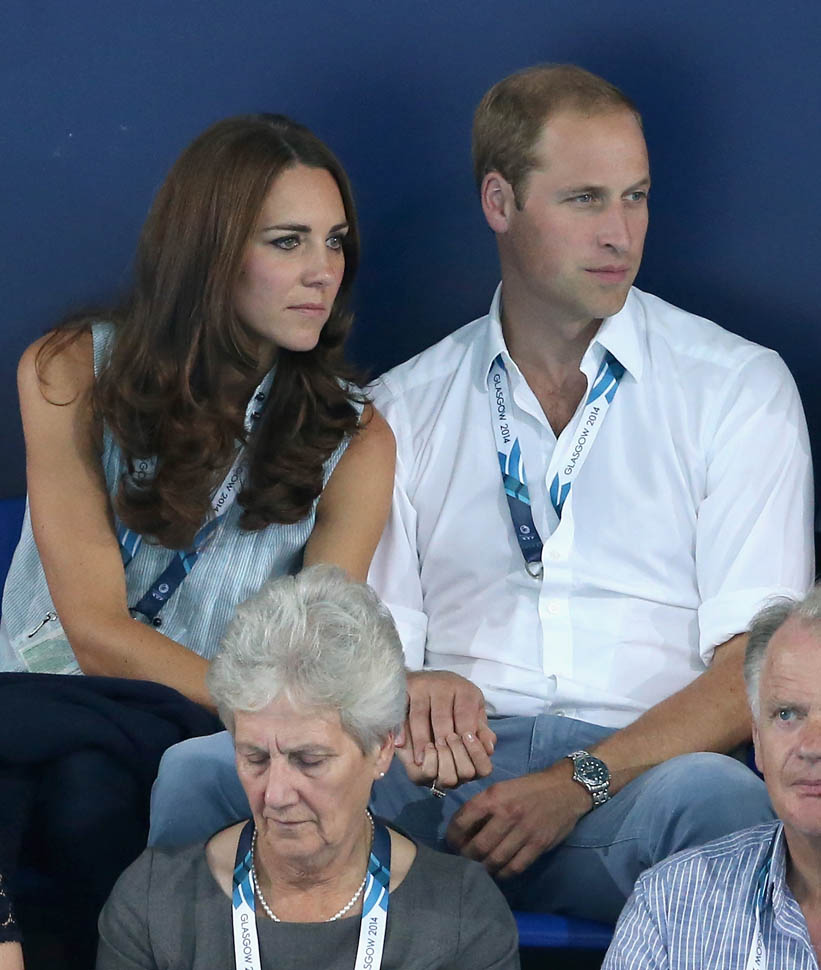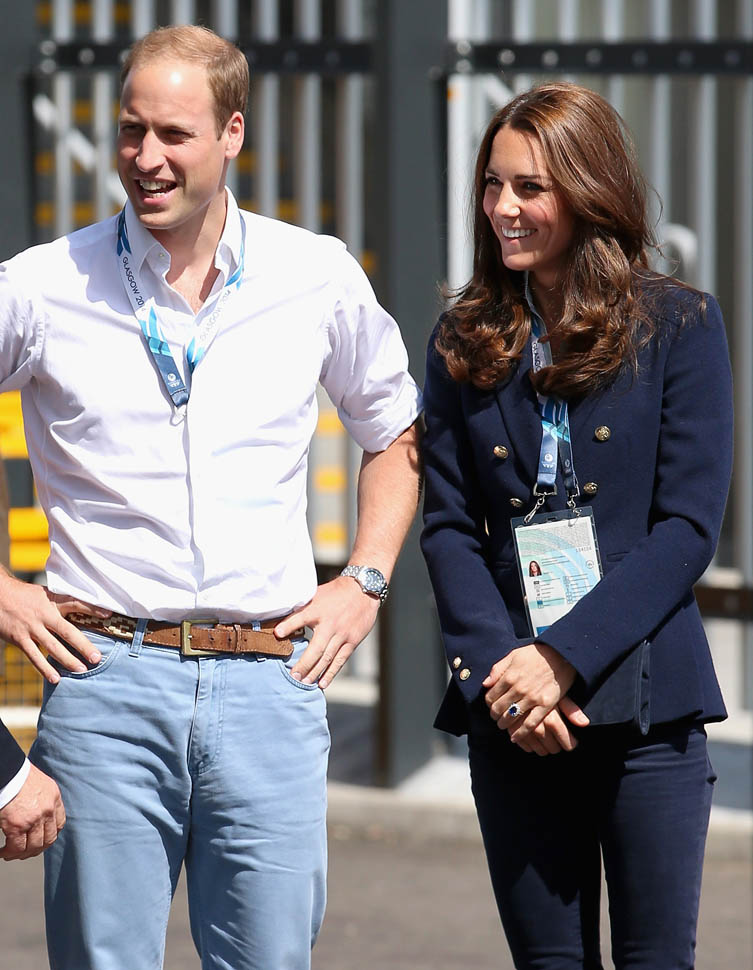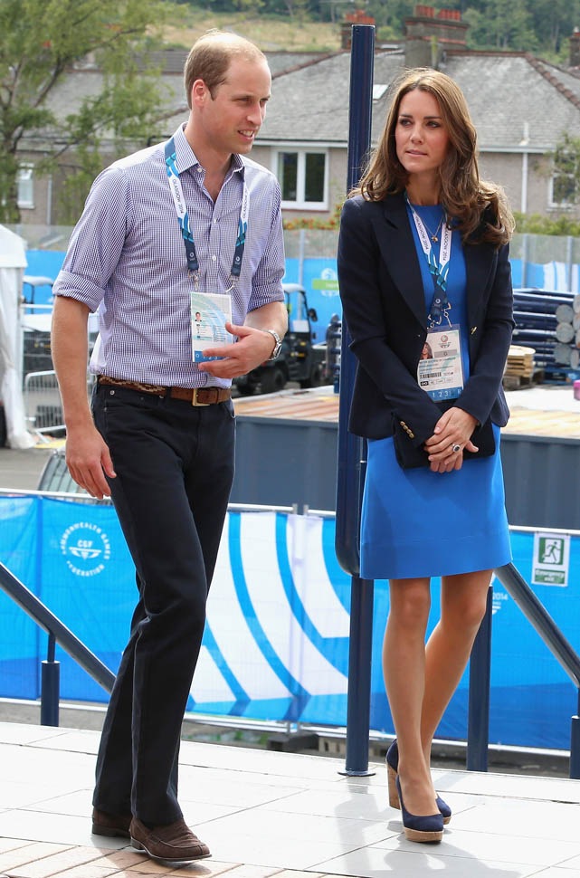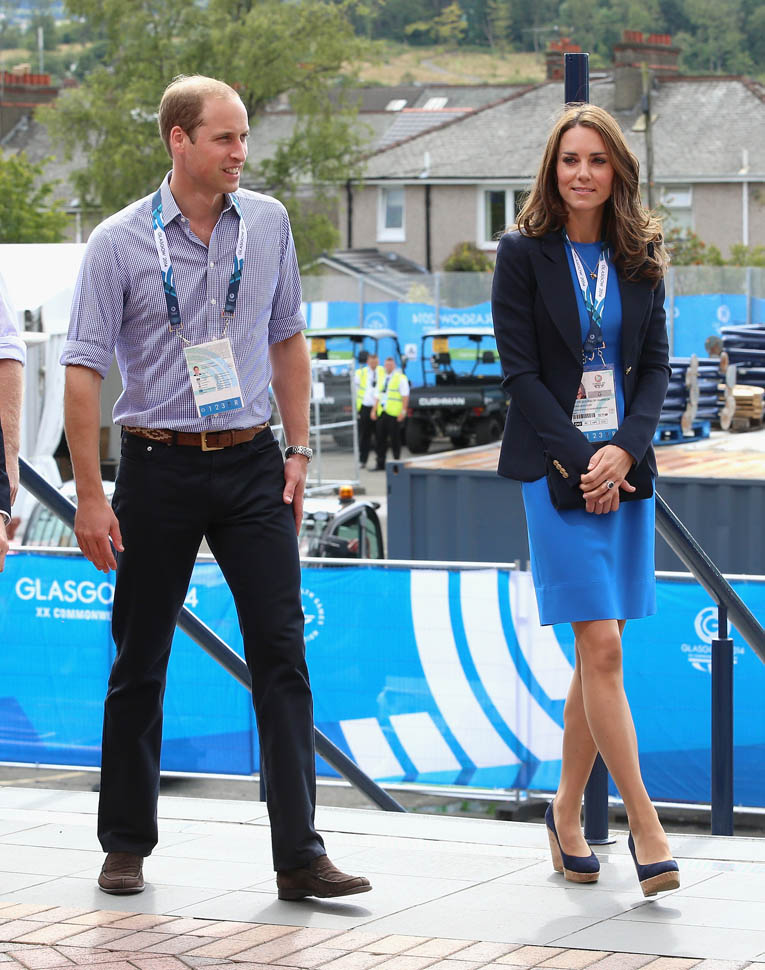 The Cambridges have been in Glasgow the last few days for the Commonwealth Games. Yesterday they were at the swimming centre (she wore a sleeveless shirt under a blazer and pants) and today they were spectators at the athletics competition (in a blue dress).