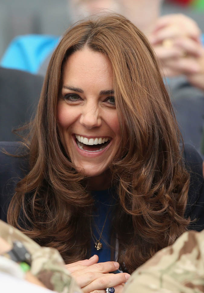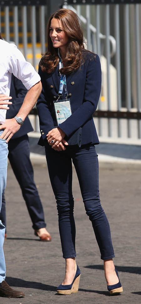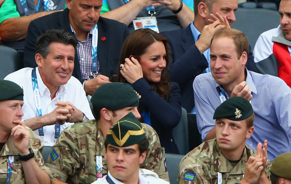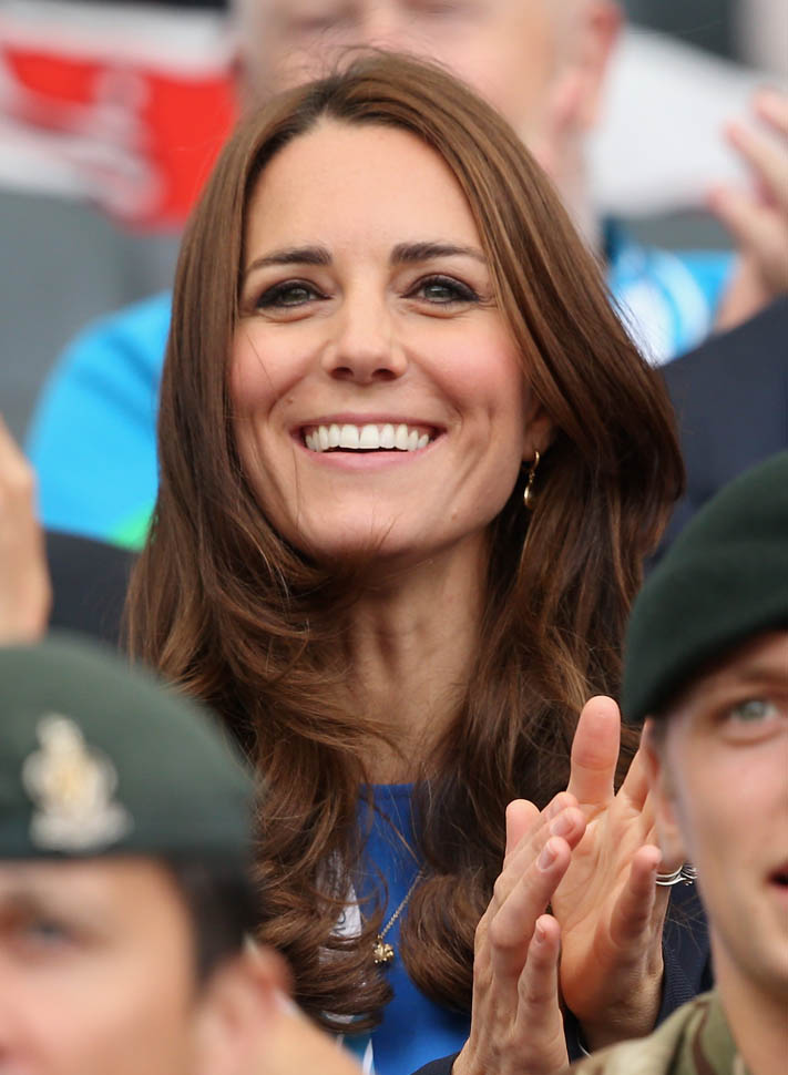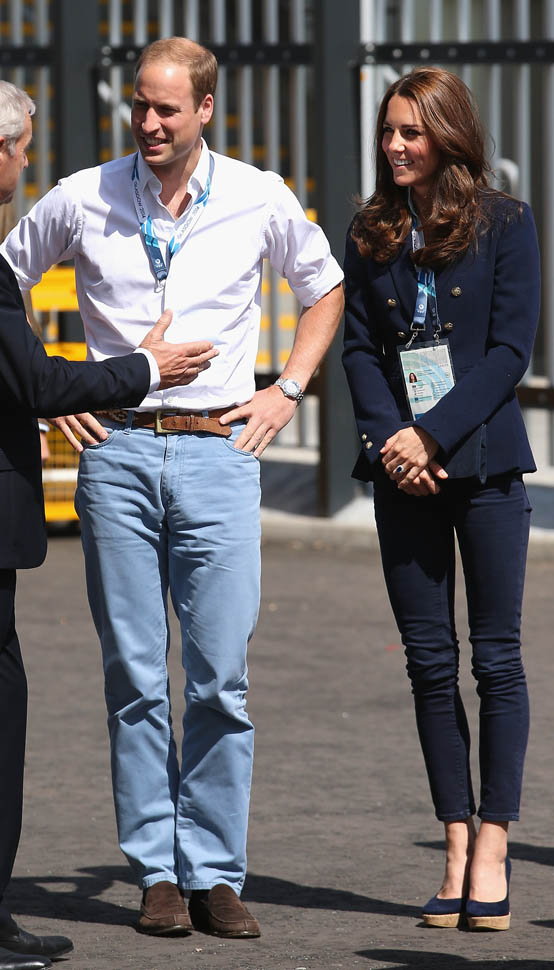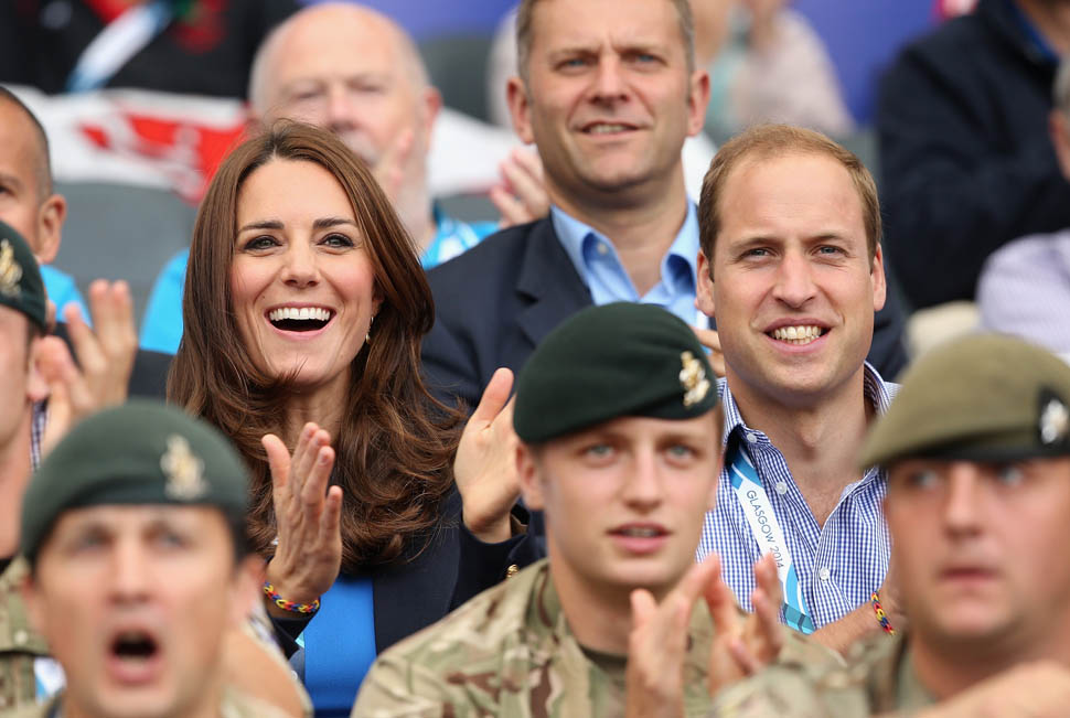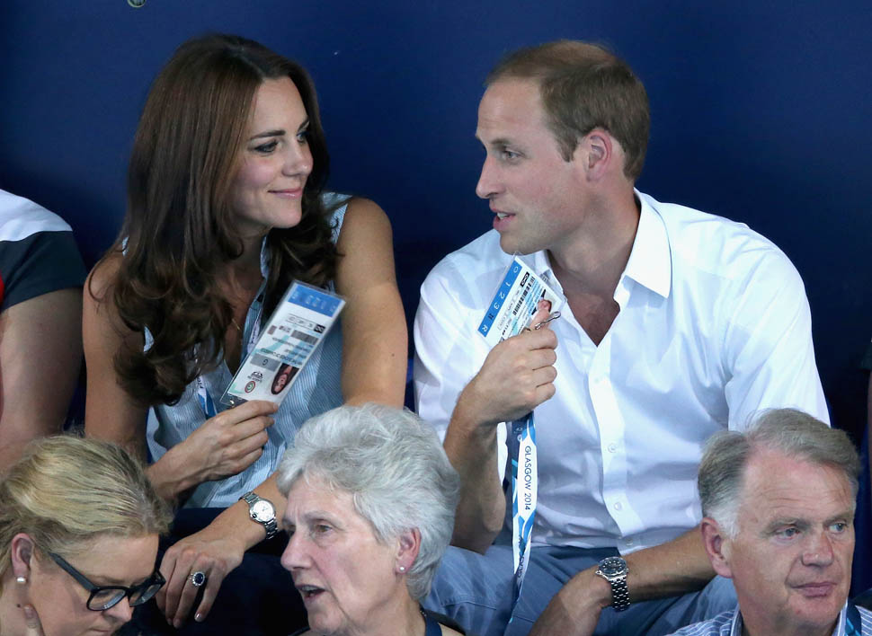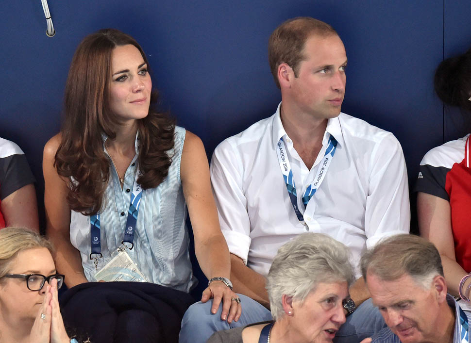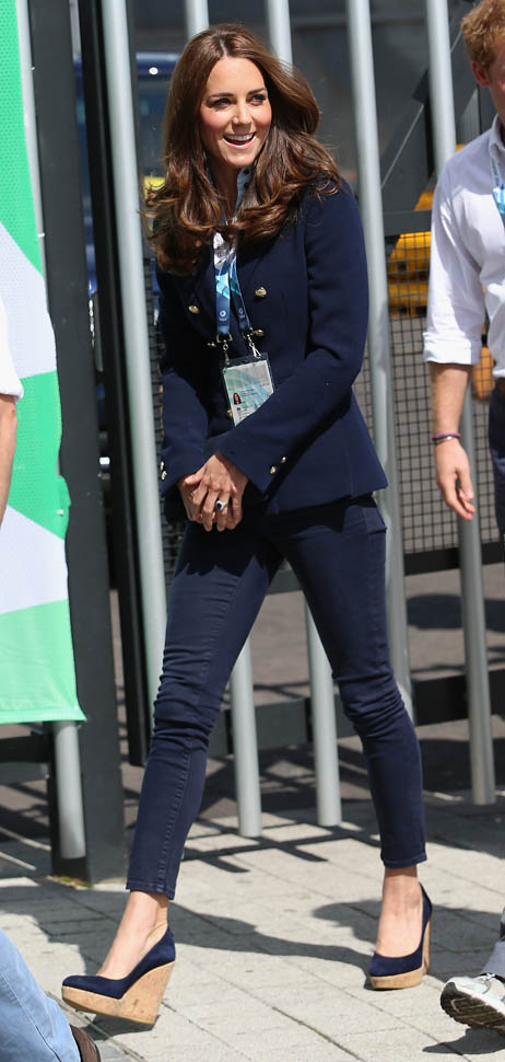 The Cambridges have been in Glasgow the last few days for the Commonwealth Games. Yesterday they were at the swimming centre (she wore a sleeveless shirt under a blazer and pants) and today they were spectators at the athletics competition (in a blue dress).