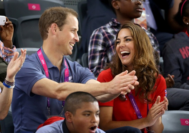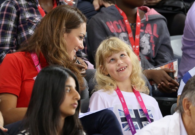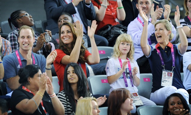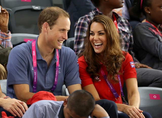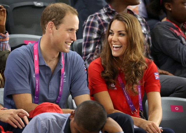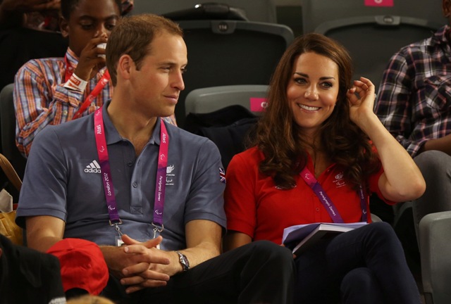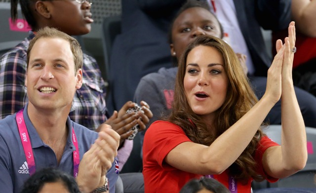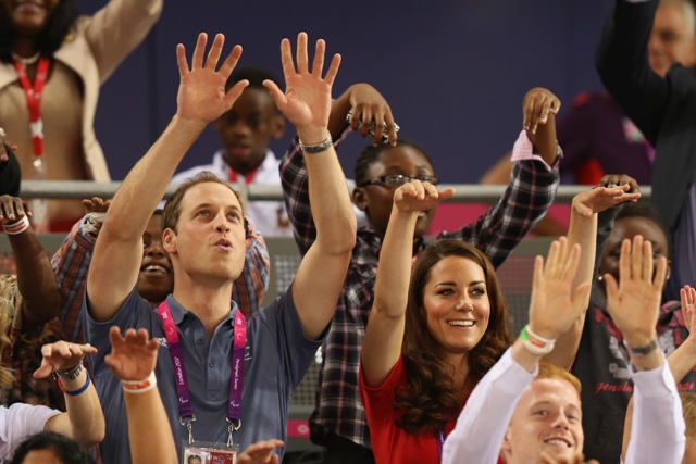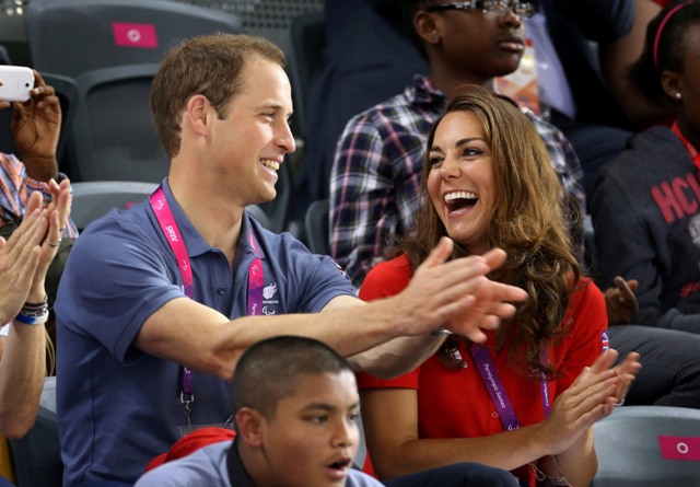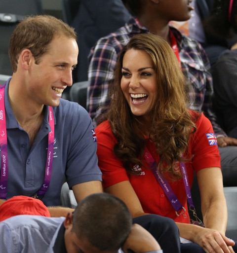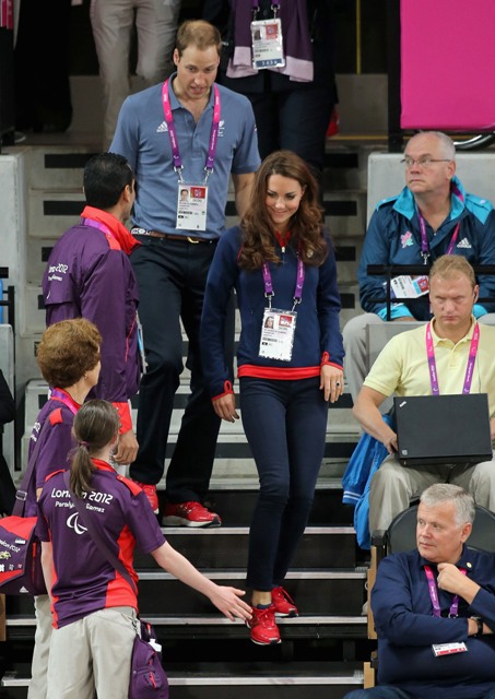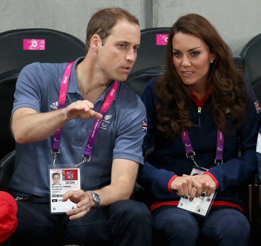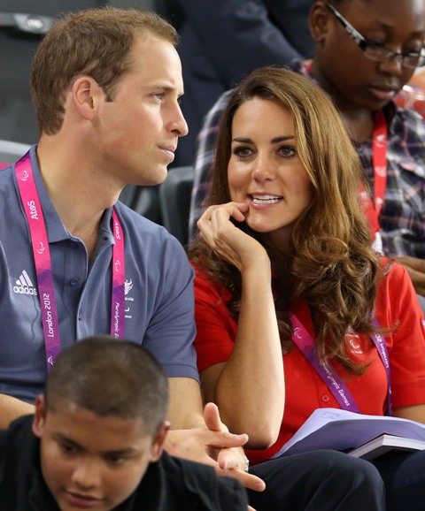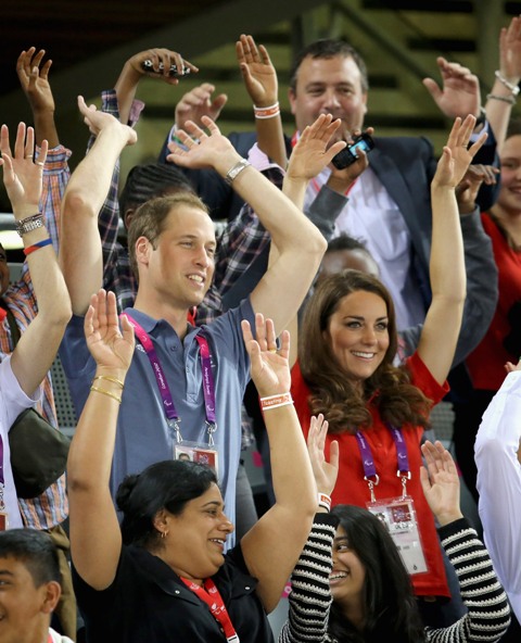 Prince William and his Catherine were at the Opening Ceremony for the Paralympics last night. Click here if you missed those pictures. They were back out today for Goalball (this sh-t is CRAZY and you should try and get a game in if you can) and at the velodrome for track cycling. As you can see, Kate had her English colours on, and an extra huge smile, and they did the wave, and they were sweet with little cousin Louise, as if to say....