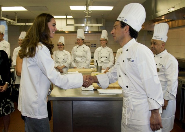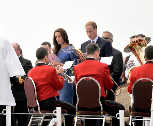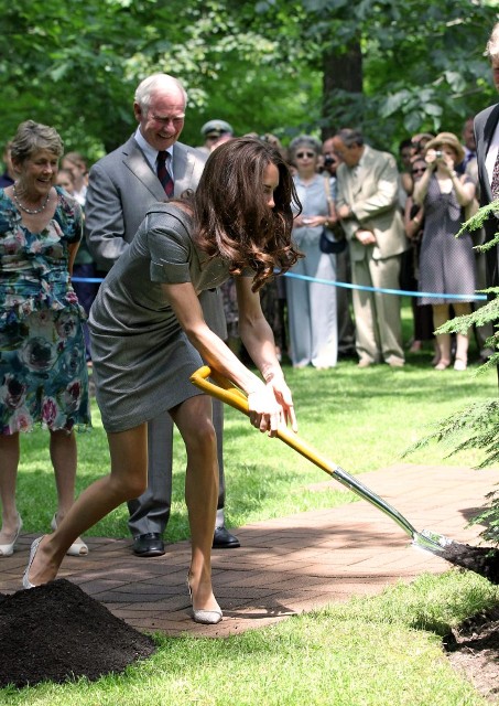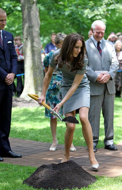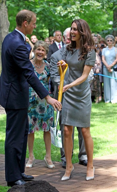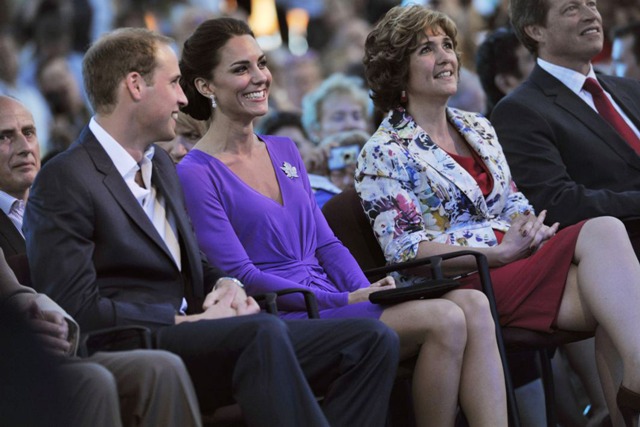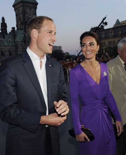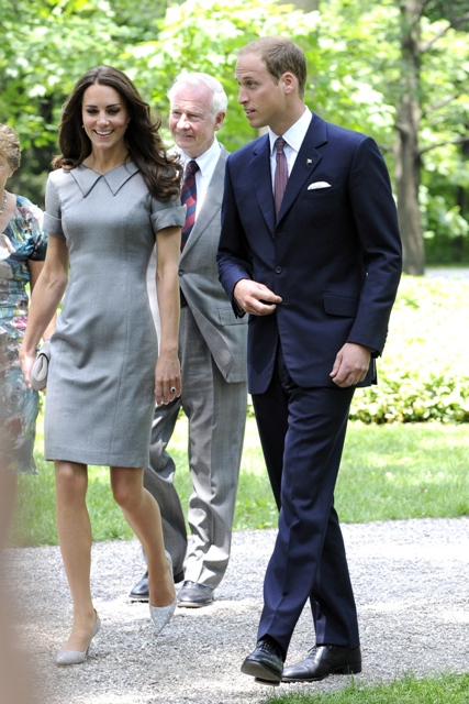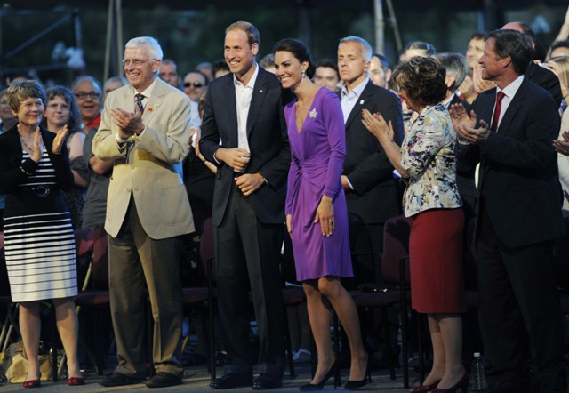 It was such a full schedule, I can barely keep track of all their activities since I last wrote about them on Friday. Have decided then to cover the Royal Tour in Canada by Kate’s outfits. The last outfit posted was the white dress with the maple leaf red hat. After that they attended a Canada Day fireworks show and concert (in purple), they planted a tree (in grey) close to where Charles and Diana planted one many years before (and Will displayed some restrained emotion while reading the plaque), they visited with sick children at Sainte-Justine University Hospital in Montreal (still in grey), they also attended a cooking class and wore chef’s smocks, then it was off to Quebec City (in blue) where they spent time with at-risk youth, and somewhere in there they found time for a rowboat ride and a few hours of romantic quiet time on a lake. Awwwww!!!