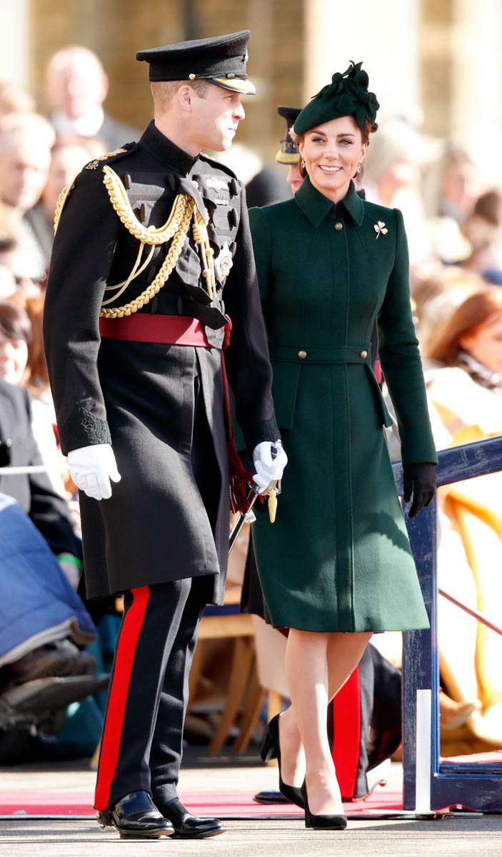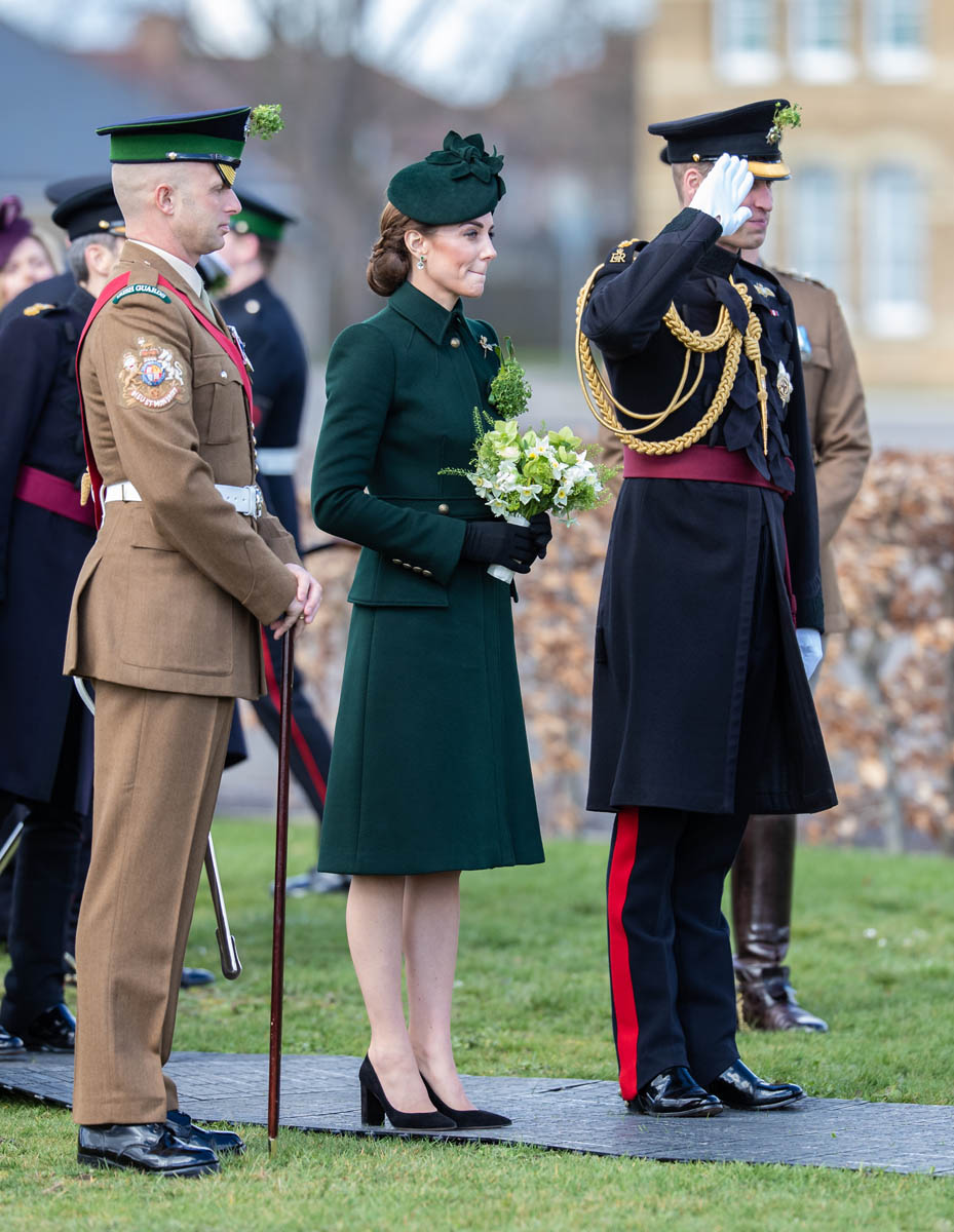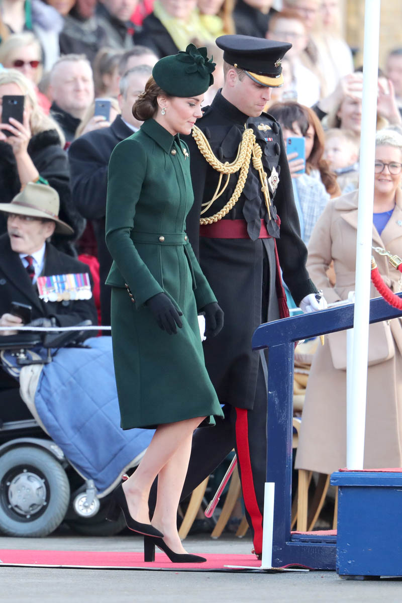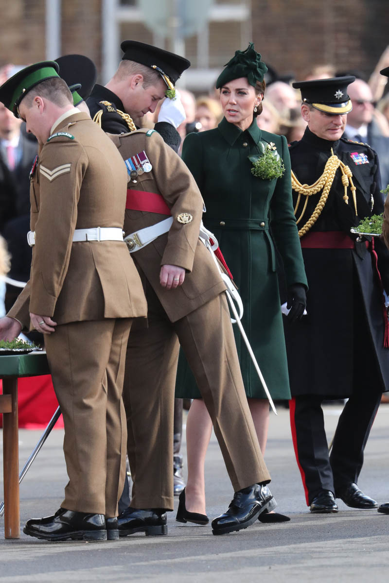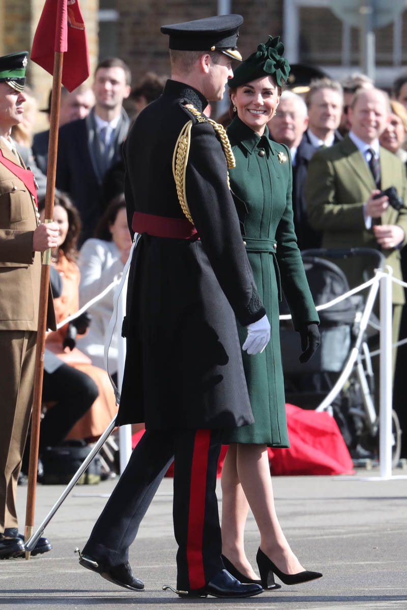 Prince William and Catherine, per tradition, stepped out for the Irish Guards St Patrick’s Day parade yesterday in Hounslow. Kate wore green Alexander McQueen and her brooch is Cartier, a piece that belonged to the Queen Mother.