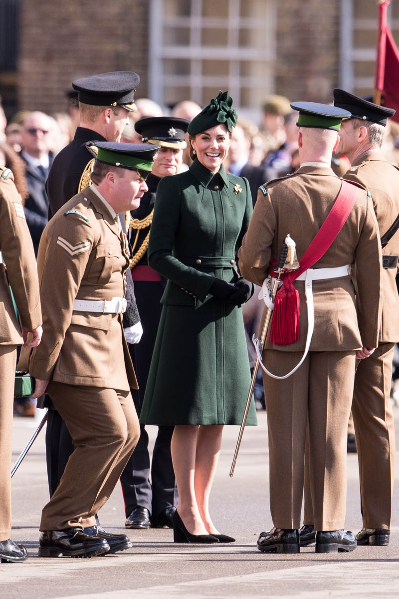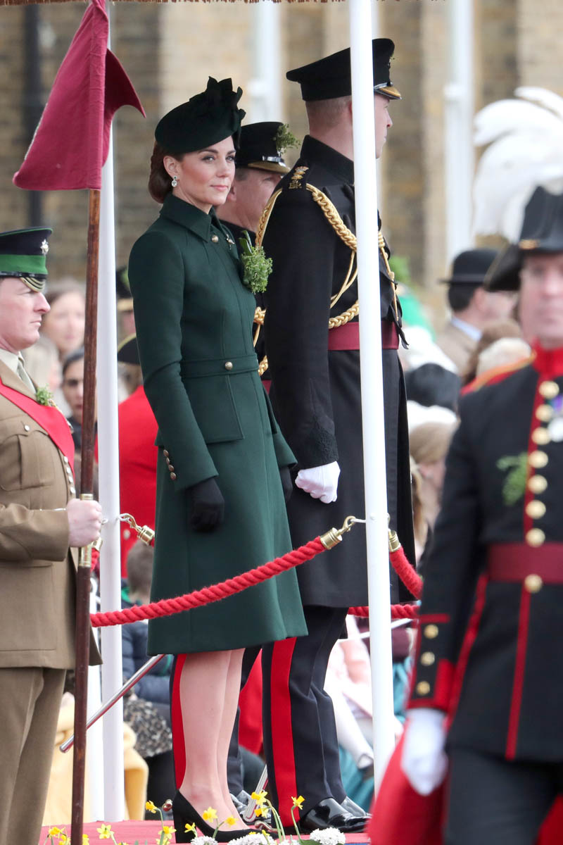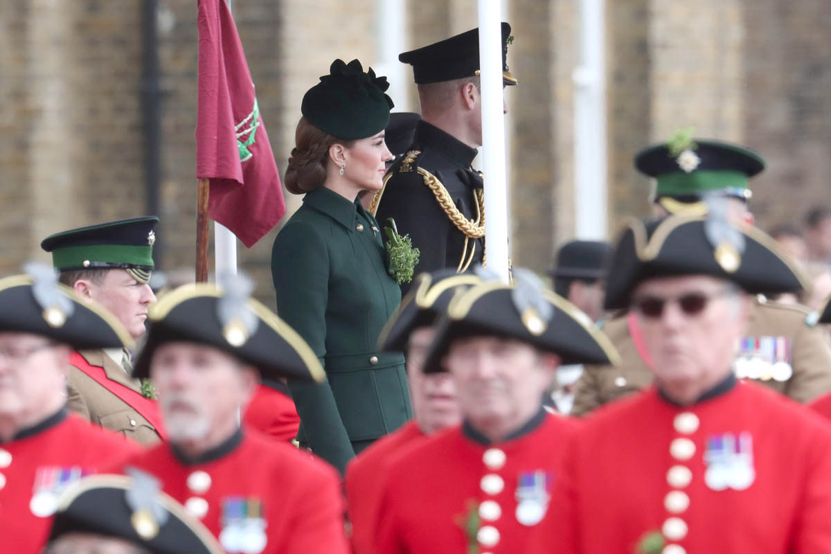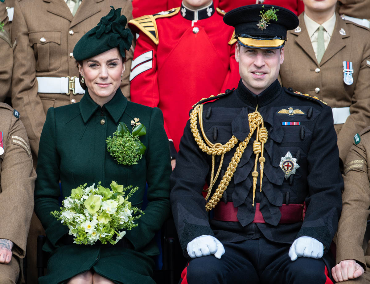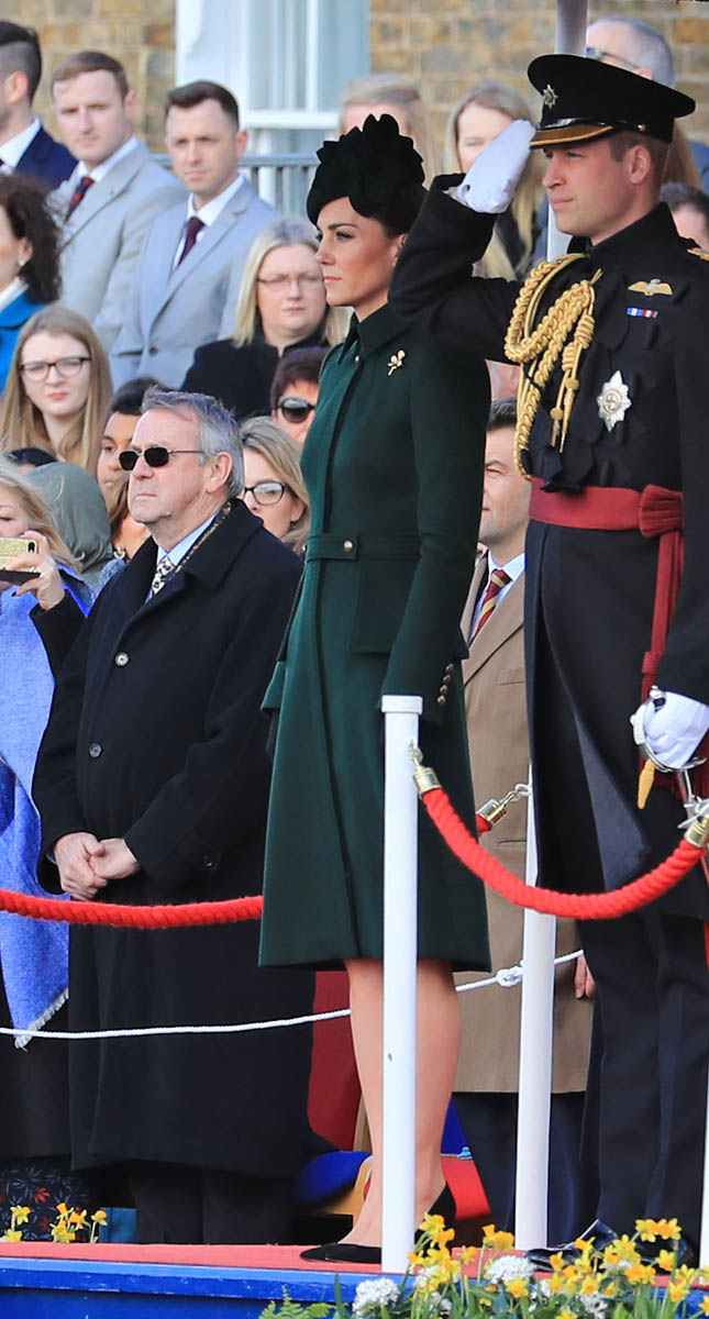 Prince William and Catherine, per tradition, stepped out for the Irish Guards St Patrick’s Day parade yesterday in Hounslow. Kate wore green Alexander McQueen and her brooch is Cartier, a piece that belonged to the Queen Mother.