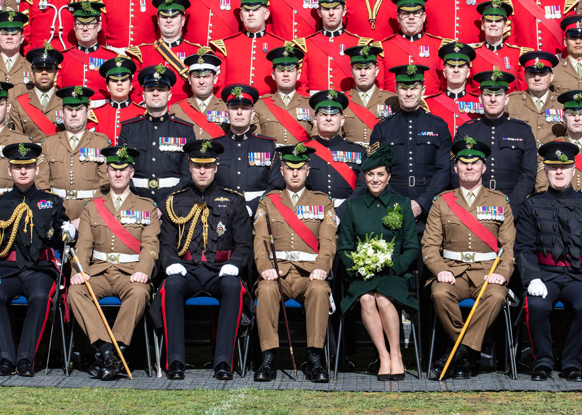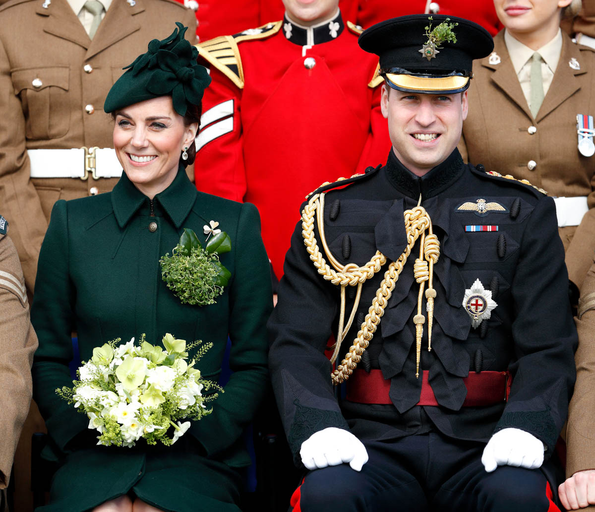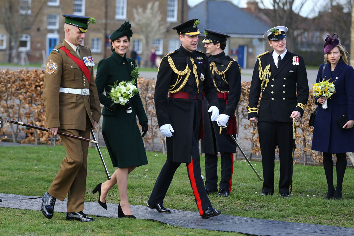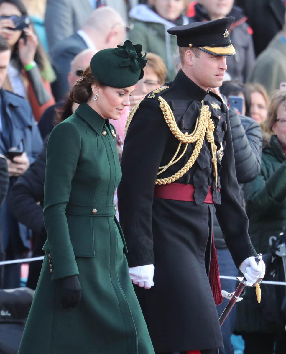 Prince William and Catherine, per tradition, stepped out for the Irish Guards St Patrick’s Day parade yesterday in Hounslow. Kate wore green Alexander McQueen and her brooch is Cartier, a piece that belonged to the Queen Mother.