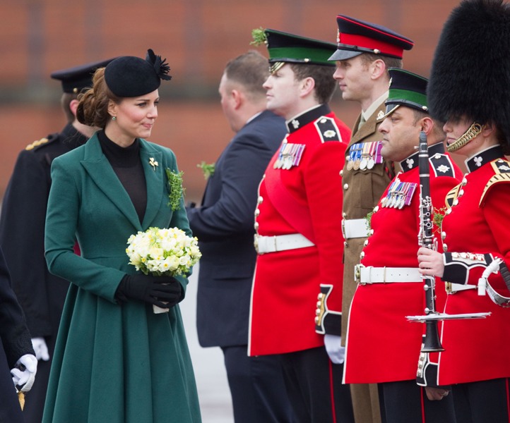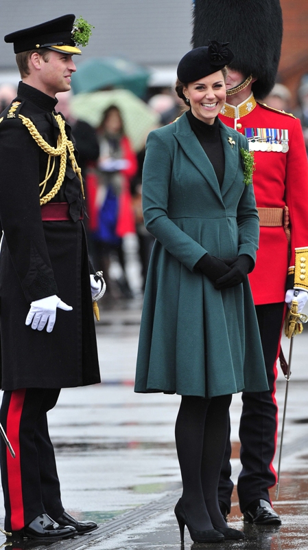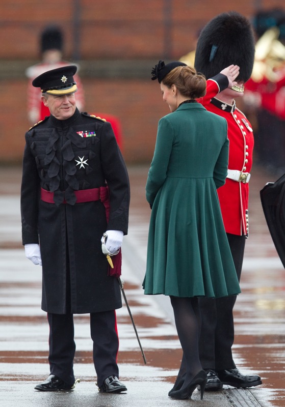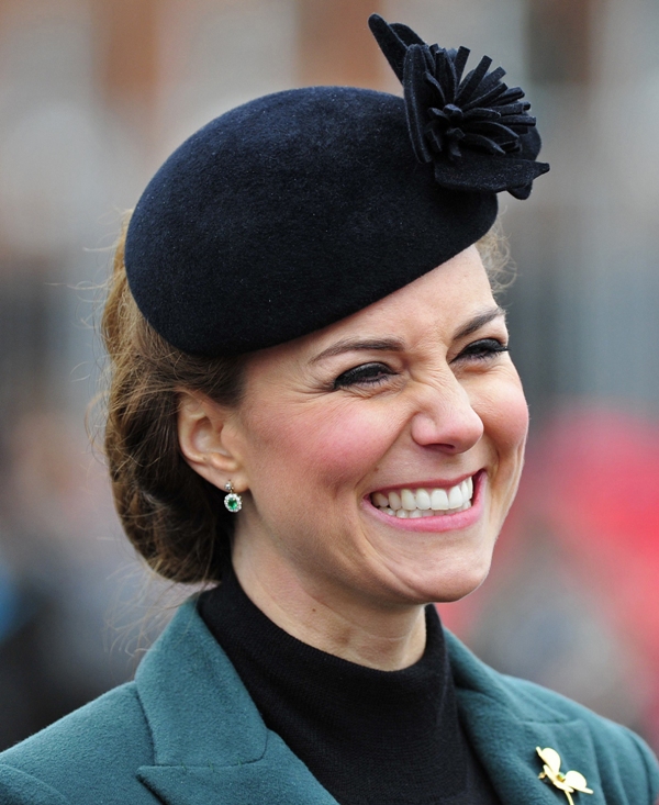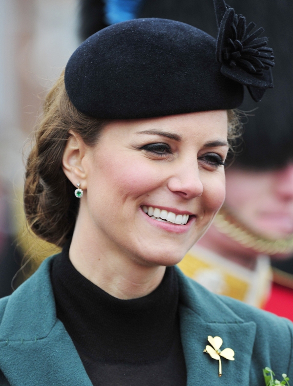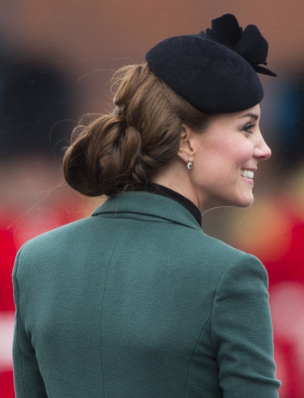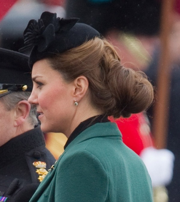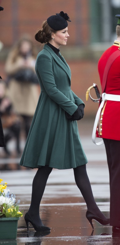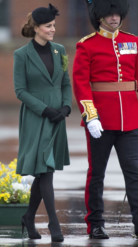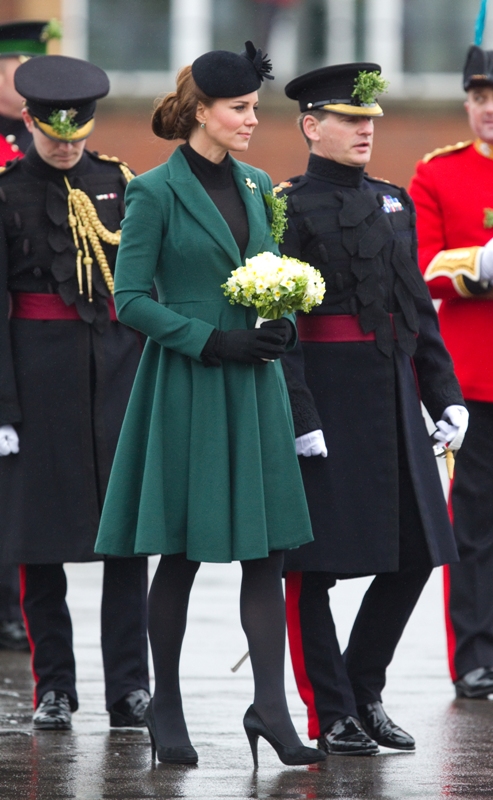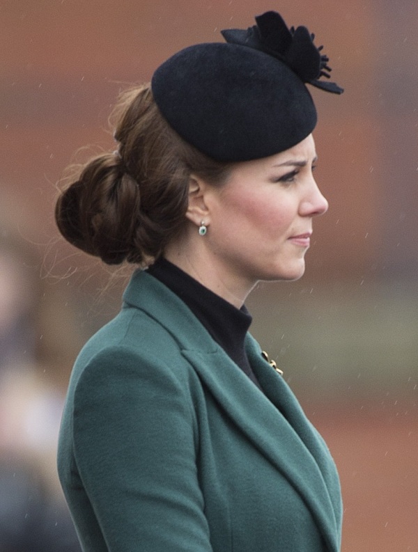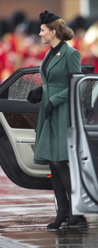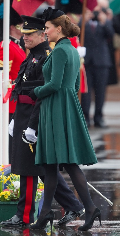Katy Cambridge recycled her green coat. Whatever. Can we focus instead on that really, REALLY bad hairstyle?
