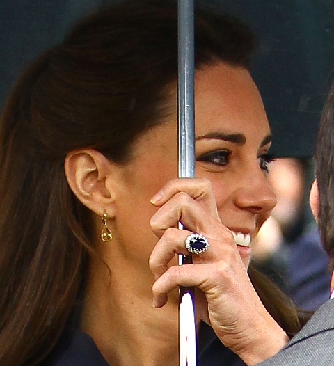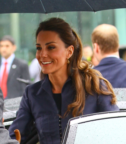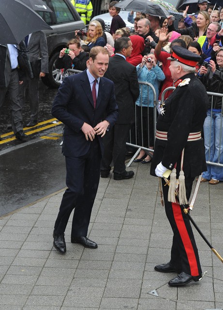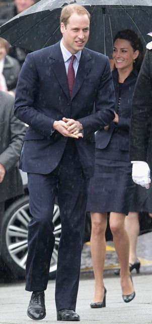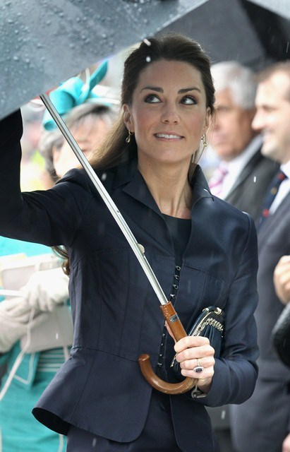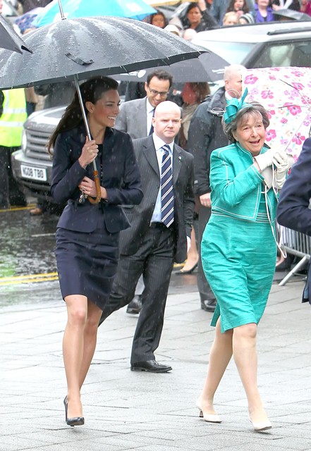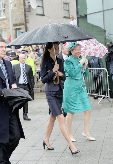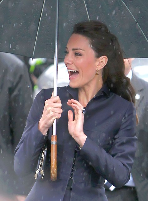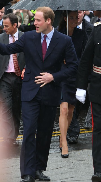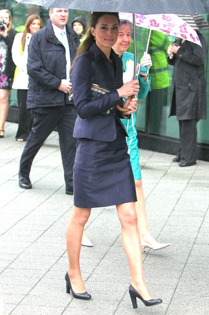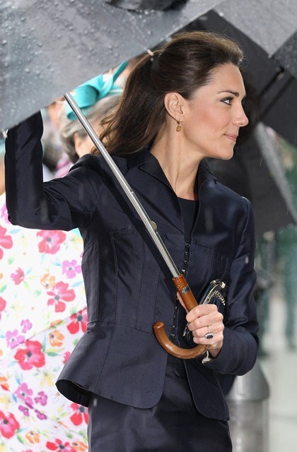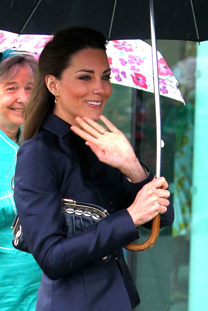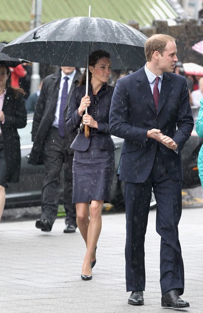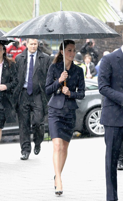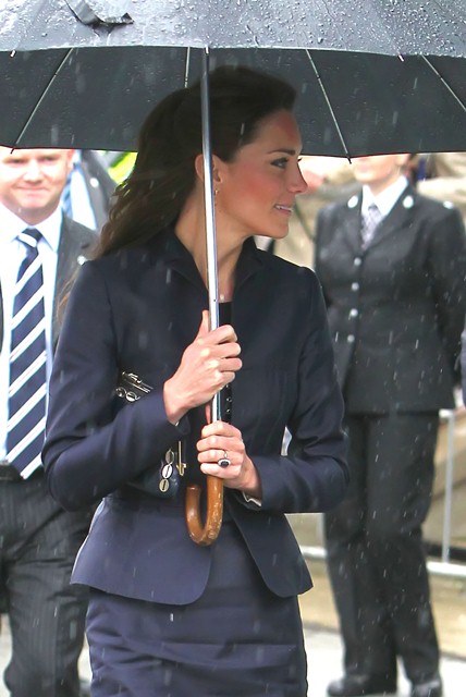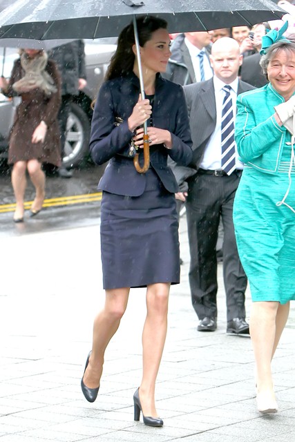 It’s their final official engagement together before the Wedding. The wedding is 18 days away. Today Prince William and Kate Middleton were in Darwen, Lancashire for the opening of a school. And, well, since it’s the UK and since it’s April, it was raining. Kate held her own black umbrella. The British press are all jizzy about it, noting that she opted not to use the clear ones that the Queen uses, instead lifting a standard one above her head to allow onlookers to see her. This is why I love the royal sh-t. Everything is a major production. Even umbrellas!