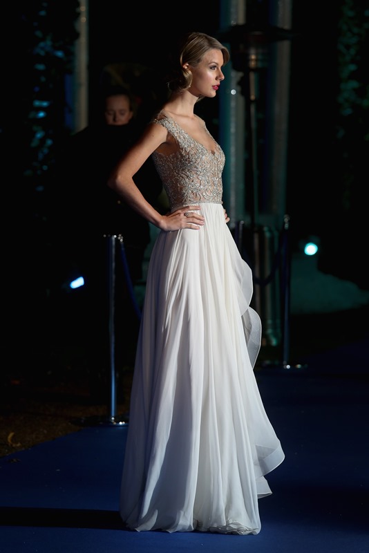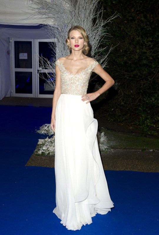 Katy Cambridge isn’t going. The Palace says she was never confirmed to attend the event. As you can see by the invitation though, her name is on it for a “private reception” -- for donors contributing at minimum 50 thousand pounds. I guess she’s missing the Taylor Swift part then. Here's Taylor in winter white with a silver lace bodice at the gala. I quite like it for the occasion and it's something I wish Catherine would consider for herself. It’s very…