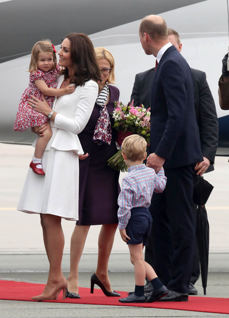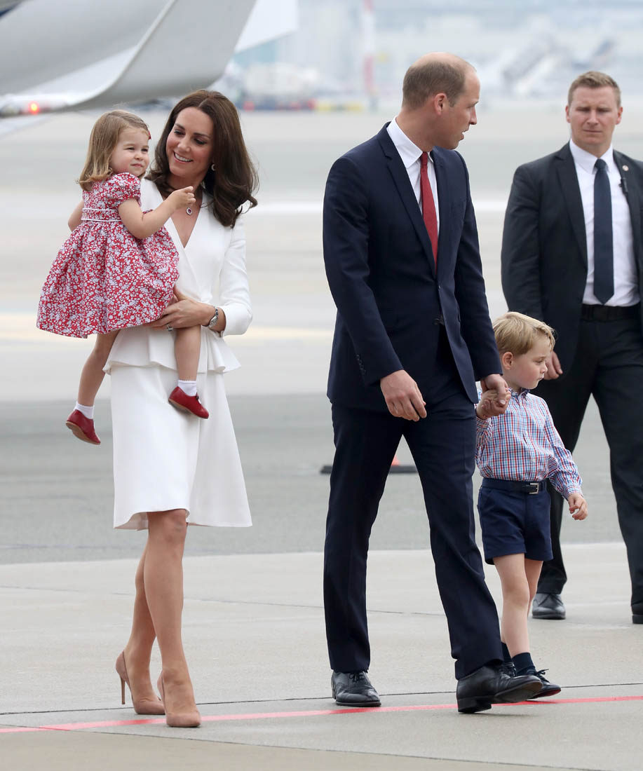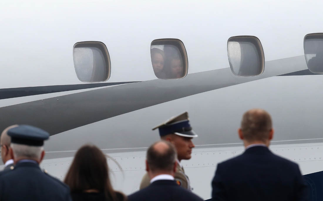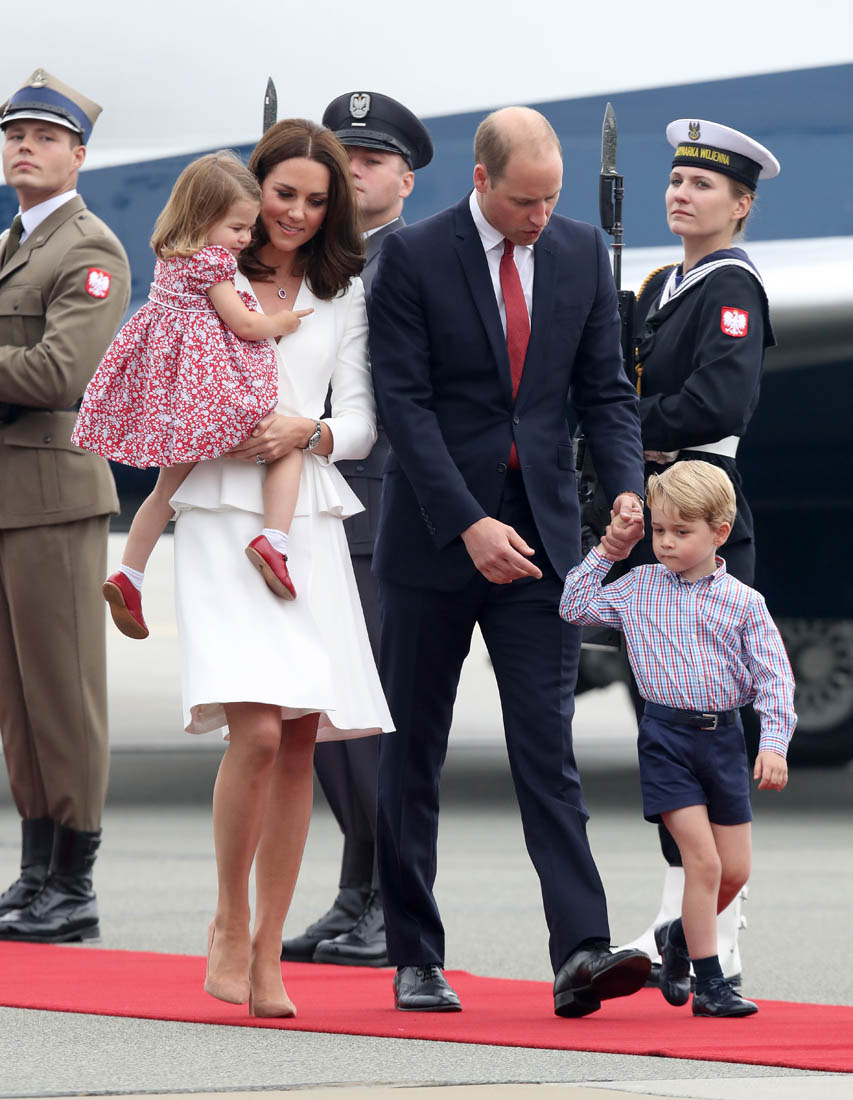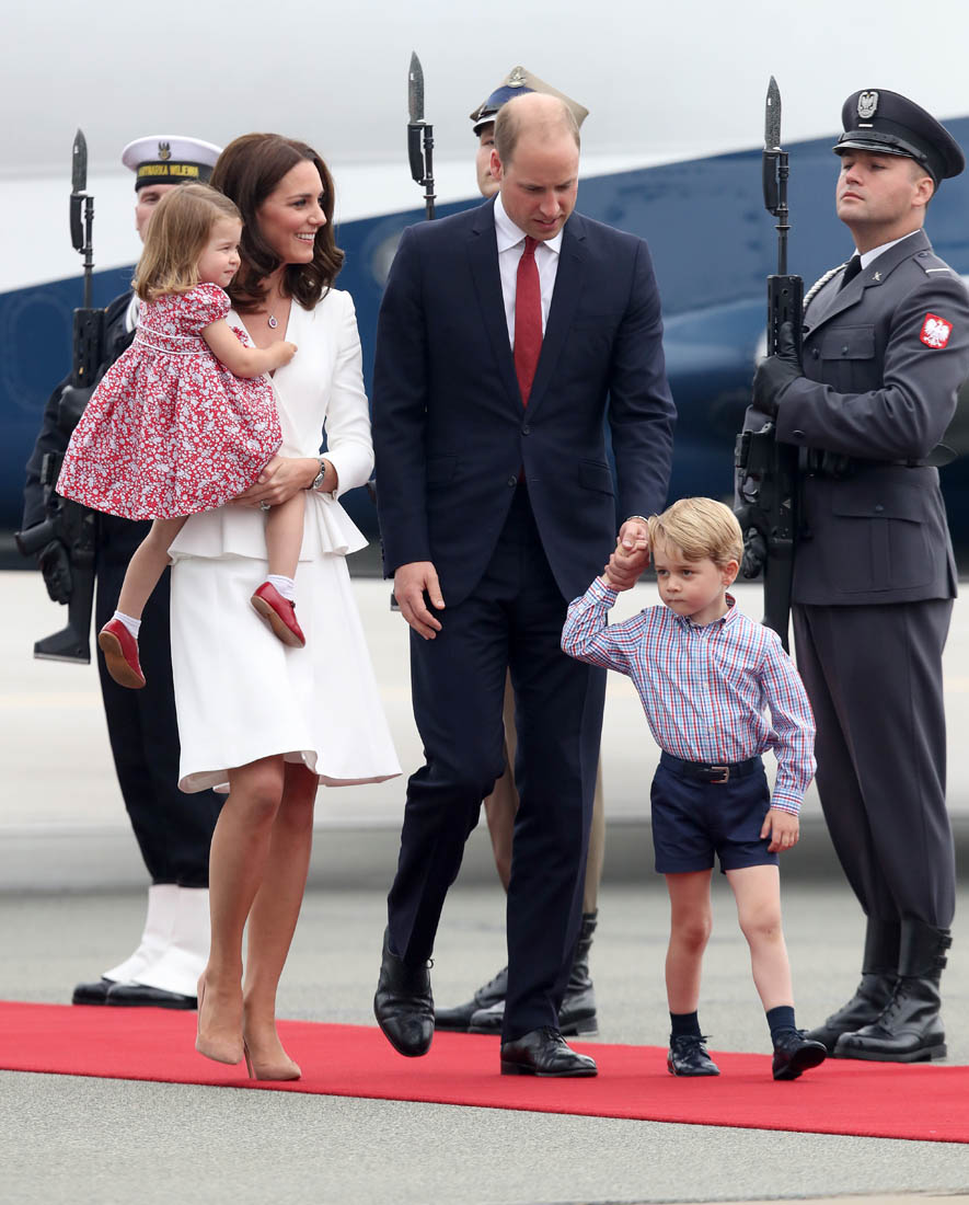 Prince William, Catherine, Big G, and Charlotte are touring Poland and Germany for the next five days. They kicked off the trip today in Warsaw. I love the shots of Big G and Charlotte with their heads at the window on the plane before they came out to meet everyone. What are they told in those moments? “Look at all the people waiting, just to meet YOU!”