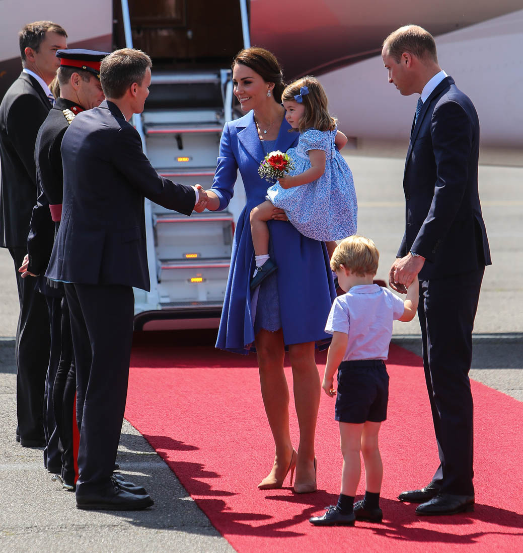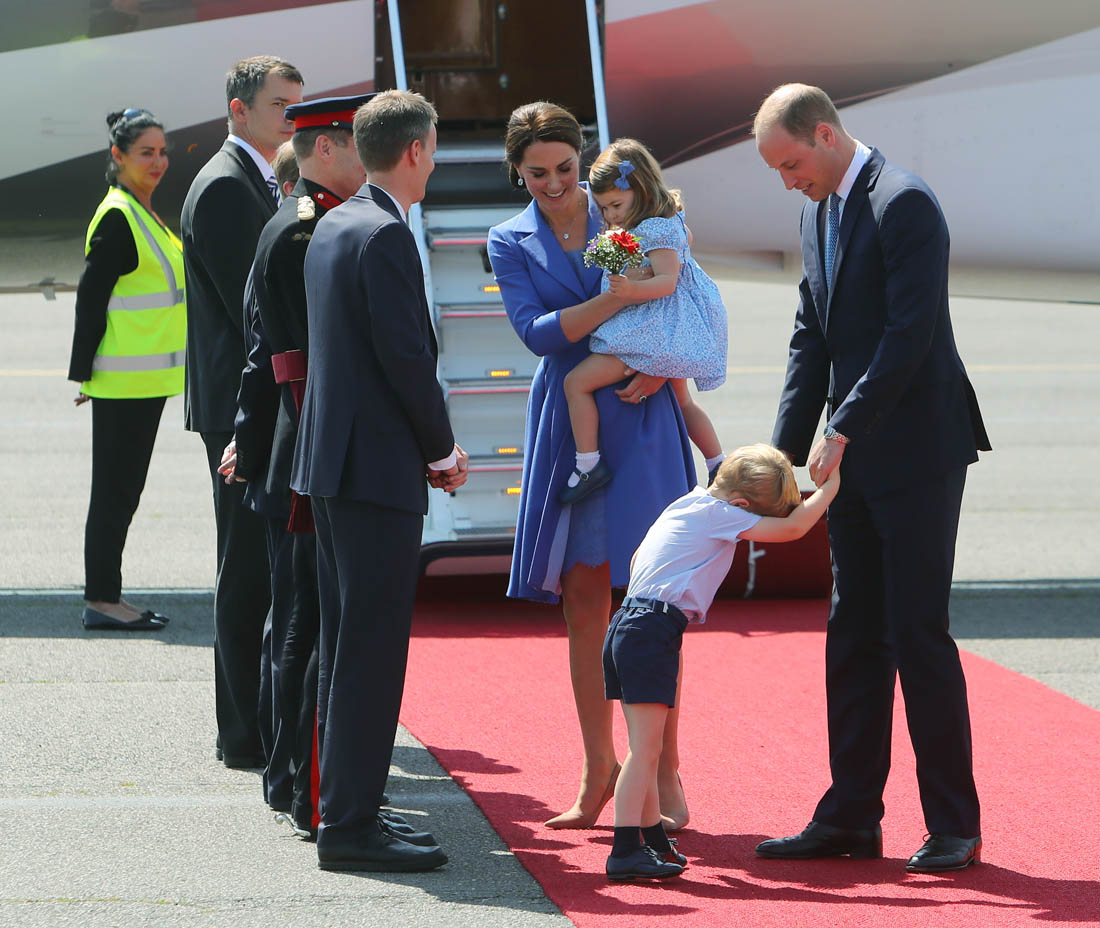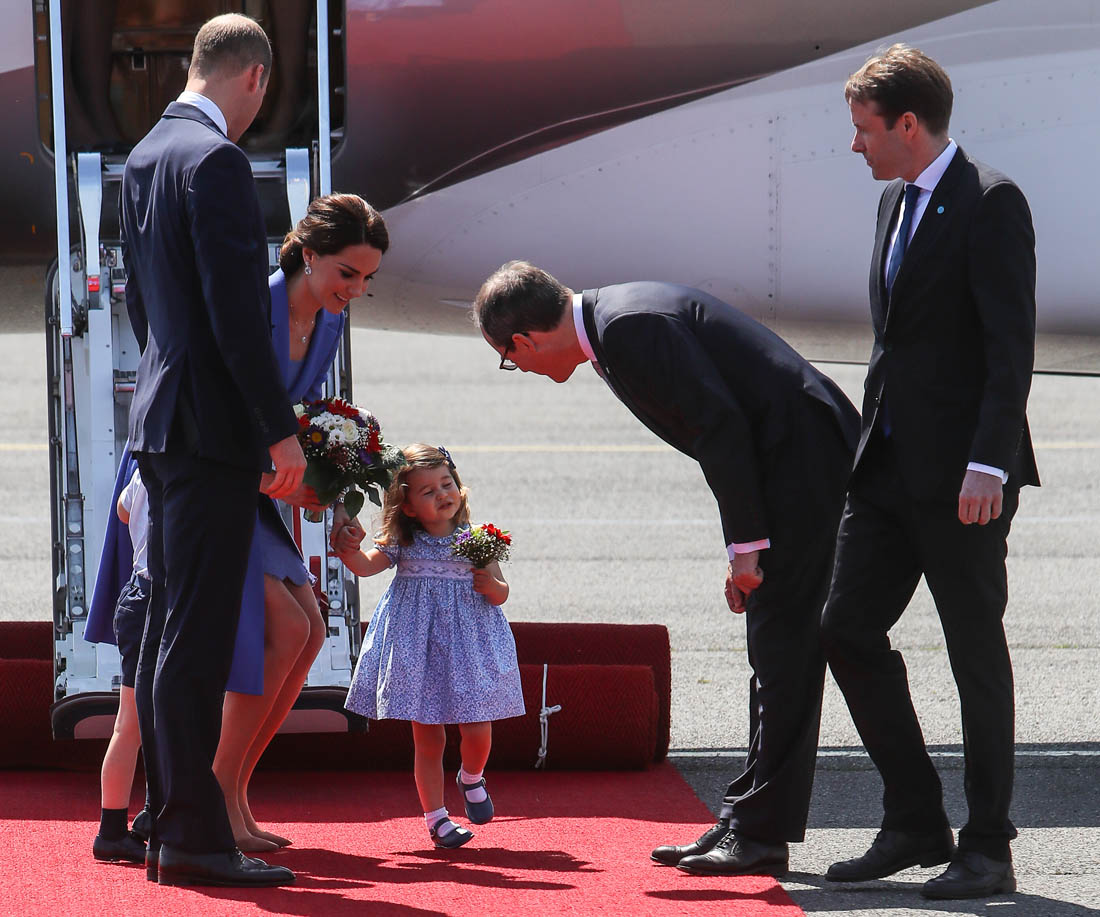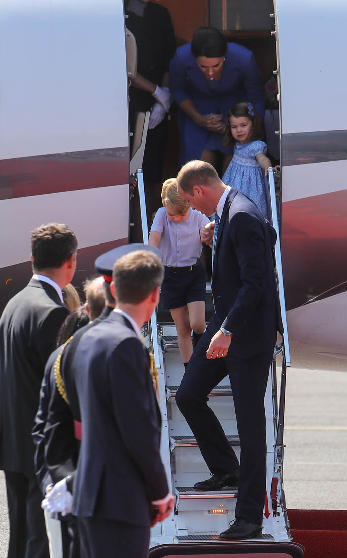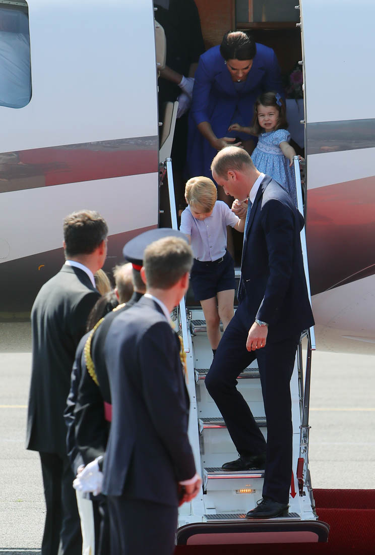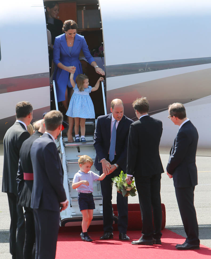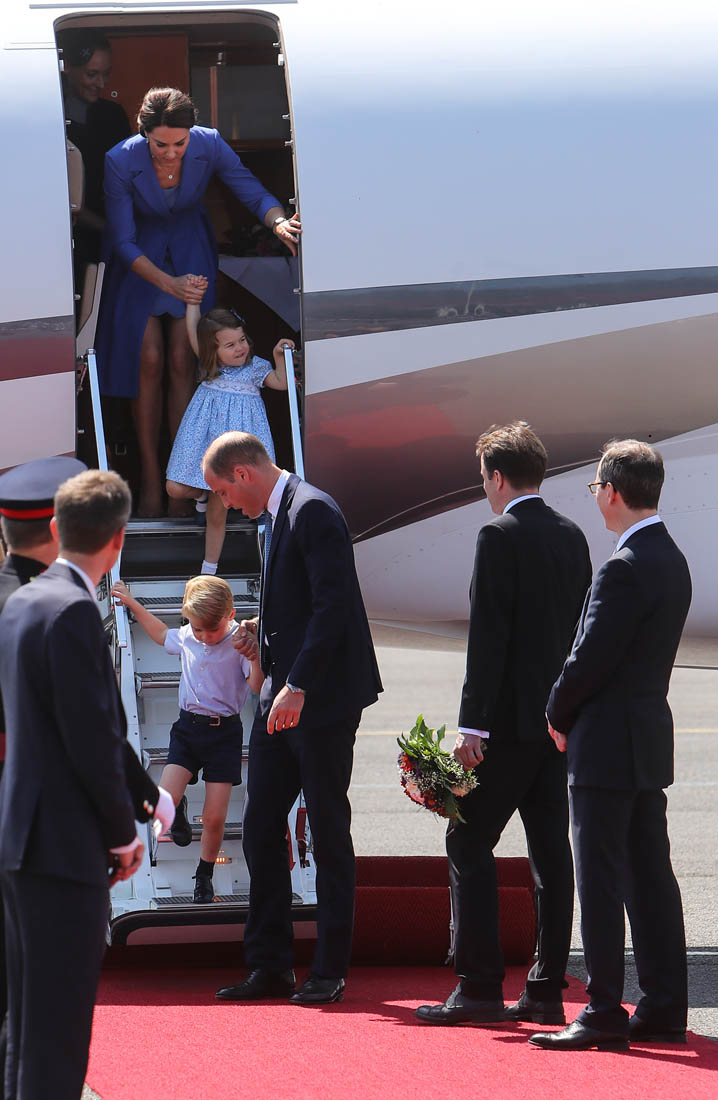 The Cambridge Four arrived in Berlin today for the second leg of their trip this week to Poland and Germany. As was the case when they touched down in Warsaw, Princess Charlotte seemed excited by the adventure, happily smiling for the crowds, and she looks curious too, as you can see her looking up from time to time to ask her mother questions. At least that’s how I’m reading the photos. She’s also eager to try – check out this shot of her climbing up the steps by herself.