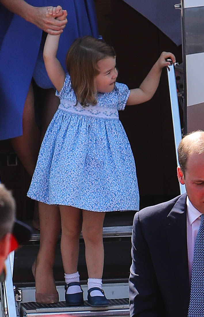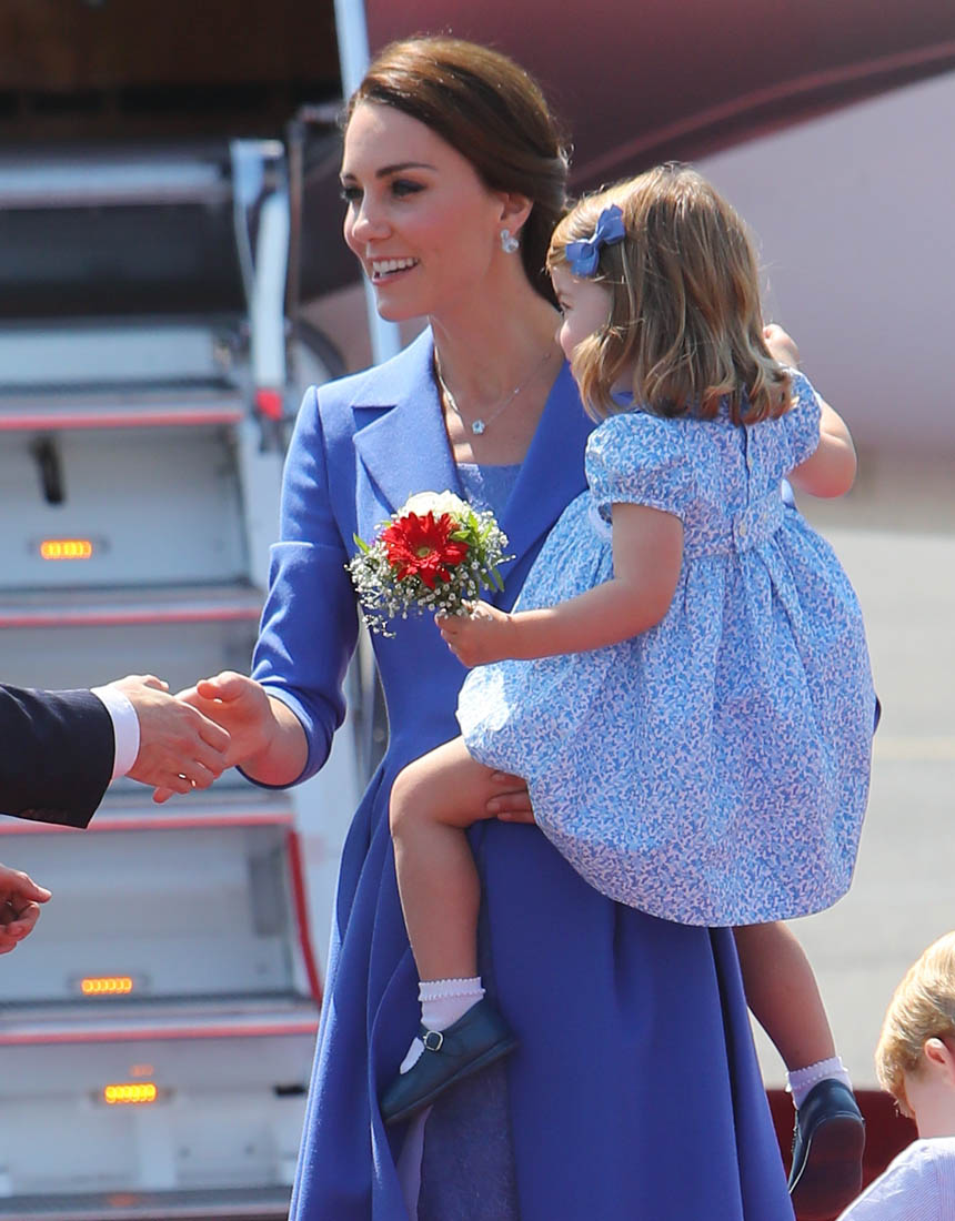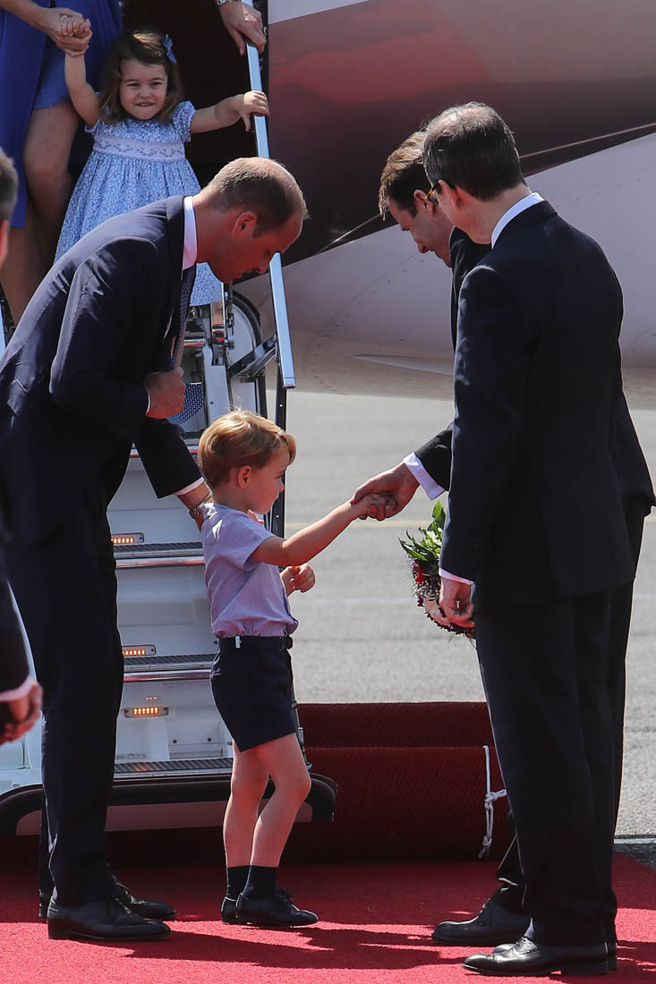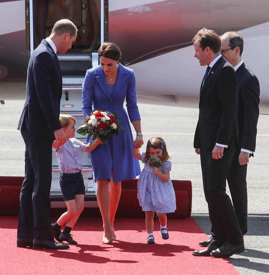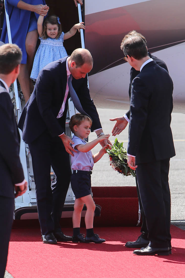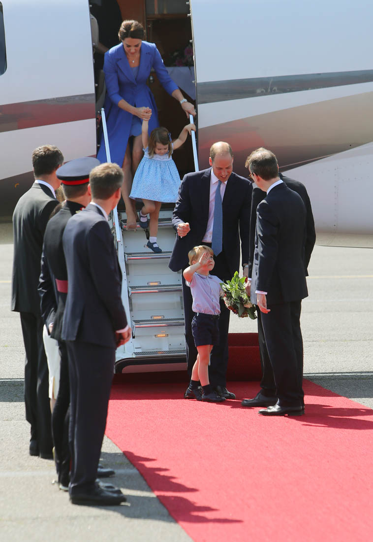 The Cambridge Four arrived in Berlin today for the second leg of their trip this week to Poland and Germany. As was the case when they touched down in Warsaw, Princess Charlotte seemed excited by the adventure, happily smiling for the crowds, and she looks curious too, as you can see her looking up from time to time to ask her mother questions. At least that’s how I’m reading the photos. She’s also eager to try – check out this shot of her climbing up the steps by herself.