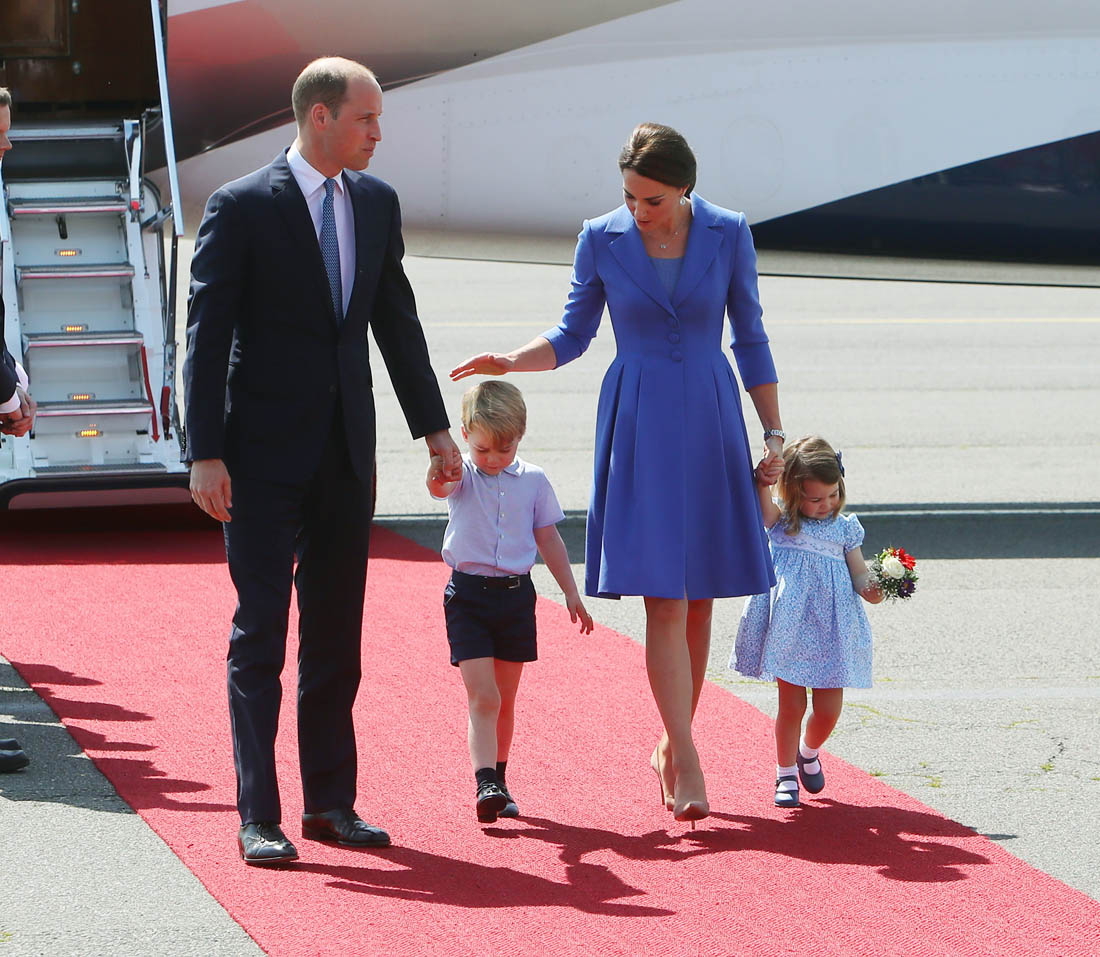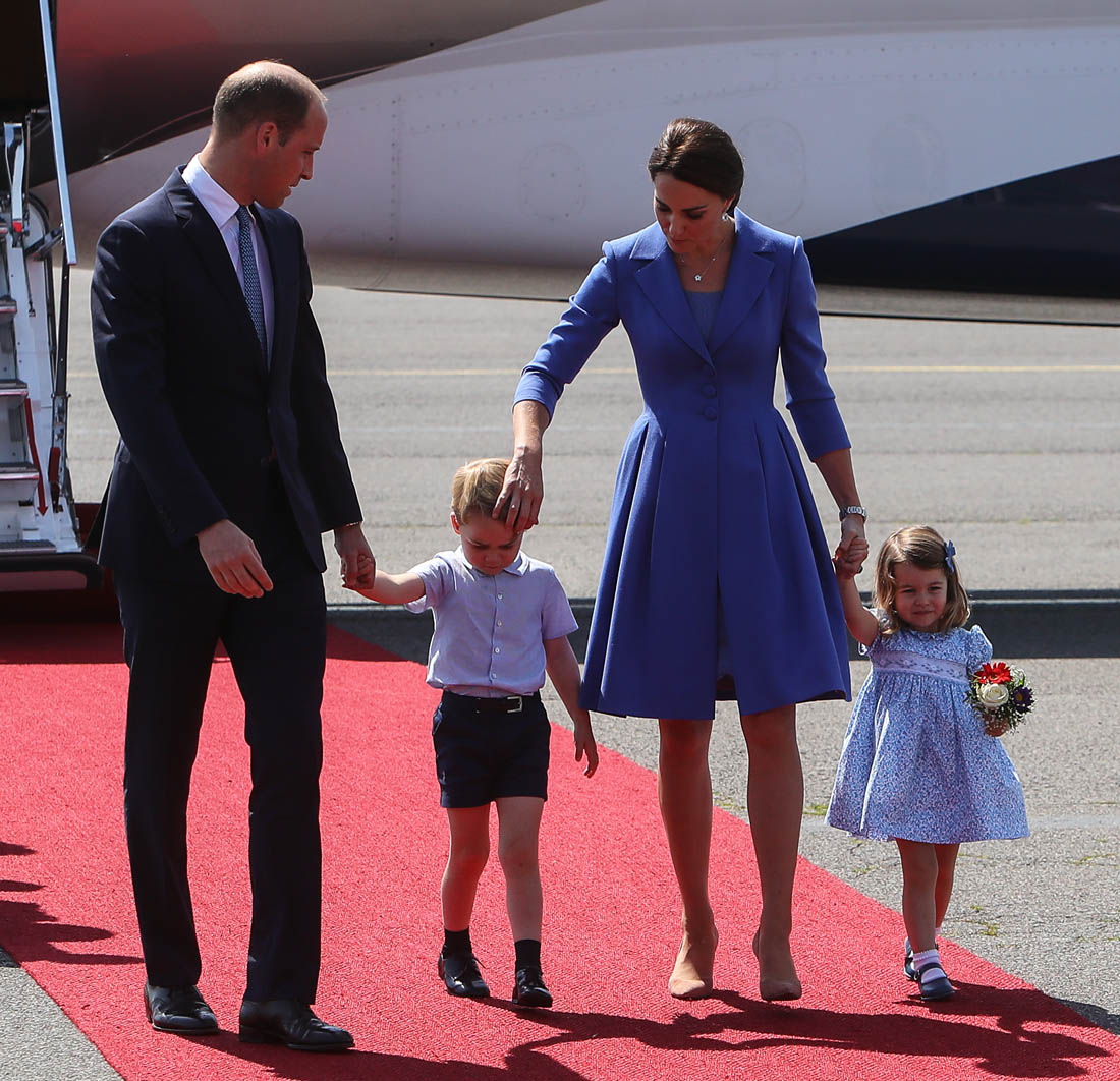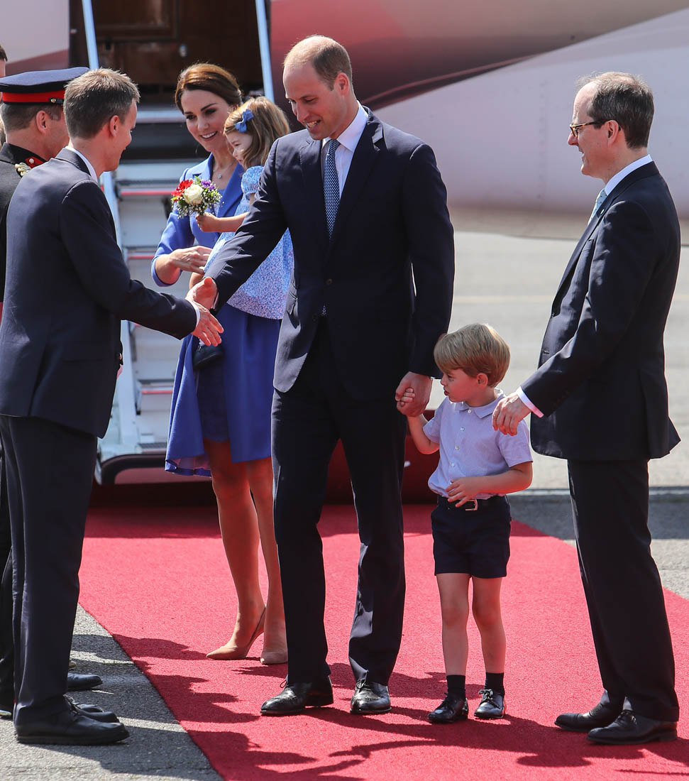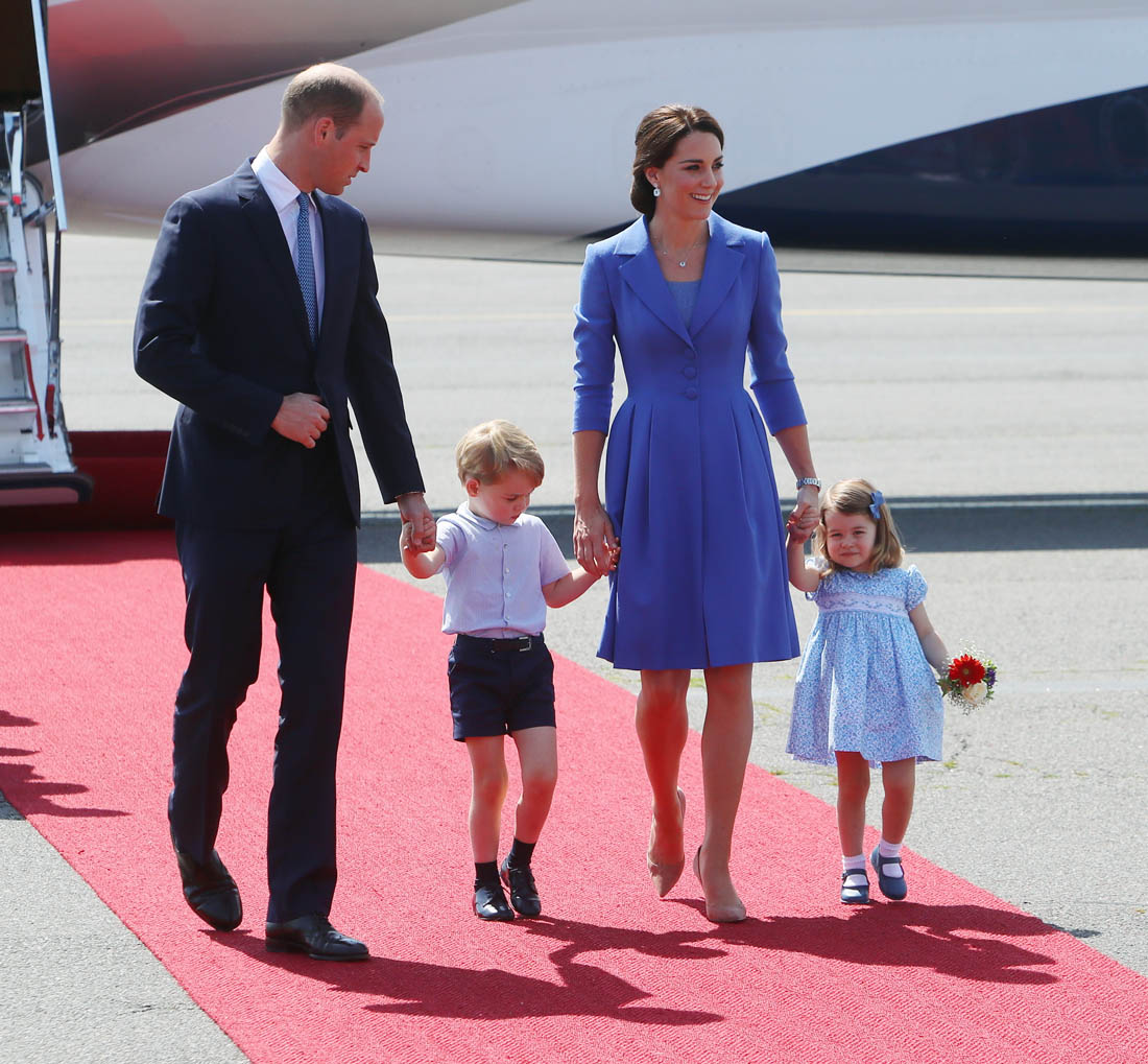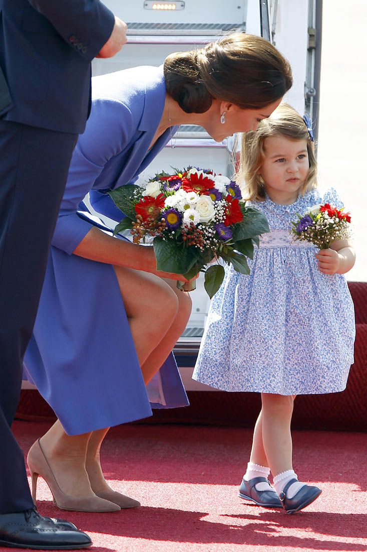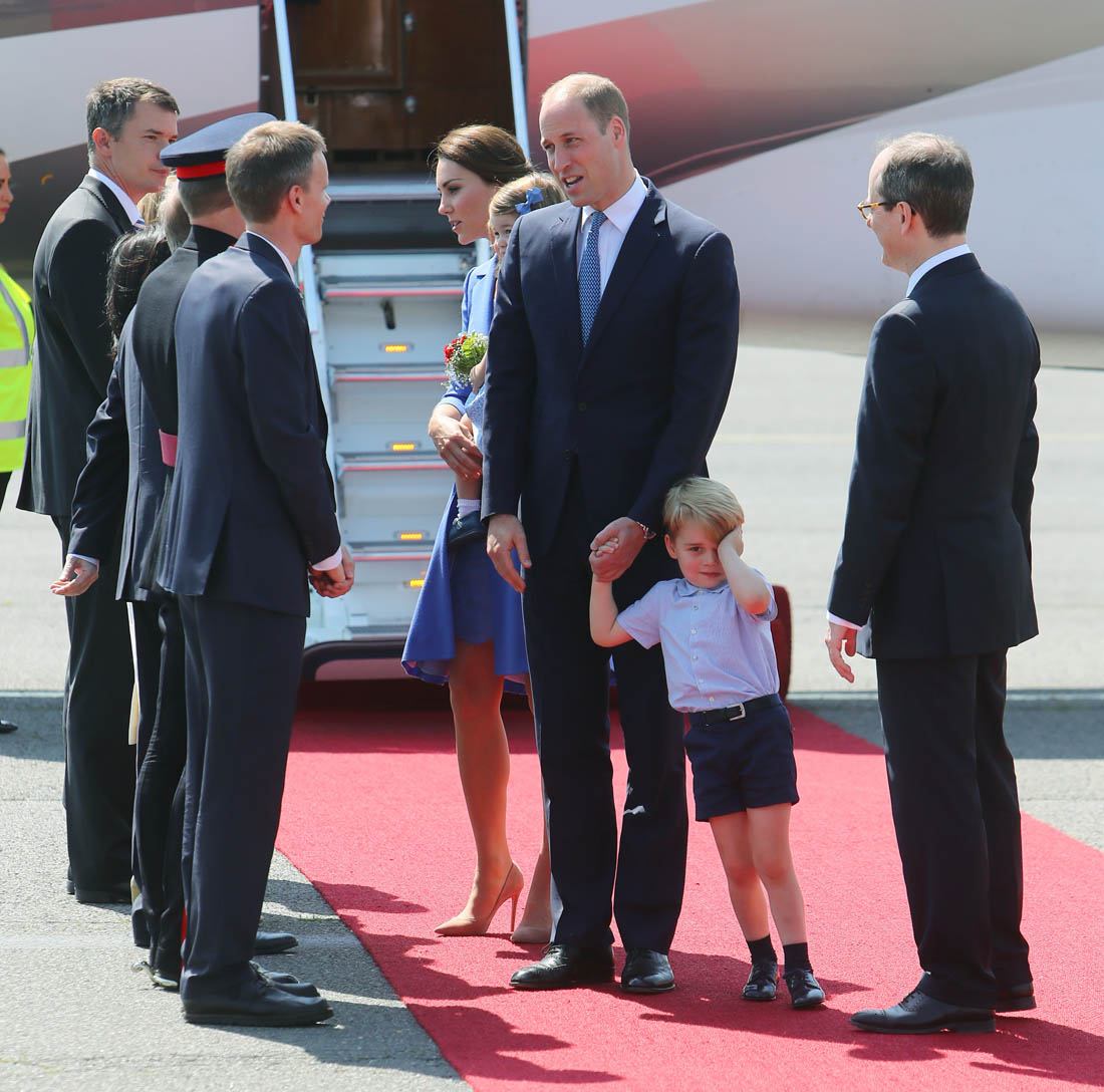 The Cambridge Four arrived in Berlin today for the second leg of their trip this week to Poland and Germany. As was the case when they touched down in Warsaw, Princess Charlotte seemed excited by the adventure, happily smiling for the crowds, and she looks curious too, as you can see her looking up from time to time to ask her mother questions. At least that’s how I’m reading the photos. She’s also eager to try – check out this shot of her climbing up the steps by herself.