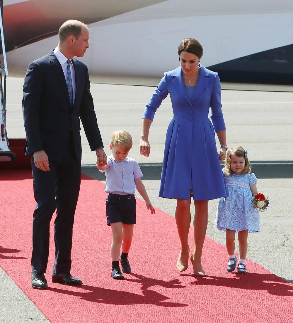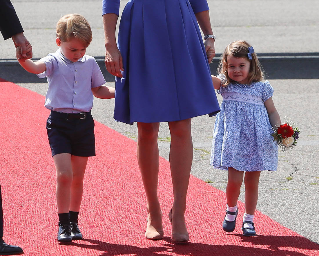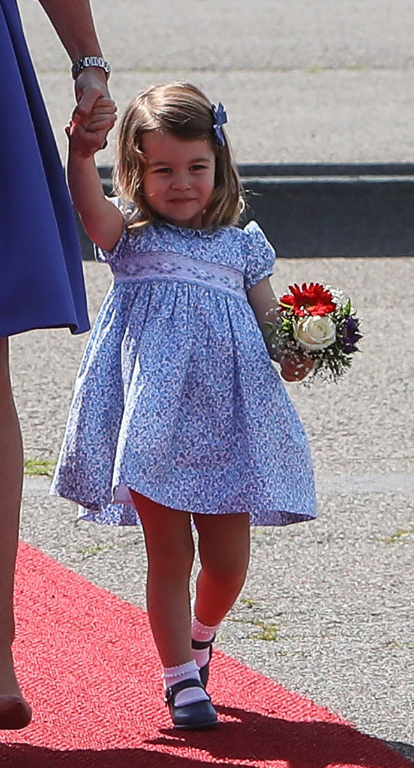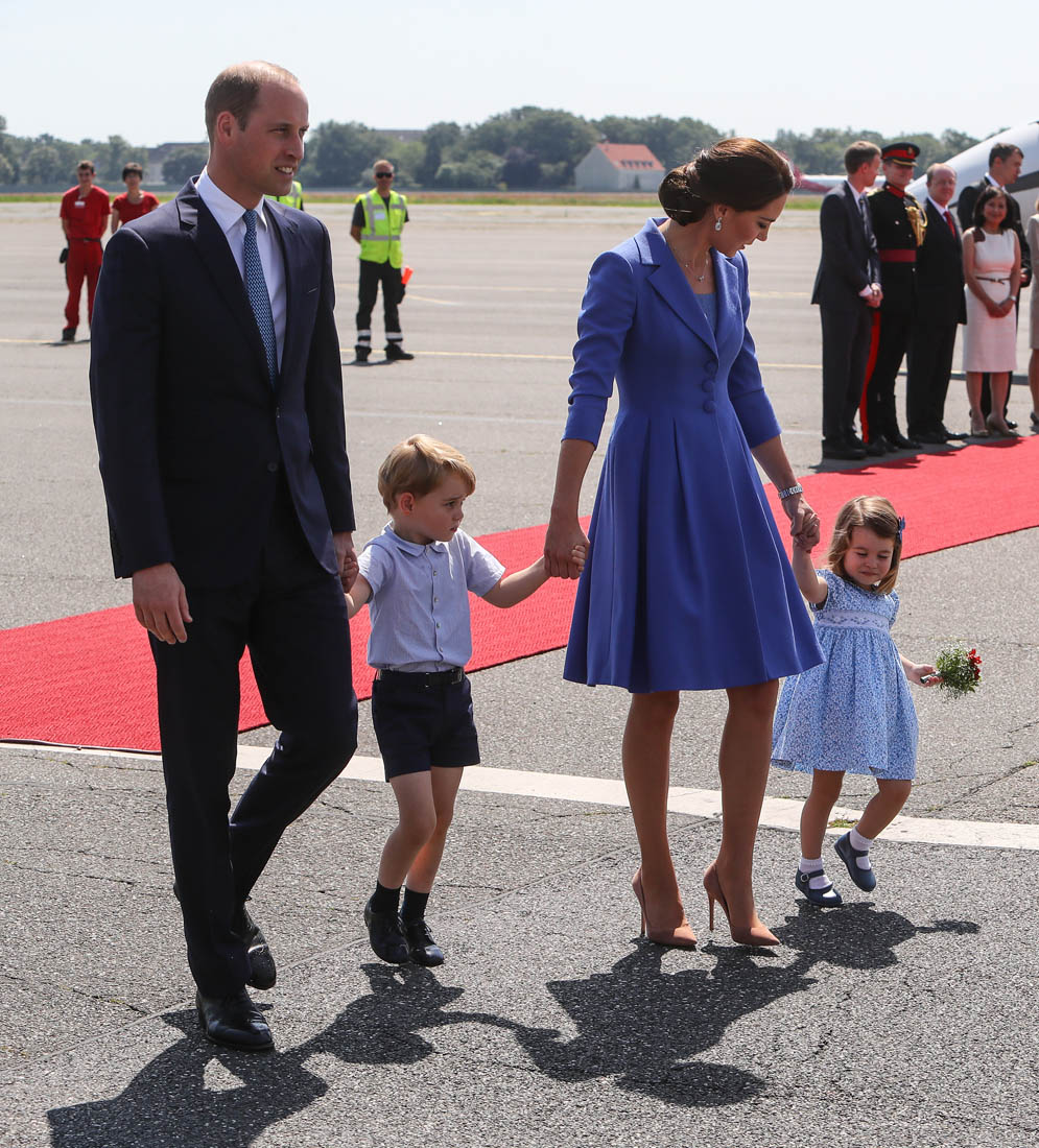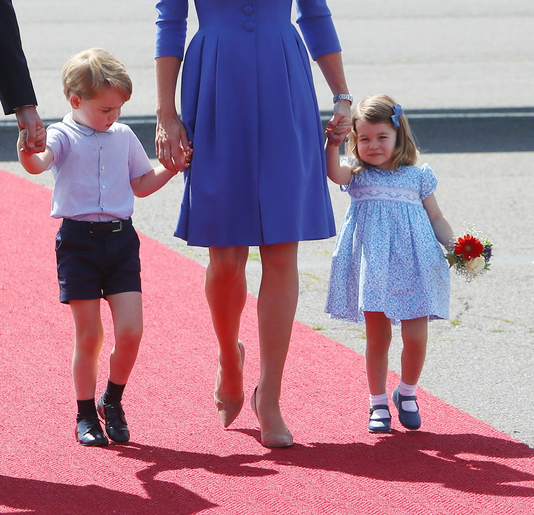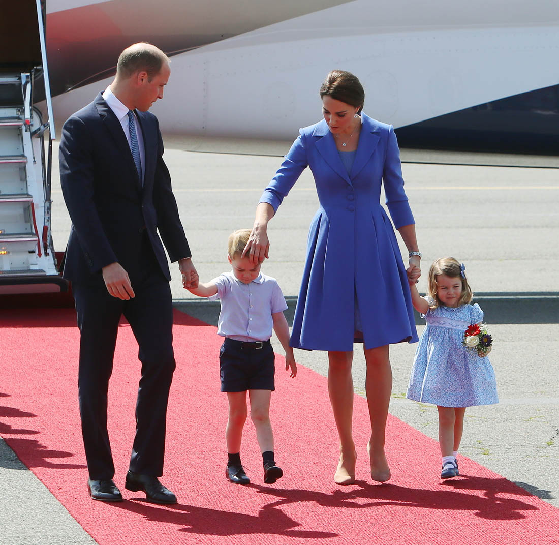 The Cambridge Four arrived in Berlin today for the second leg of their trip this week to Poland and Germany. As was the case when they touched down in Warsaw, Princess Charlotte seemed excited by the adventure, happily smiling for the crowds, and she looks curious too, as you can see her looking up from time to time to ask her mother questions. At least that’s how I’m reading the photos. She’s also eager to try – check out this shot of her climbing up the steps by herself.