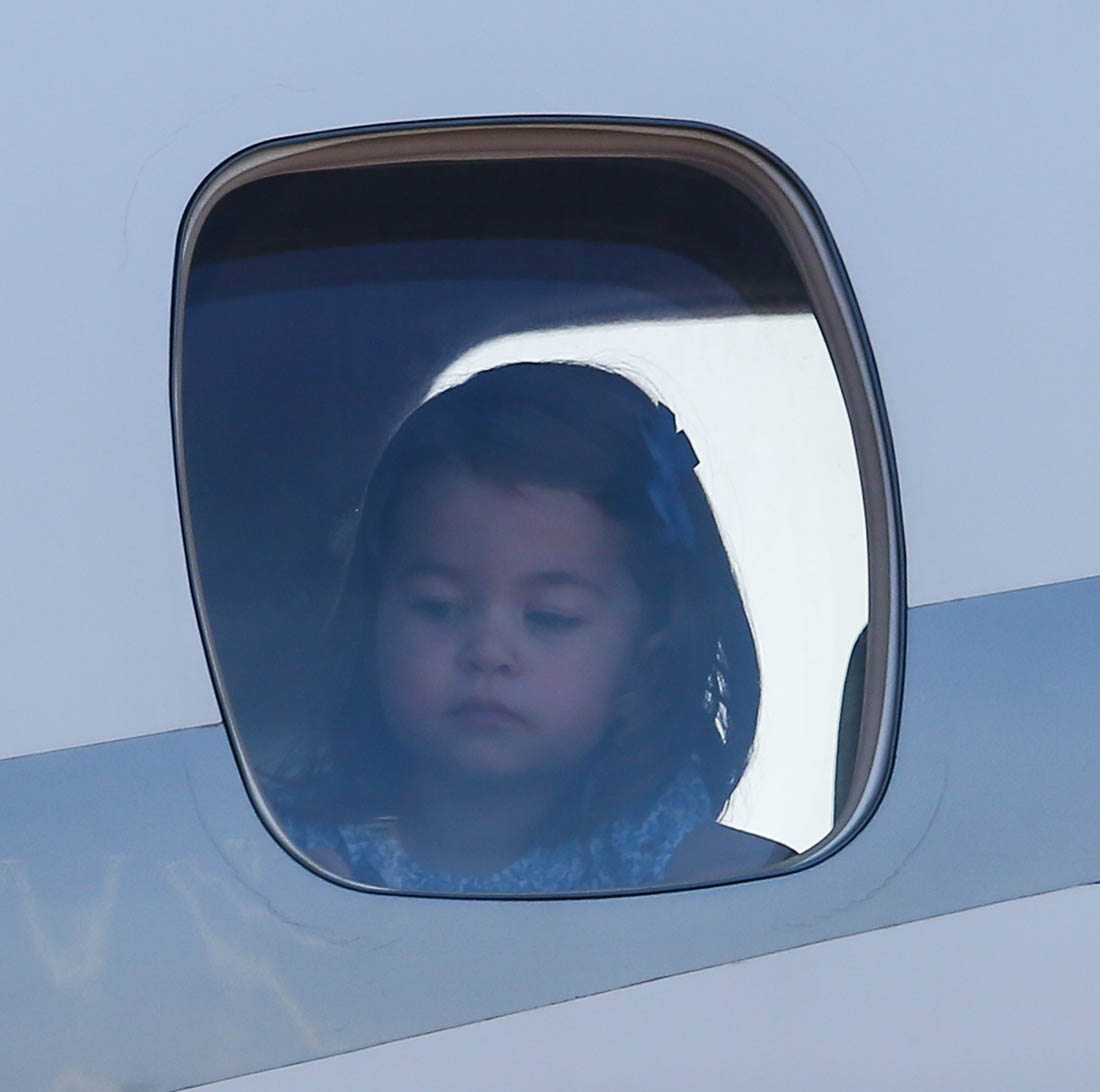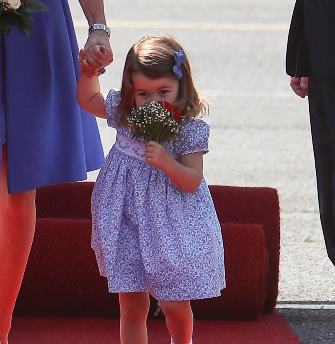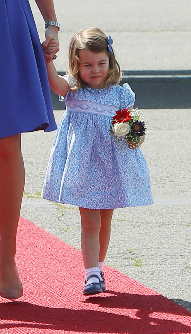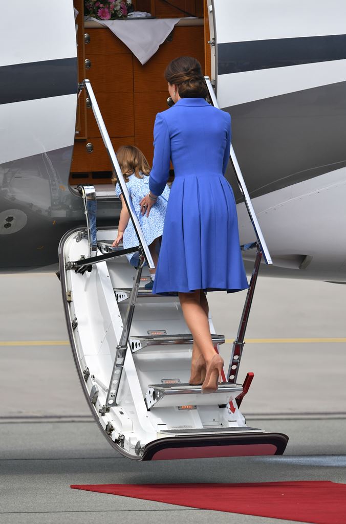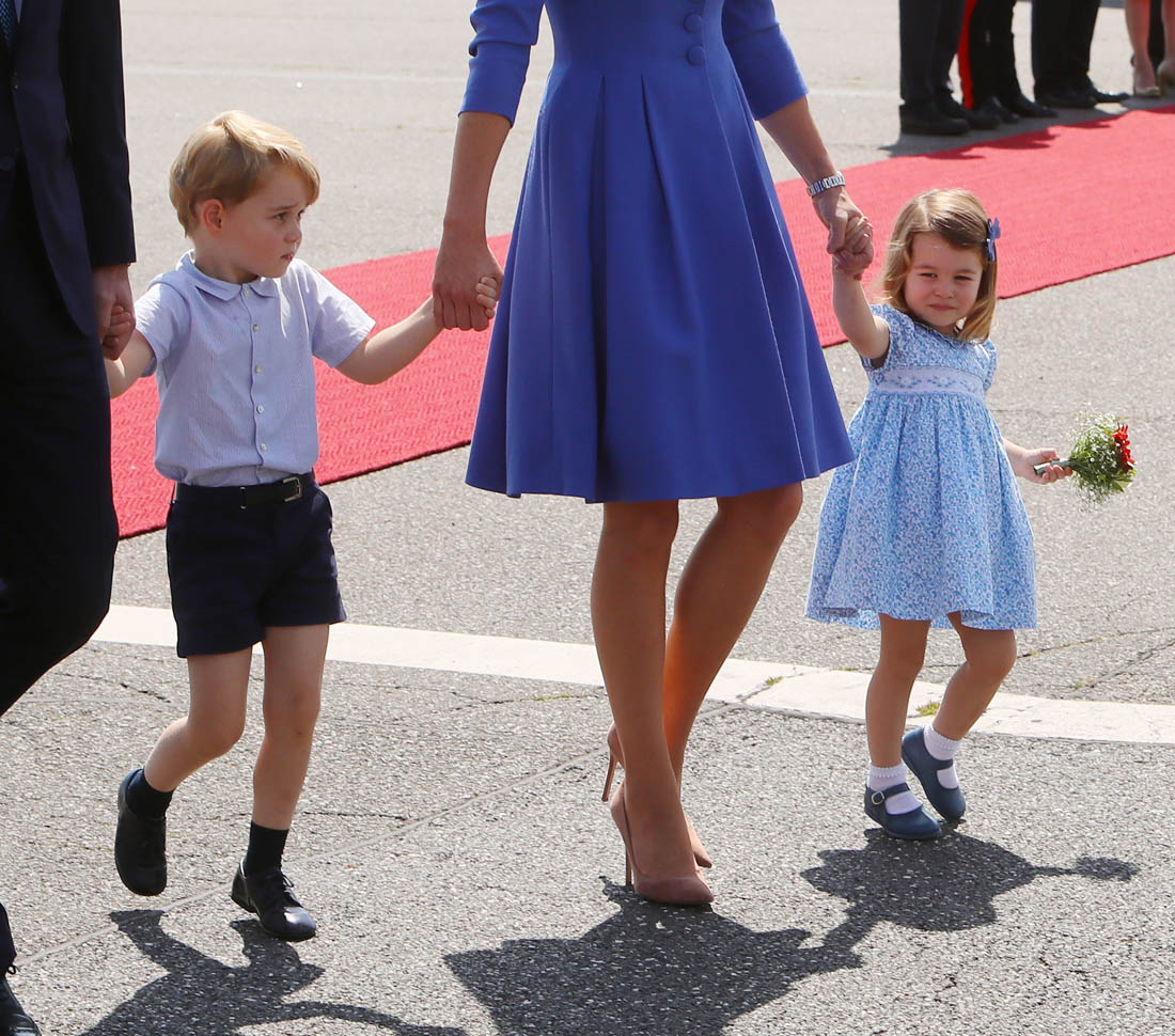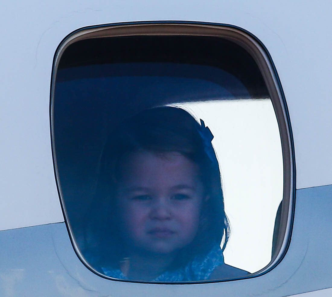 The Cambridge Four arrived in Berlin today for the second leg of their trip this week to Poland and Germany. As was the case when they touched down in Warsaw, Princess Charlotte seemed excited by the adventure, happily smiling for the crowds, and she looks curious too, as you can see her looking up from time to time to ask her mother questions. At least that’s how I’m reading the photos. She’s also eager to try – check out this shot of her climbing up the steps by herself.