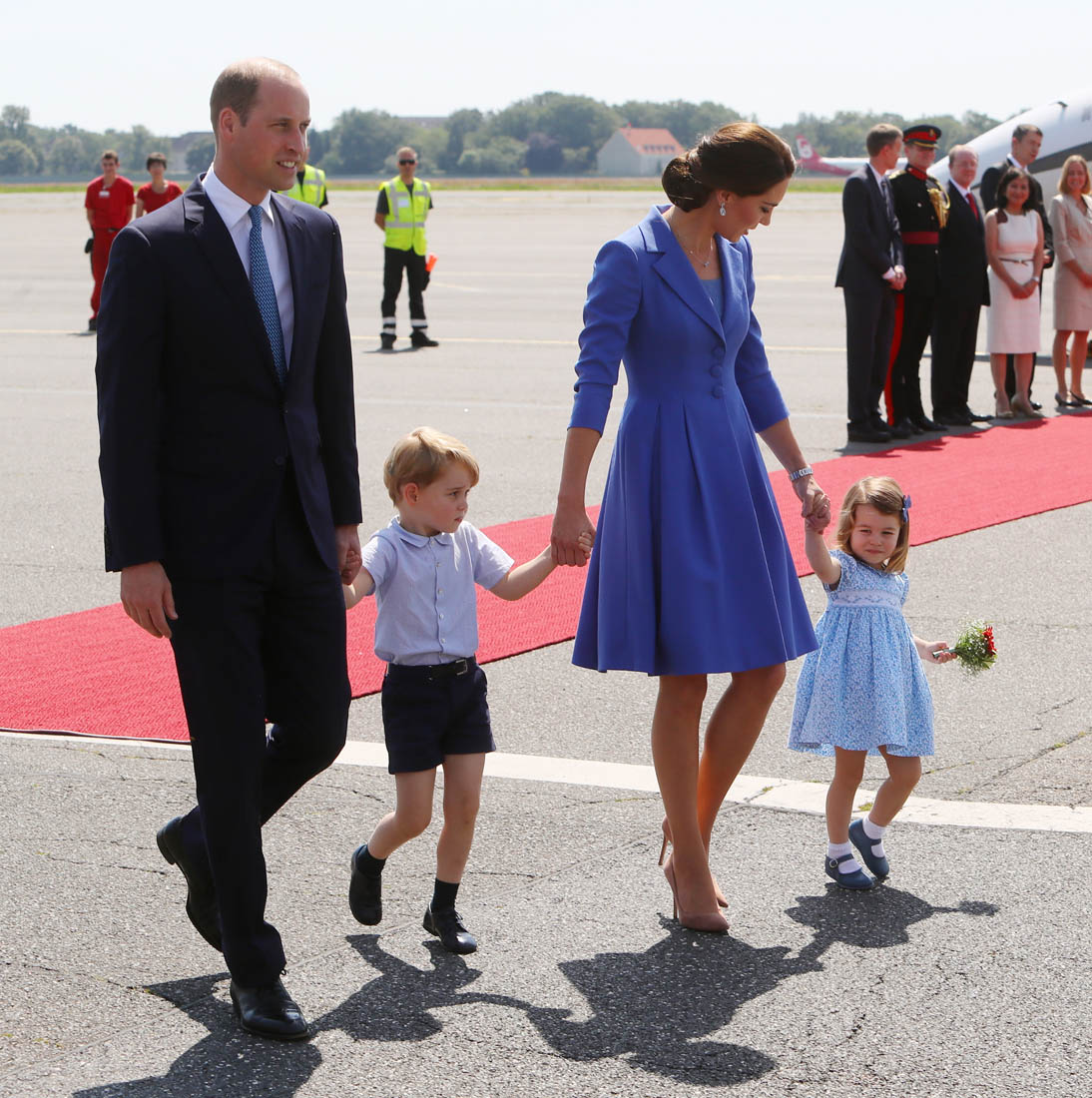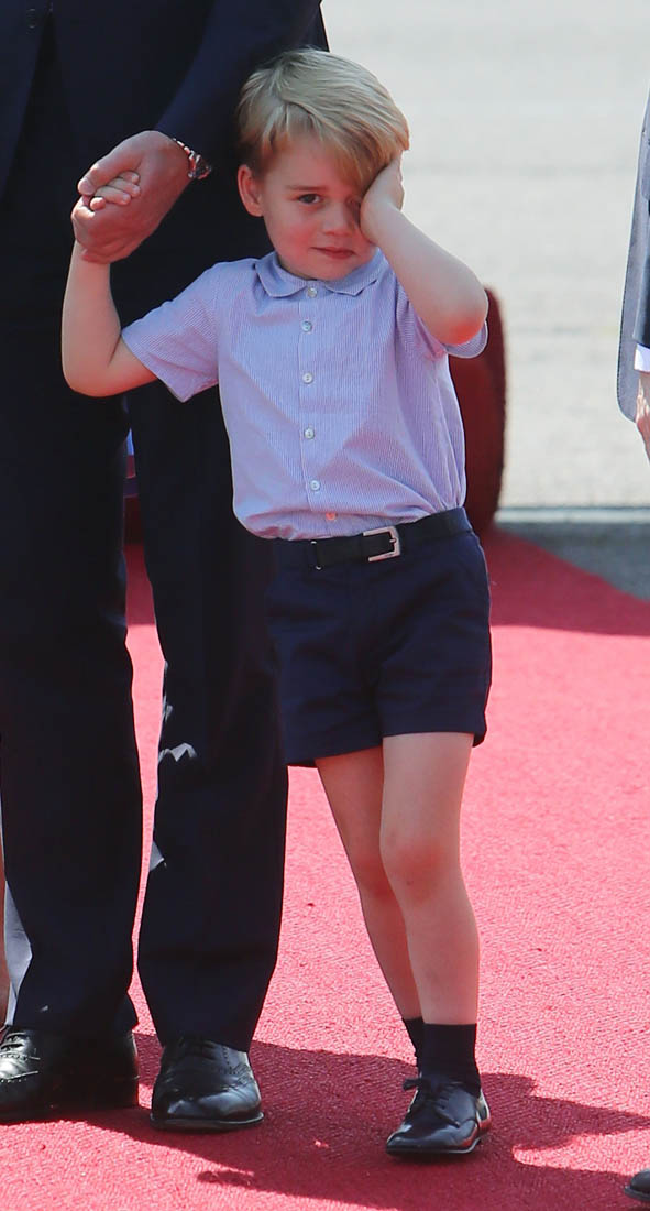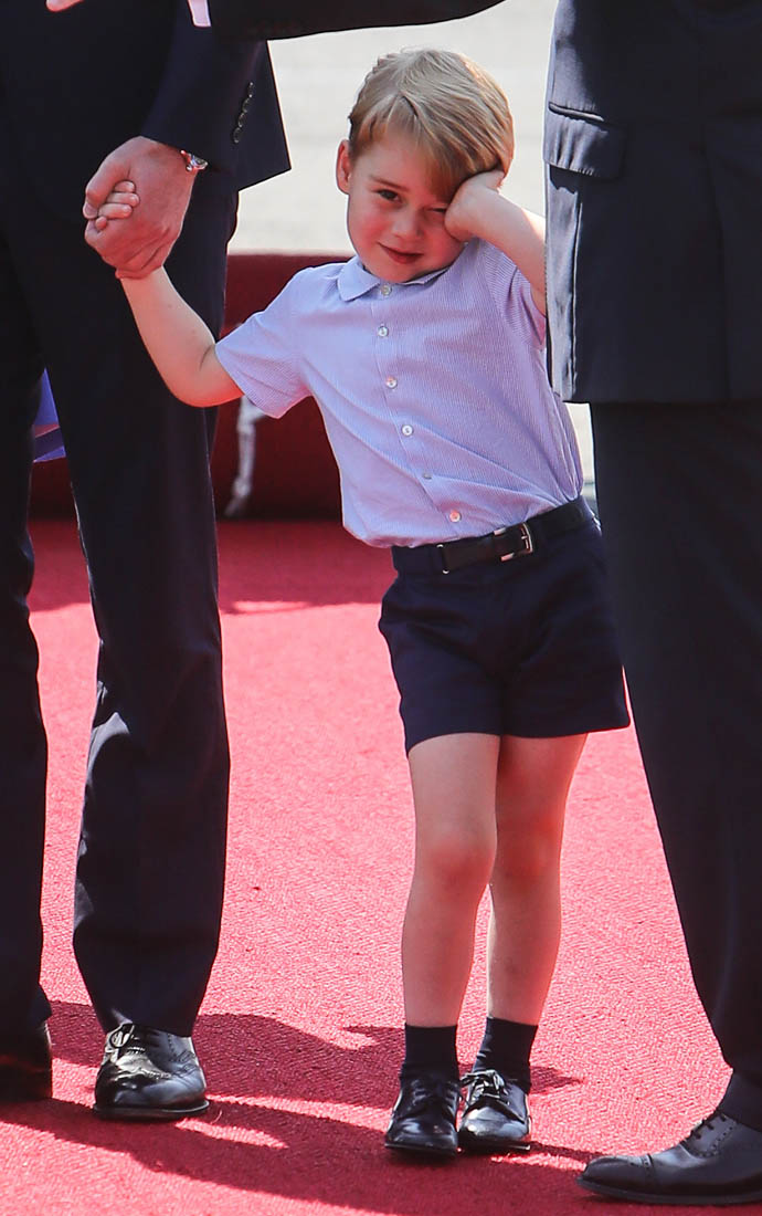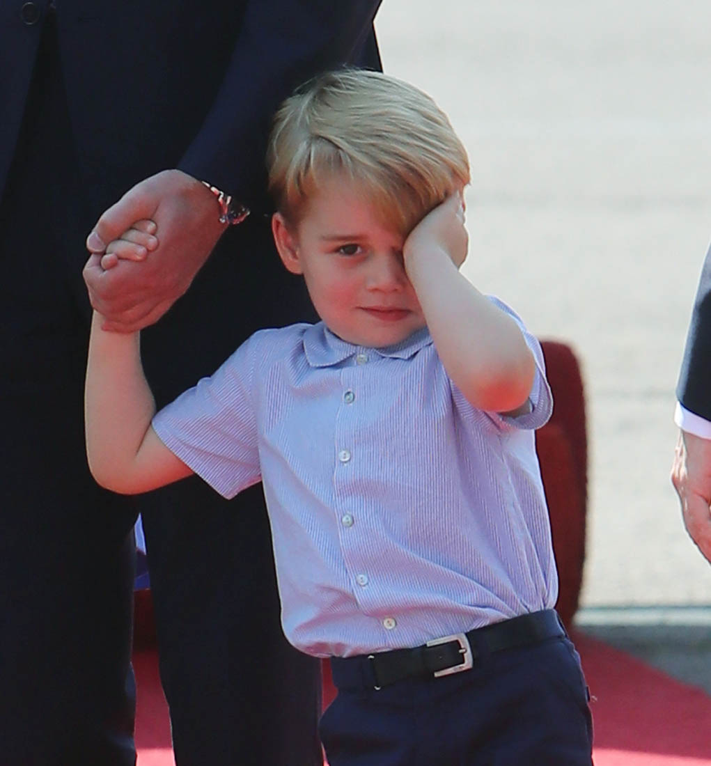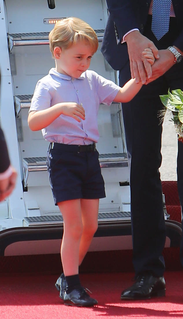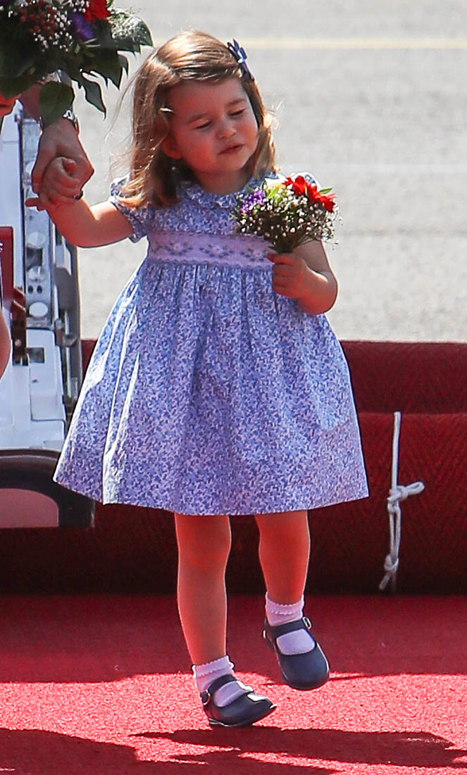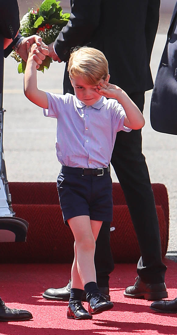 The Cambridge Four arrived in Berlin today for the second leg of their trip this week to Poland and Germany. As was the case when they touched down in Warsaw, Princess Charlotte seemed excited by the adventure, happily smiling for the crowds, and she looks curious too, as you can see her looking up from time to time to ask her mother questions. At least that’s how I’m reading the photos. She’s also eager to try – check out this shot of her climbing up the steps by herself.