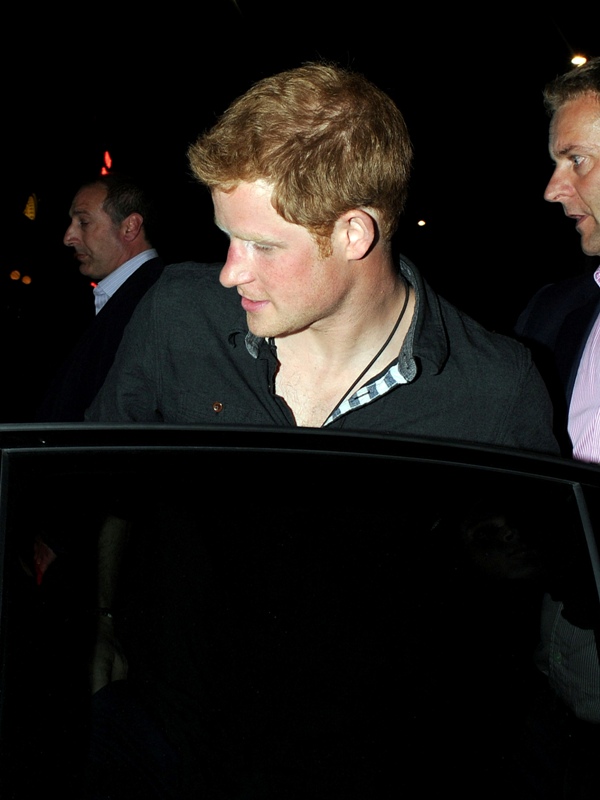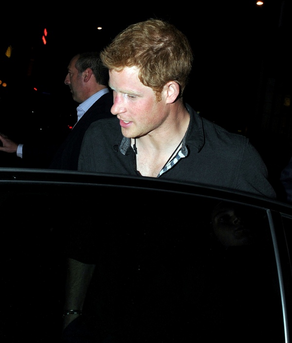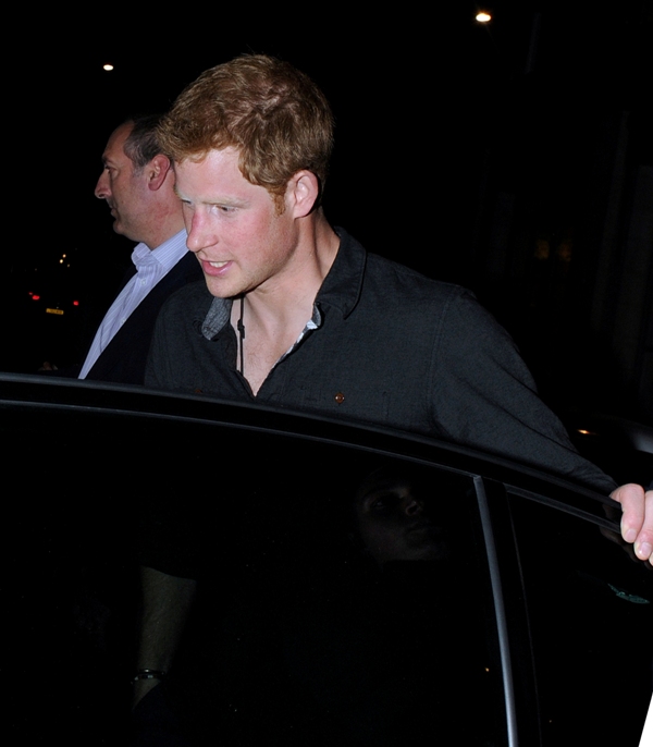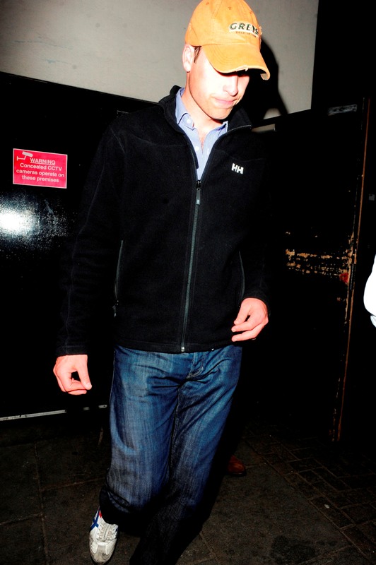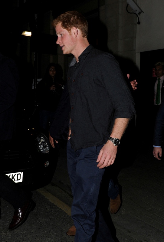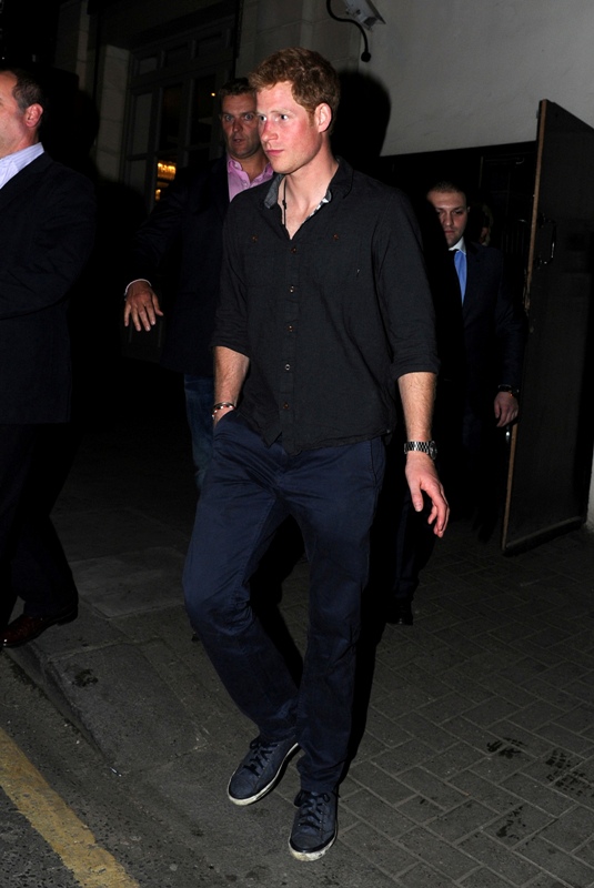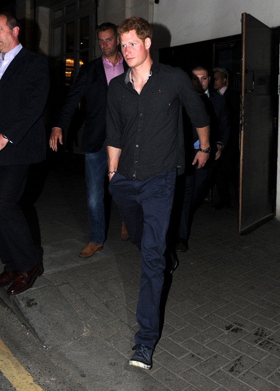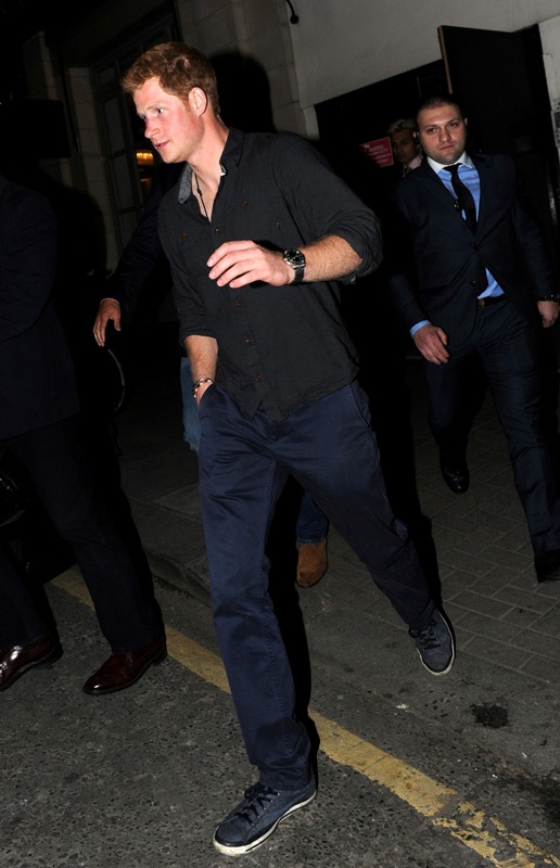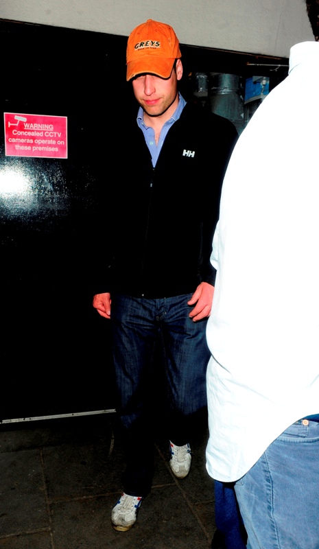 Prince William and Hot Harry were at a stag the other night for their friend, yet another friend with a stick-up-his-ass name: Thomas Van Straubenzee. Every letter drips money and stolen diamonds. Here’s a great graphic of the princes’ fancy friends, if you’re curious. Thomas Van Bee only gets a “3 star” posh rating. Maybe he’s only dripping with money and not diamonds. The royal brothers spent 5 hours at the club. It obviously wasn’t a dinner jacket kind of evening. I really like how these pants are hanging on Harry.