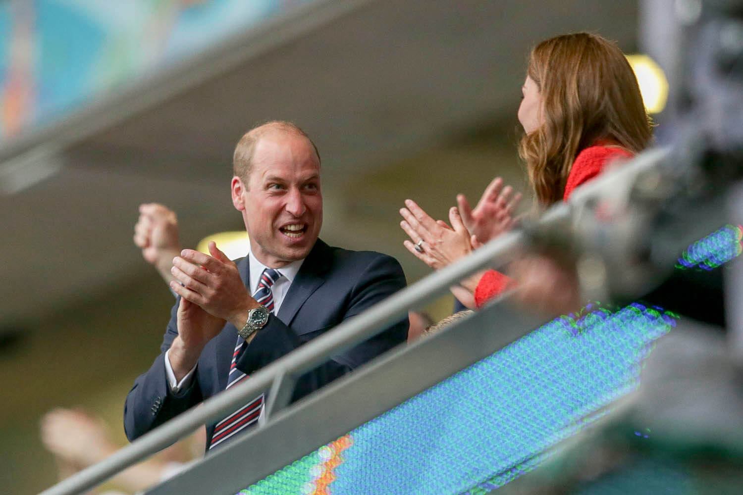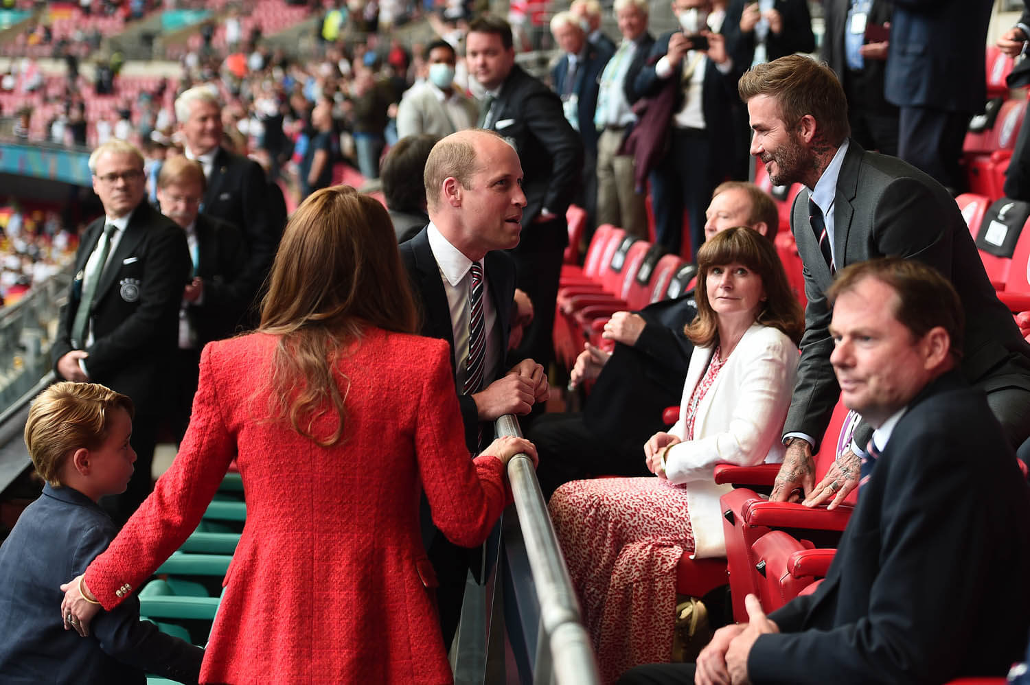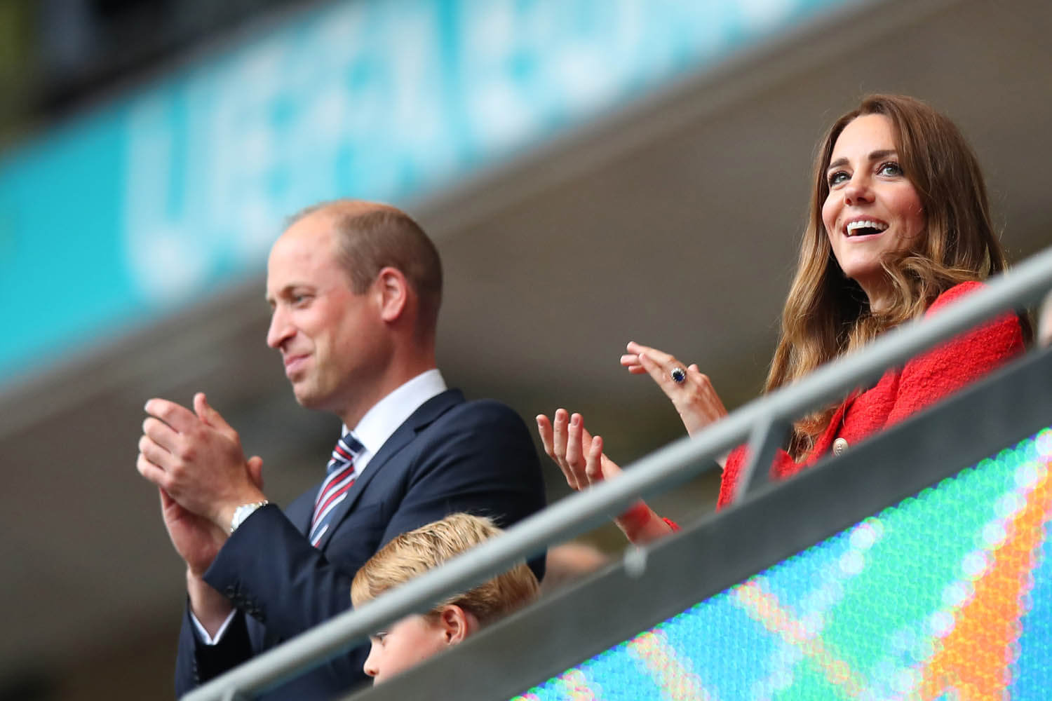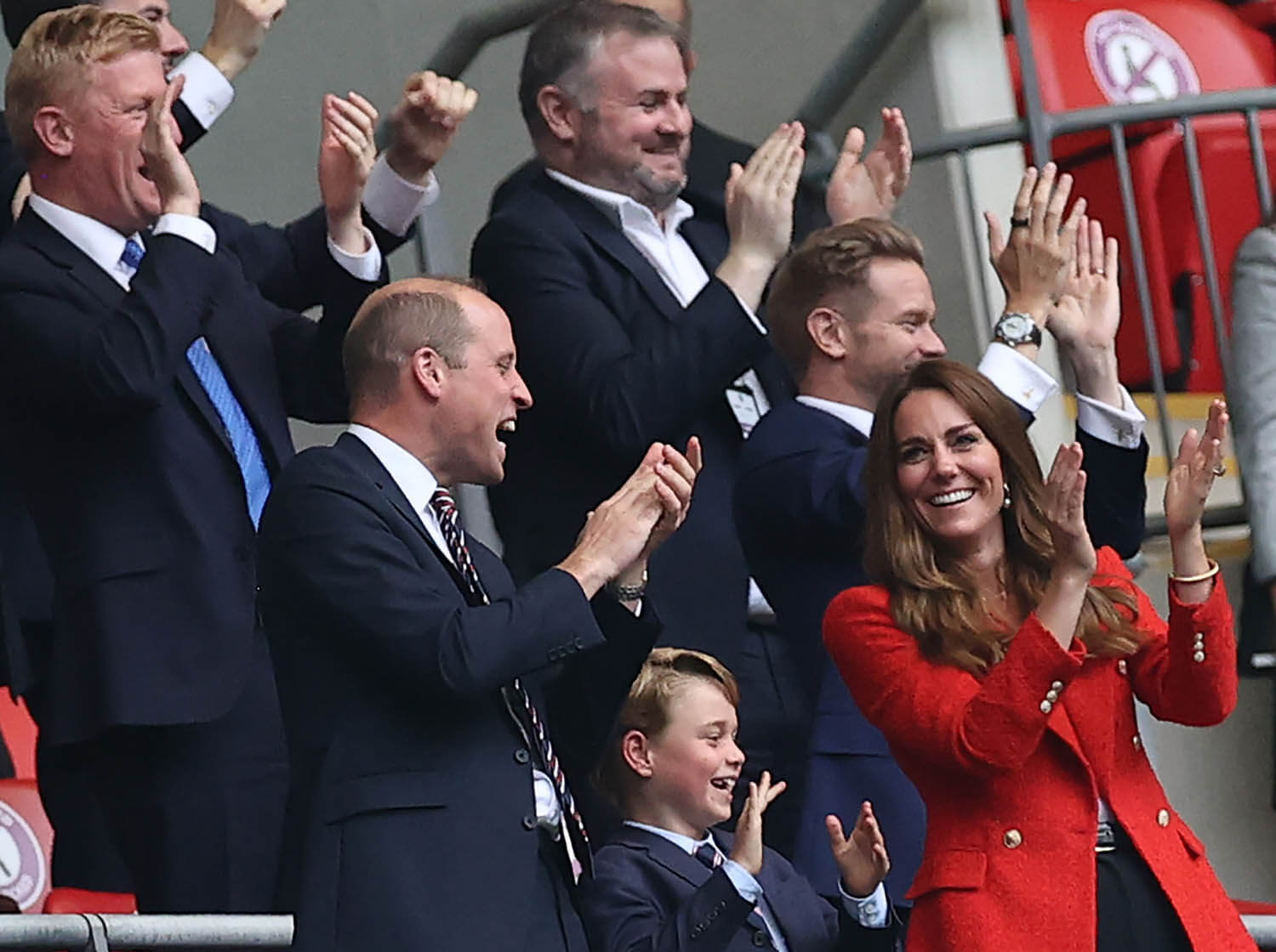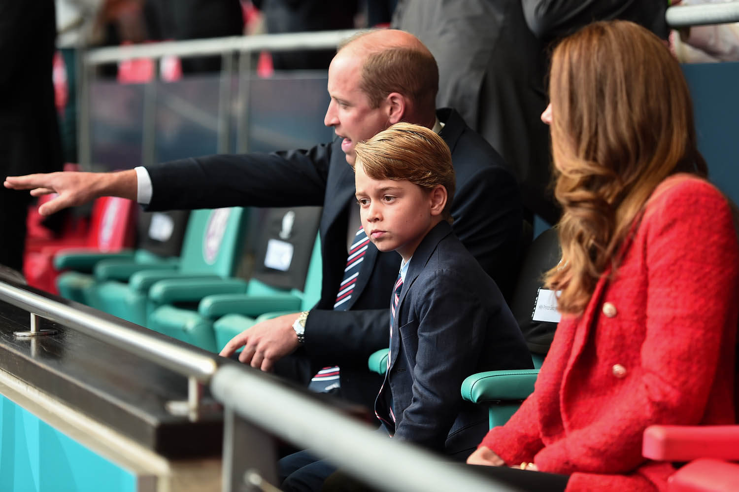 On that note, Prince William, a lifelong fan of football and the President of the Football Association was in the royal box yesterday with Kate and Big G. At one point, William was so jacked, he was seen on the broadcast with his arms up in the air, fist pumping, royal protocol be damned, which is pretty much what the announcers said in the moment. He was also seen celebrating with George, leaning down to join in on the excitement with his son. As you can see, Big G had a big smile on his face, clearly enjoying his first big international match and the performance of his… um… future subjects.