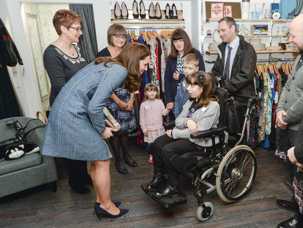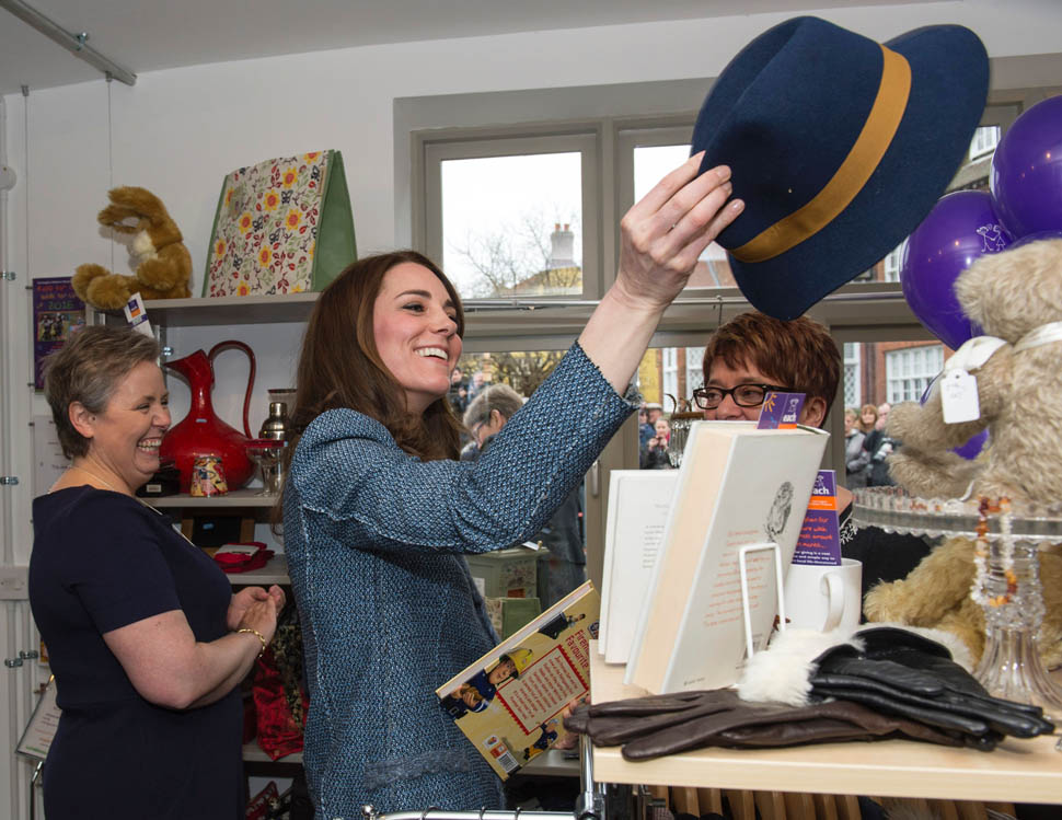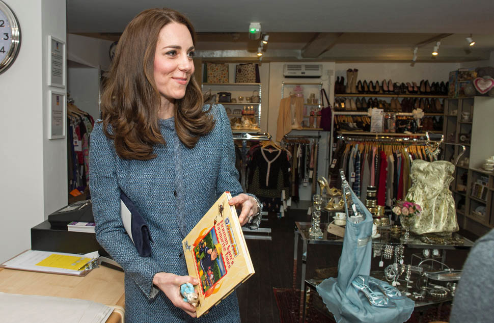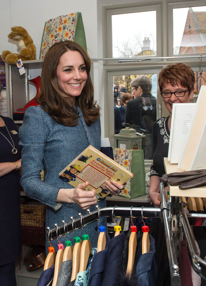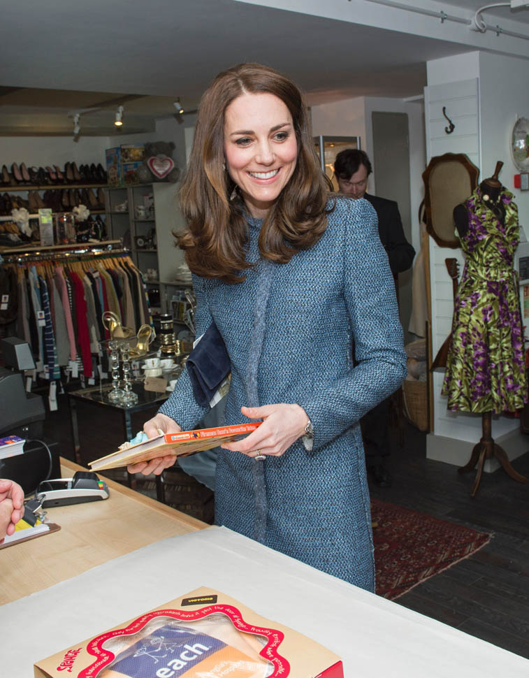 Here’s Kate today visiting a consignment shoppe that supports her charity. Apparently it’s to be her final official engagement before she and Will head to India in April.