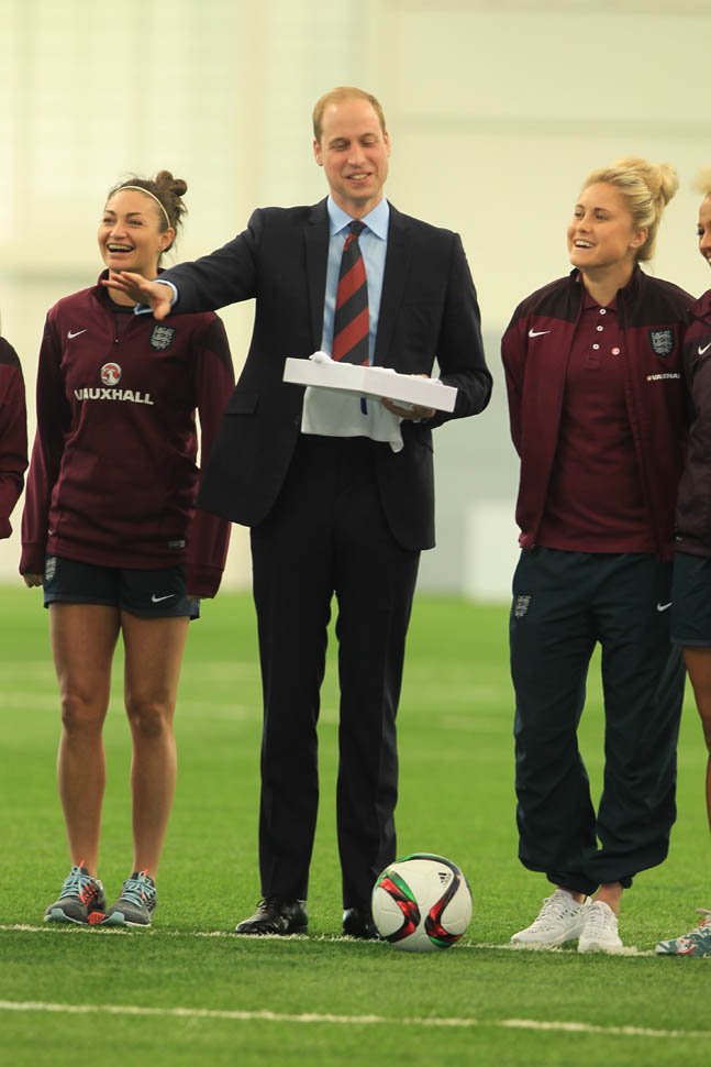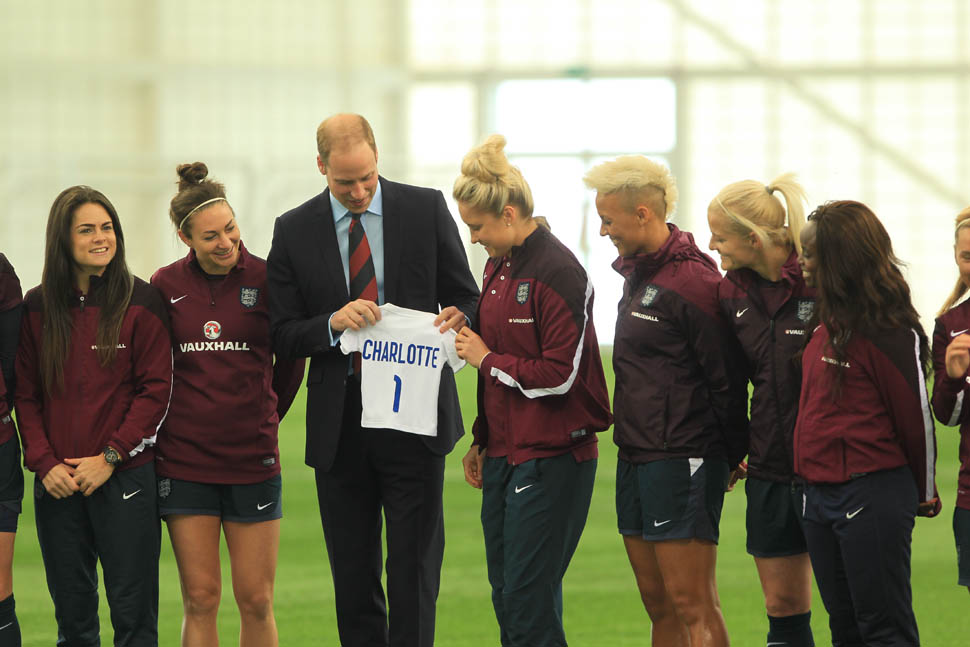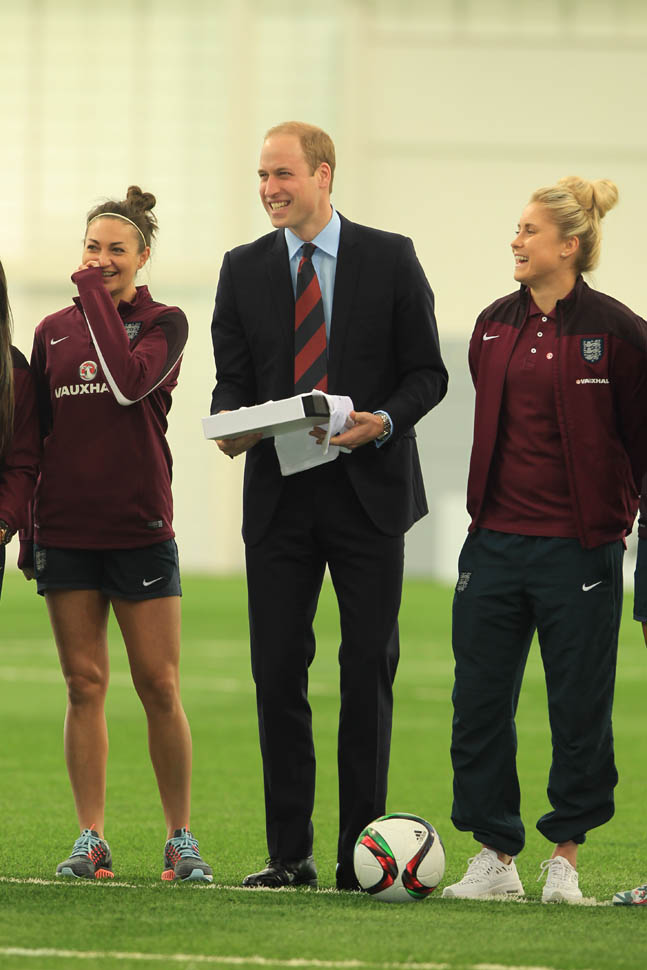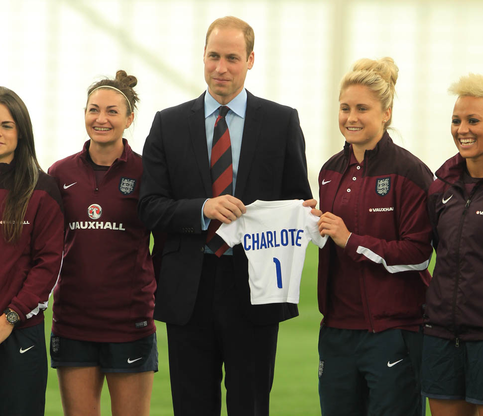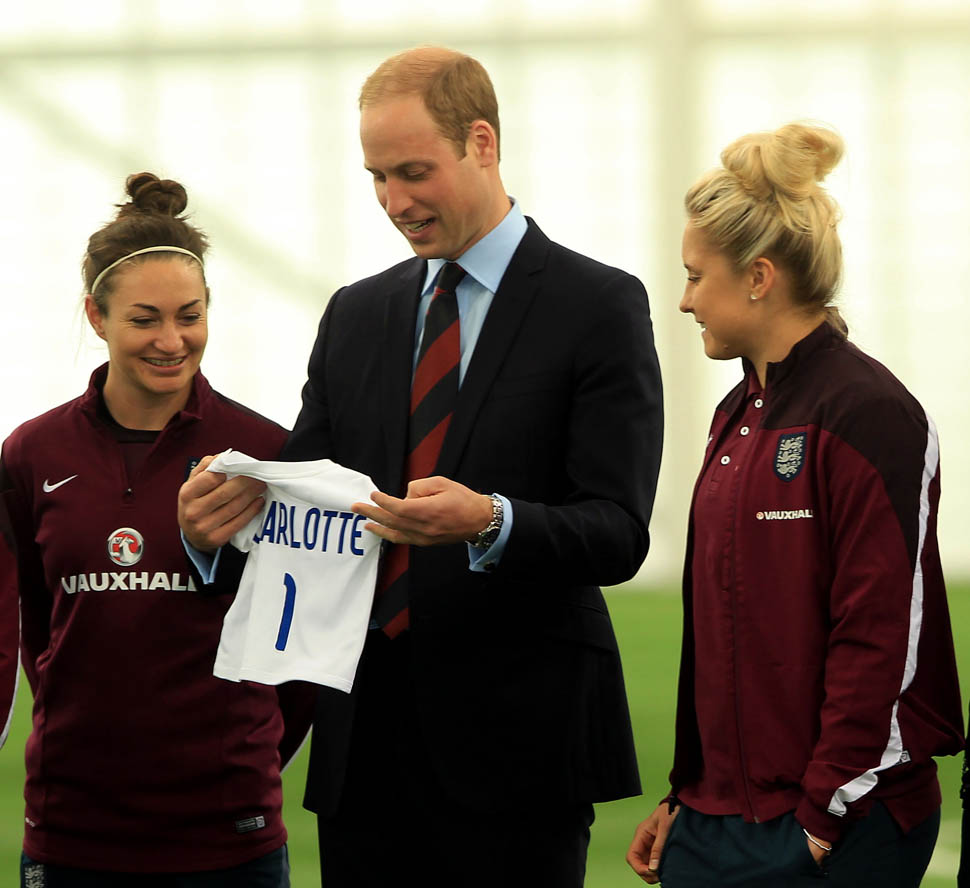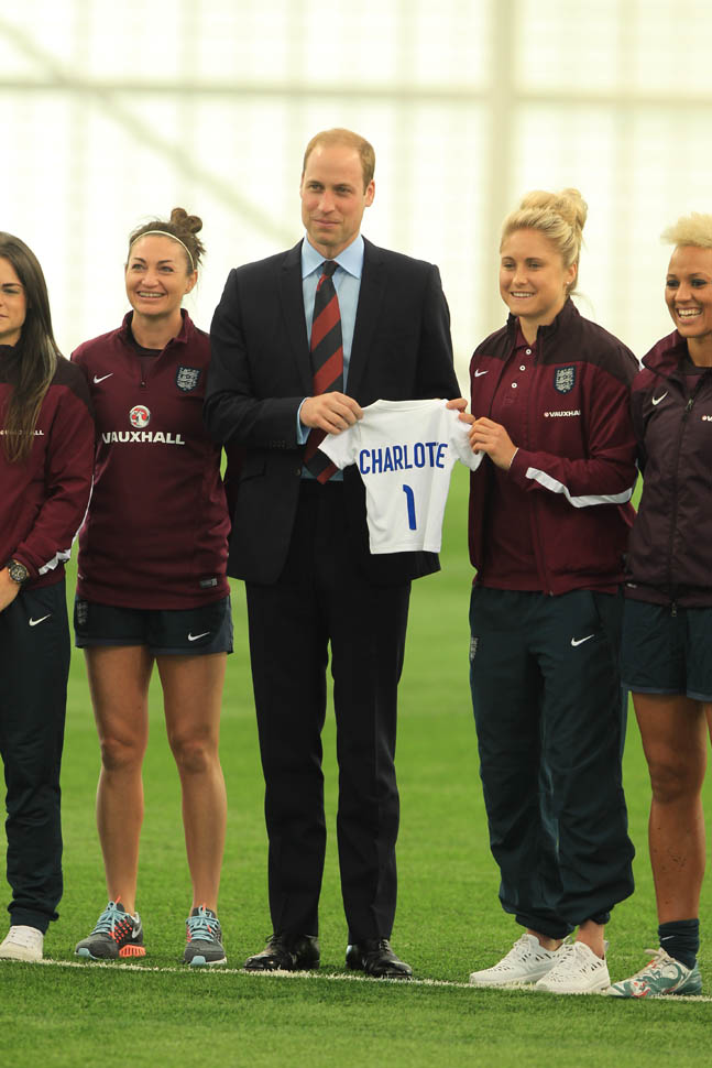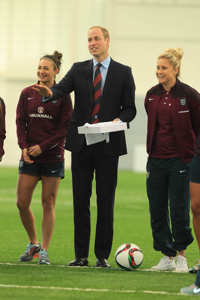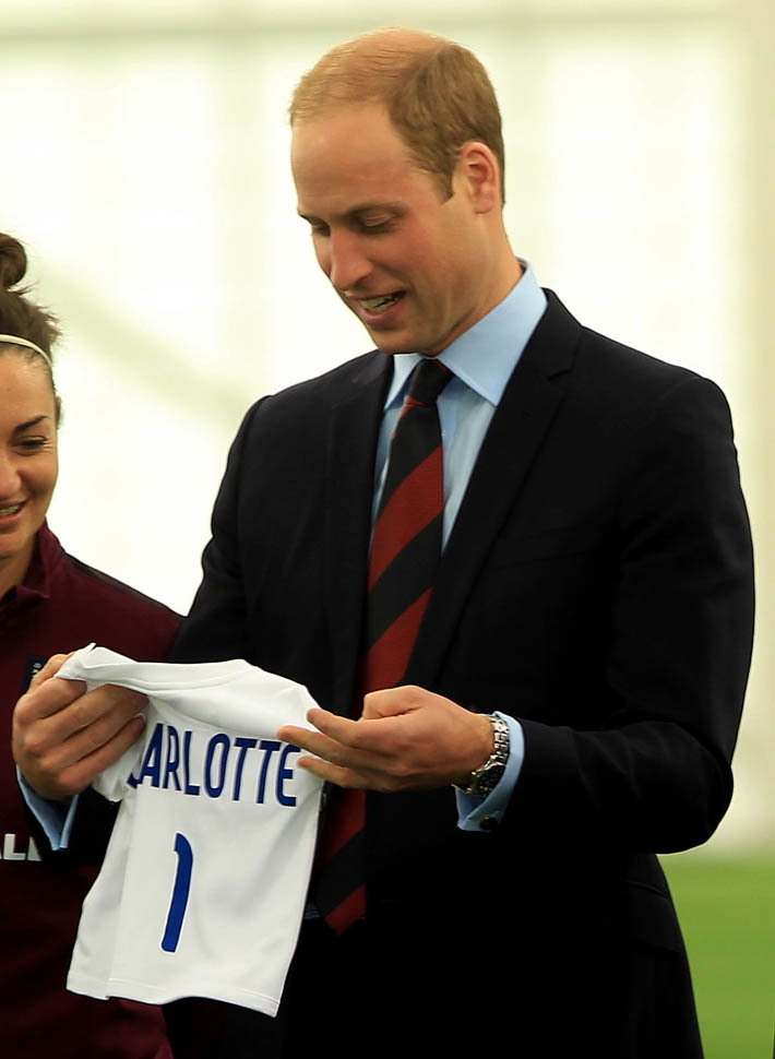 Prince William was out today in England meeting with the English Women’s football team in advance of the FIFA Women’s World Cup which is happening next month in Canada. GO CANADA! The players presented him with a baby jersey for Princess Charlotte. And apparently they talked to him about how it’s all going at home with a newborn and a two year old.