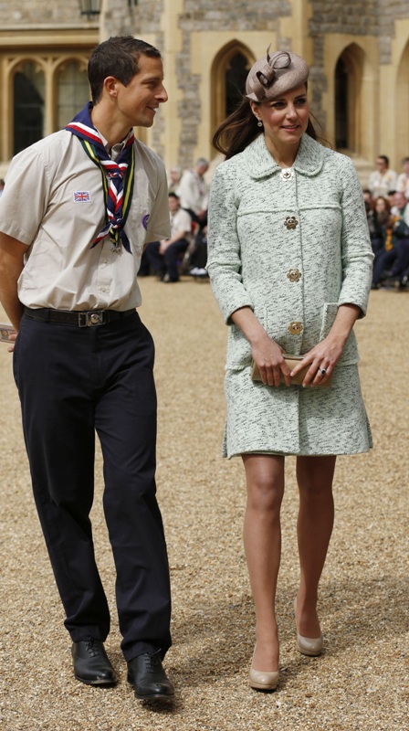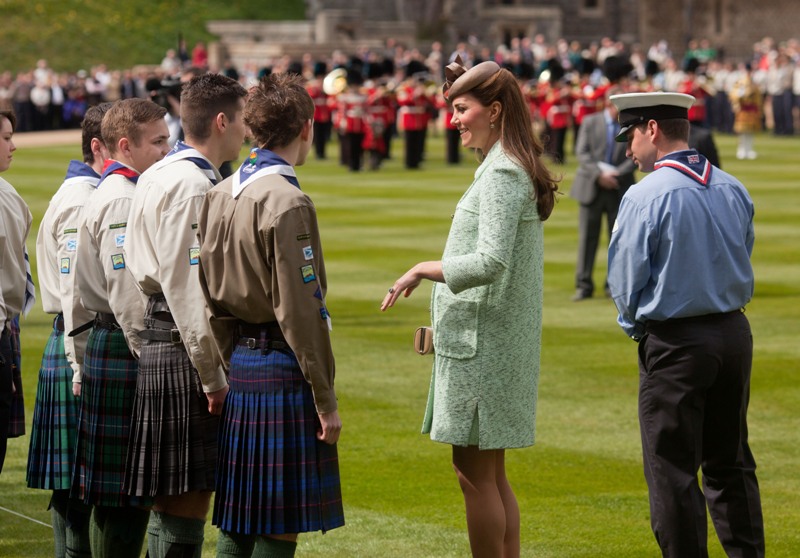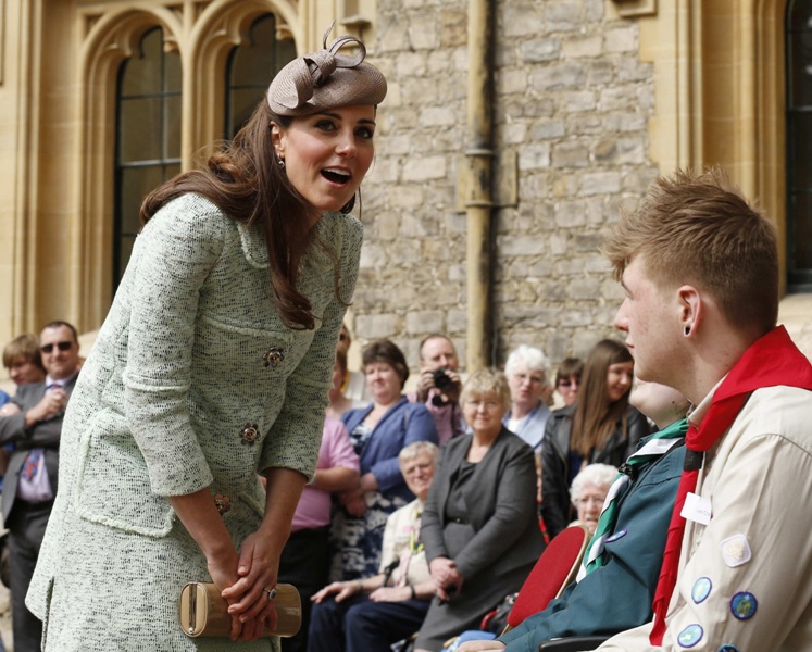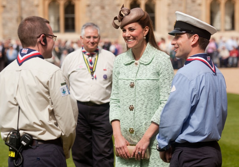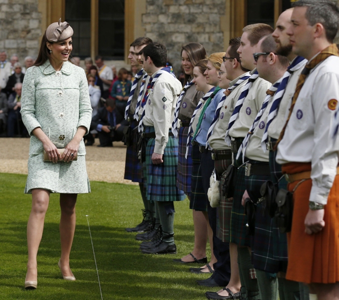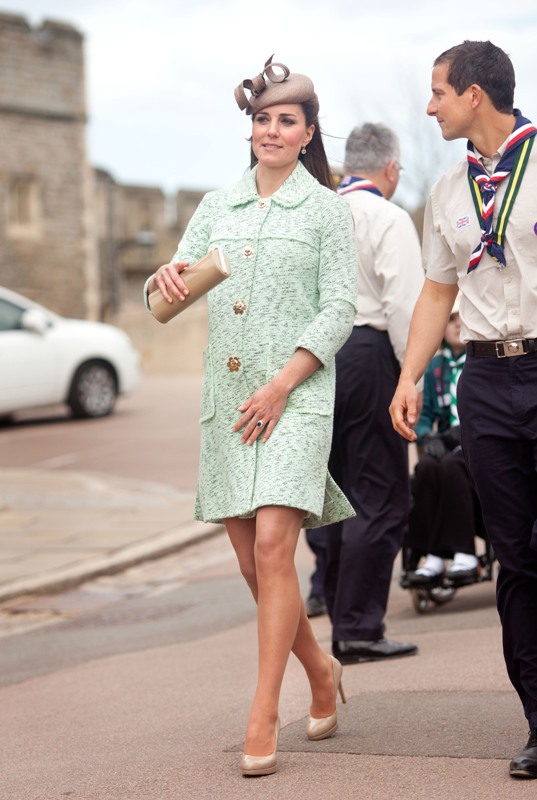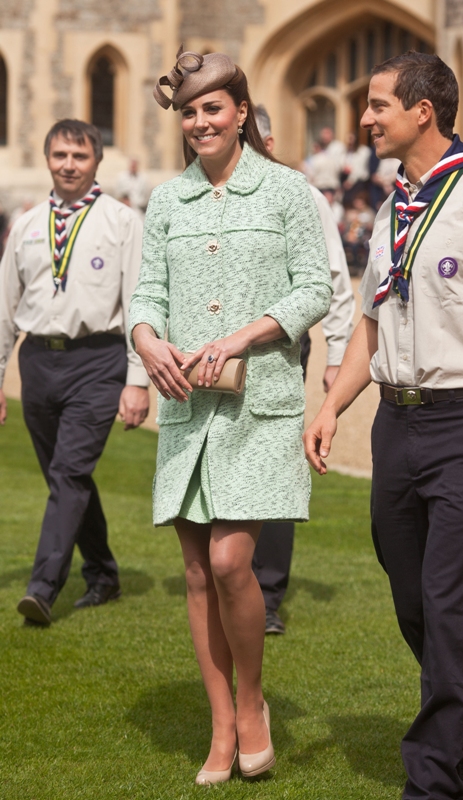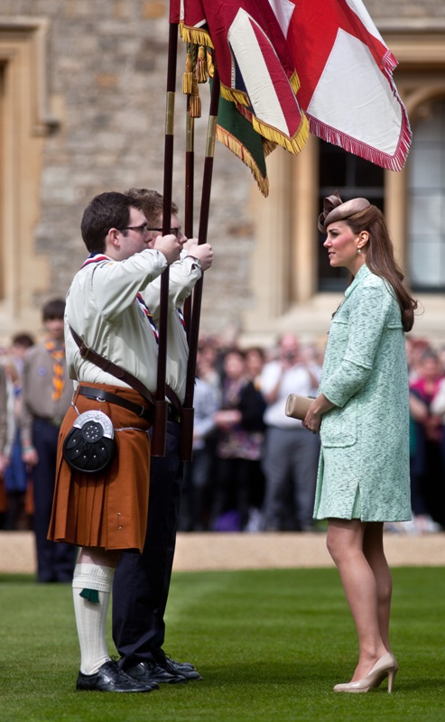 While Prince Harry was hanging out at the marathon yesterday, his sister-in-law, Katy Cambridge, spent the day with the Queen’s Scouts at Windsor Castle. She was a vision in fertile green, once again, using a short hemline to accentuate her trim legs so as to balance the bulk that’s growing above the waist.