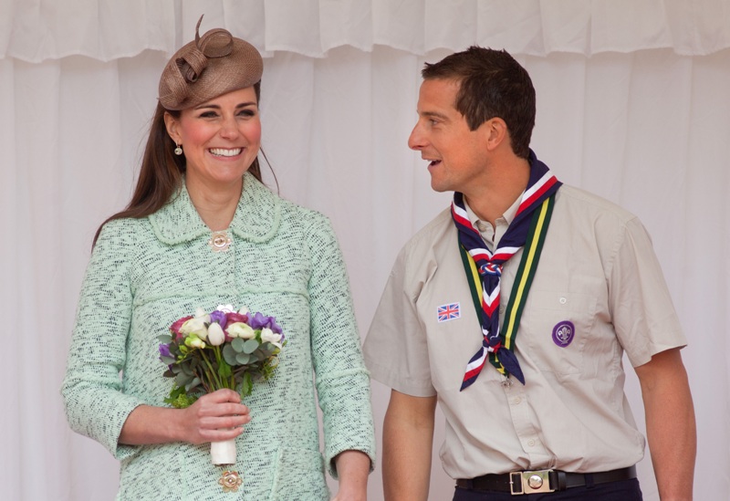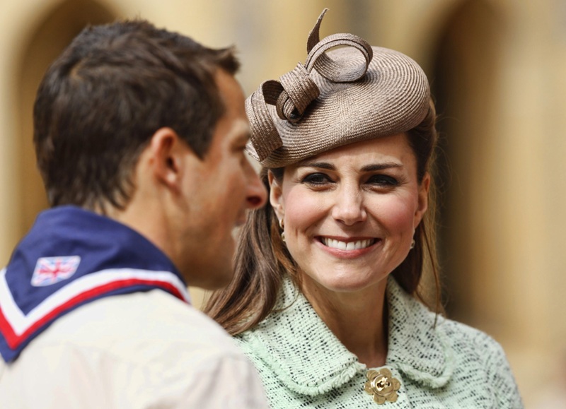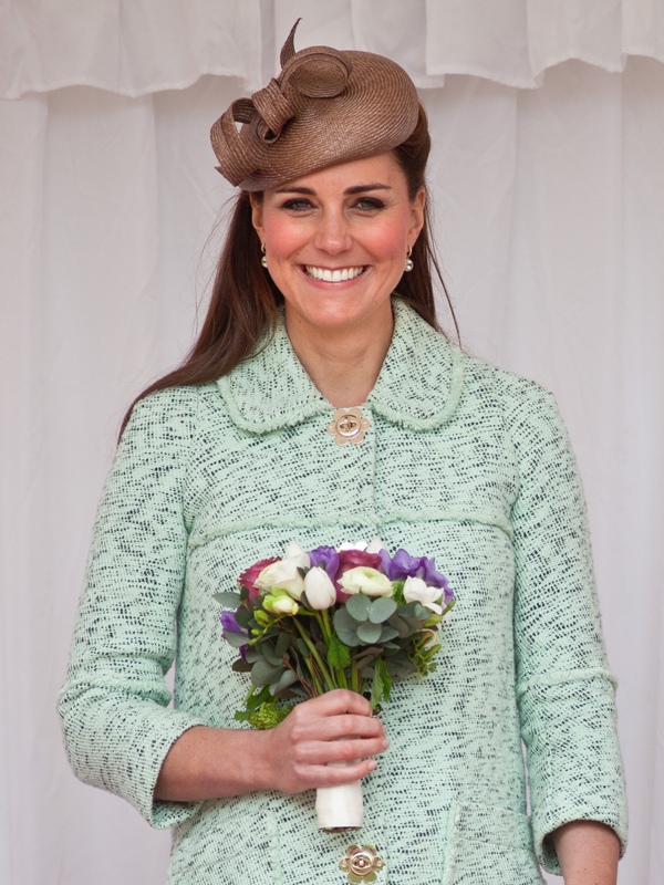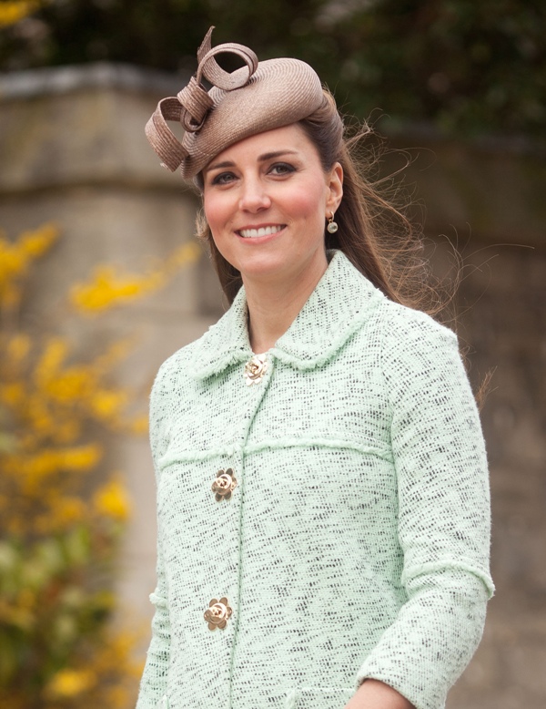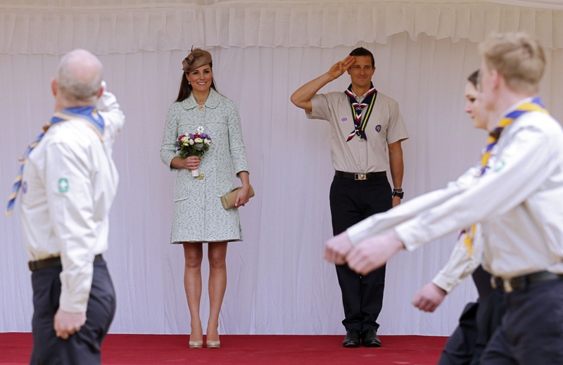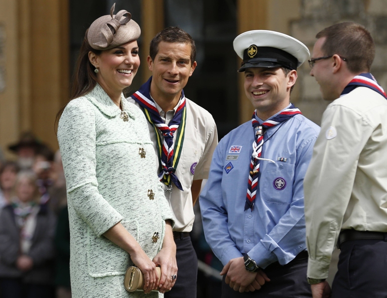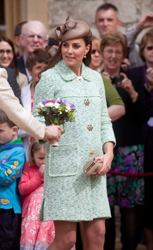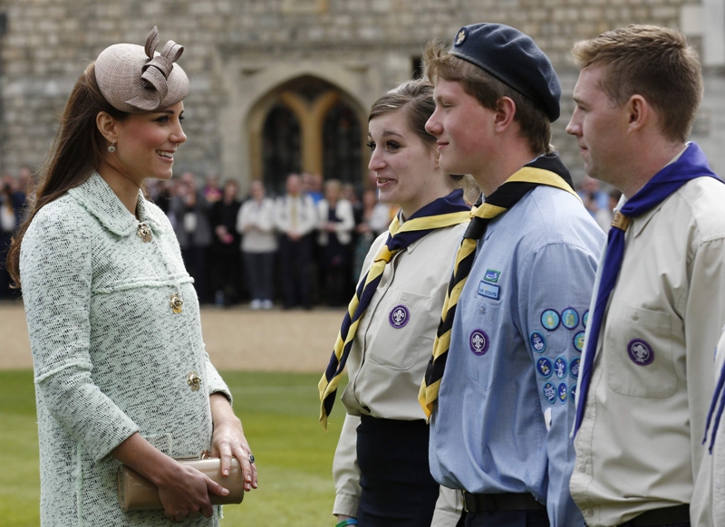 While Prince Harry was hanging out at the marathon yesterday, his sister-in-law, Katy Cambridge, spent the day with the Queen’s Scouts at Windsor Castle. She was a vision in fertile green, once again, using a short hemline to accentuate her trim legs so as to balance the bulk that’s growing above the waist.