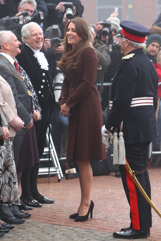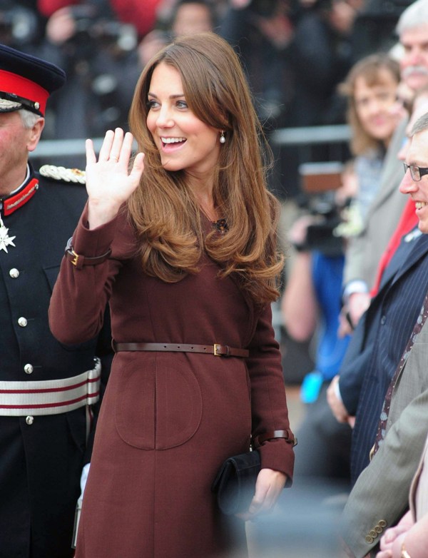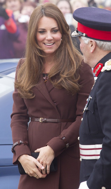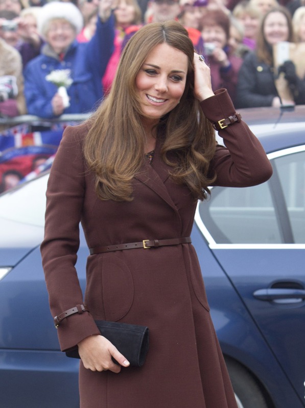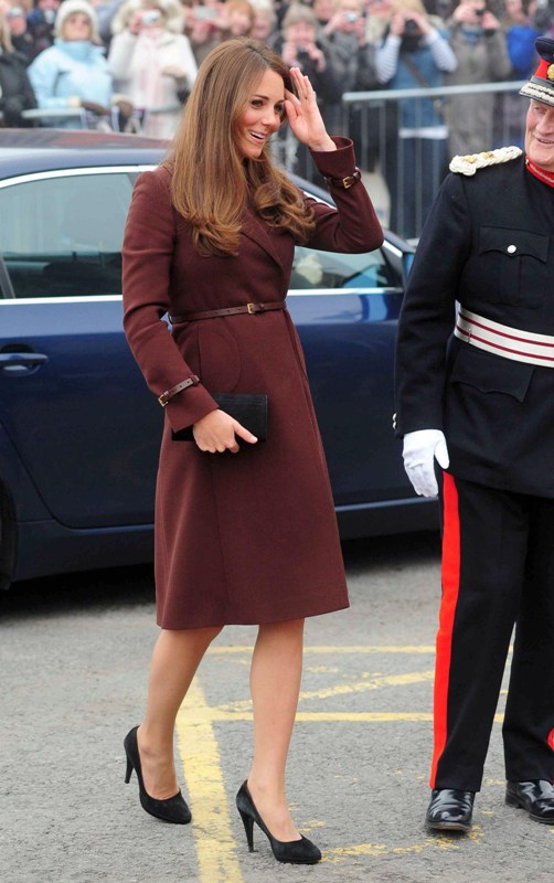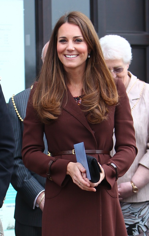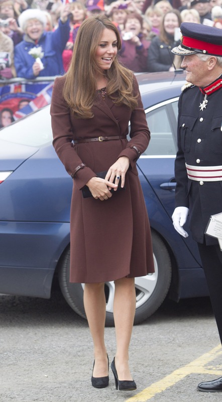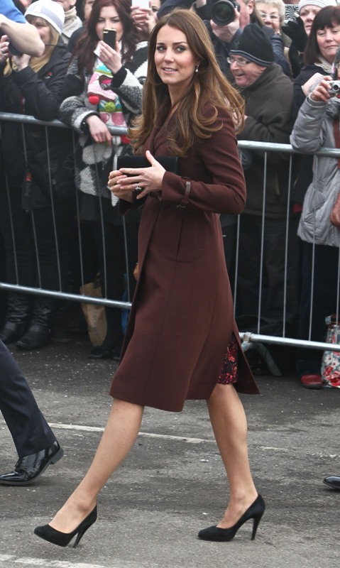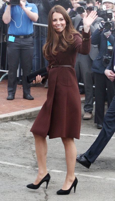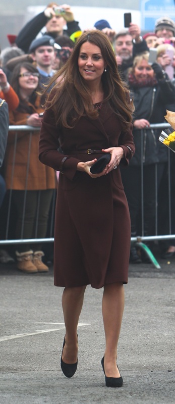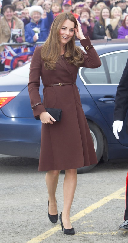 After attending a wedding with William and Harry this weekend in Switzerland, Catherine Cambridge is back in England, on official business today in Grimsby where she visited the National Fishing Heritage Centre. As expected, Kate recycled -- this Hobbs coat was previously worn last year, on Valentine’s Day, in Liverpool. Click here for a refresher. Makes sense, especially now. She’s thrifty to begin with, and I can’t imagine she’d bother with clothes she’ll wear once at that size. As for underneath, those eagle eyes at What Kate Wore have identified that it’s a pretty pleated dress by Cezanne that retails for around US$115. Click here to see. But what I really like is that she’s not ringletting her ends so much.